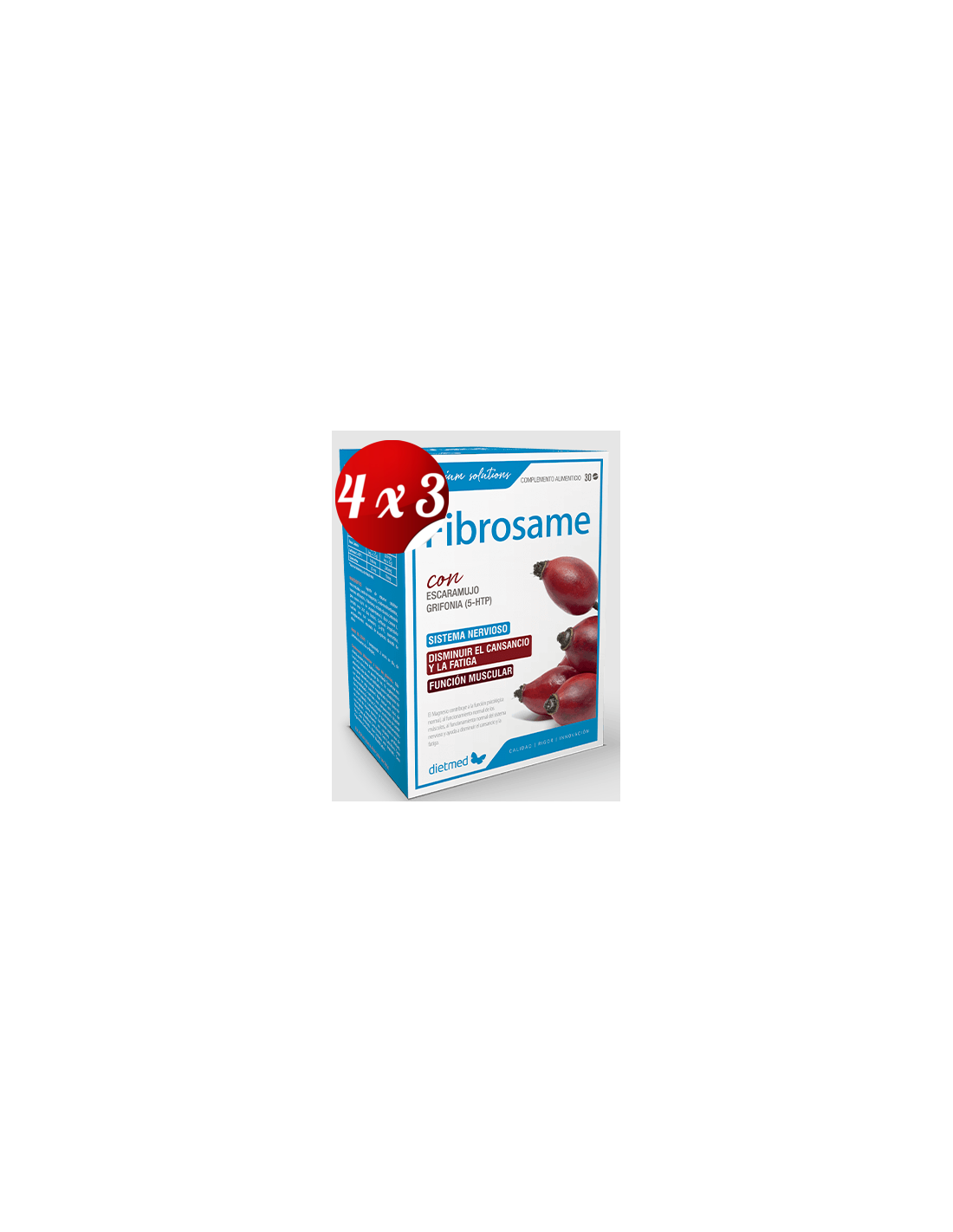 El Pack 4x3 uds Fibrosame 30Comp. de Dietmed está diseñado para personas que buscan un complemento alimenticio que apoye el bienestar general. Este formato múltiple facilita la continuidad en el consumo, ideal para quienes desean mantener una rutina constante.