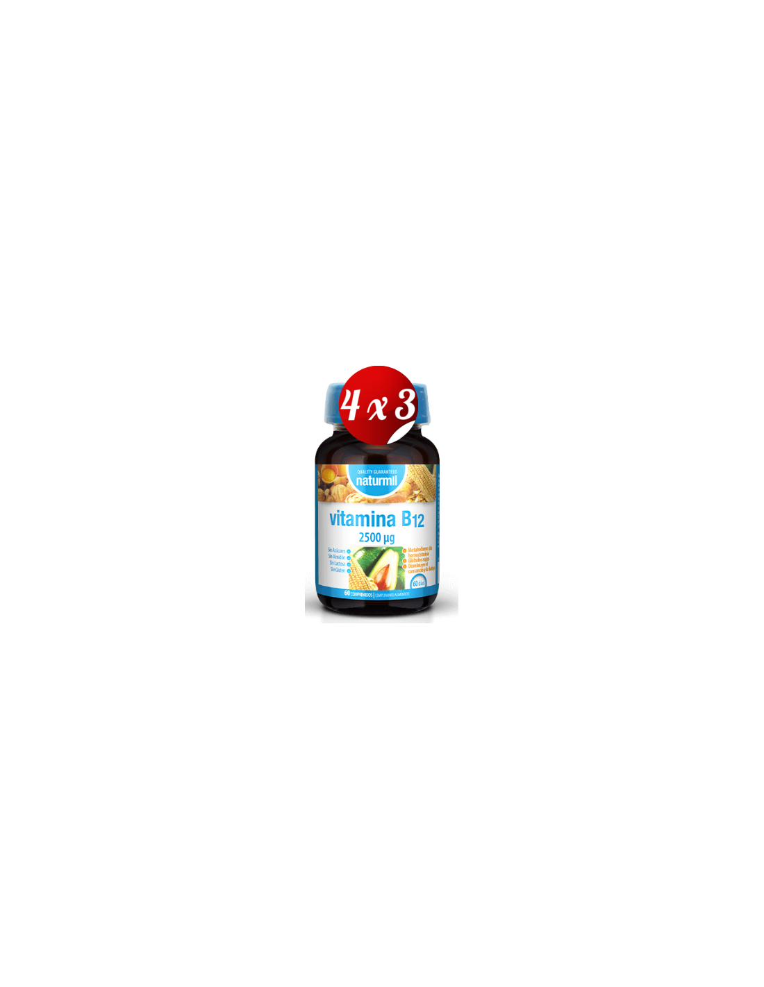 - Cada comprimido aporta 2500 µg de vitamina B12, contribuyendo a la producción normal de energía a nivel celular.