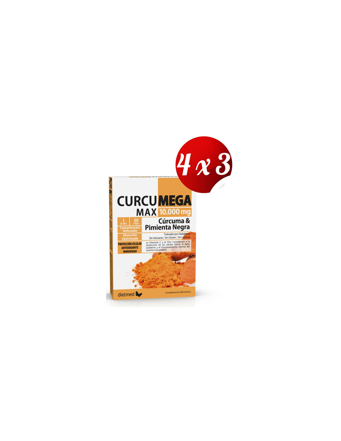 El Pack 4x3 uds Curcumega Max 30Cap. de Dietmed está diseñado para personas que buscan complementar su dieta con ingredientes naturales que apoyan el bienestar general. Este pack ofrece una presentación práctica para quienes desean mantener una rutina constante de suplementación.