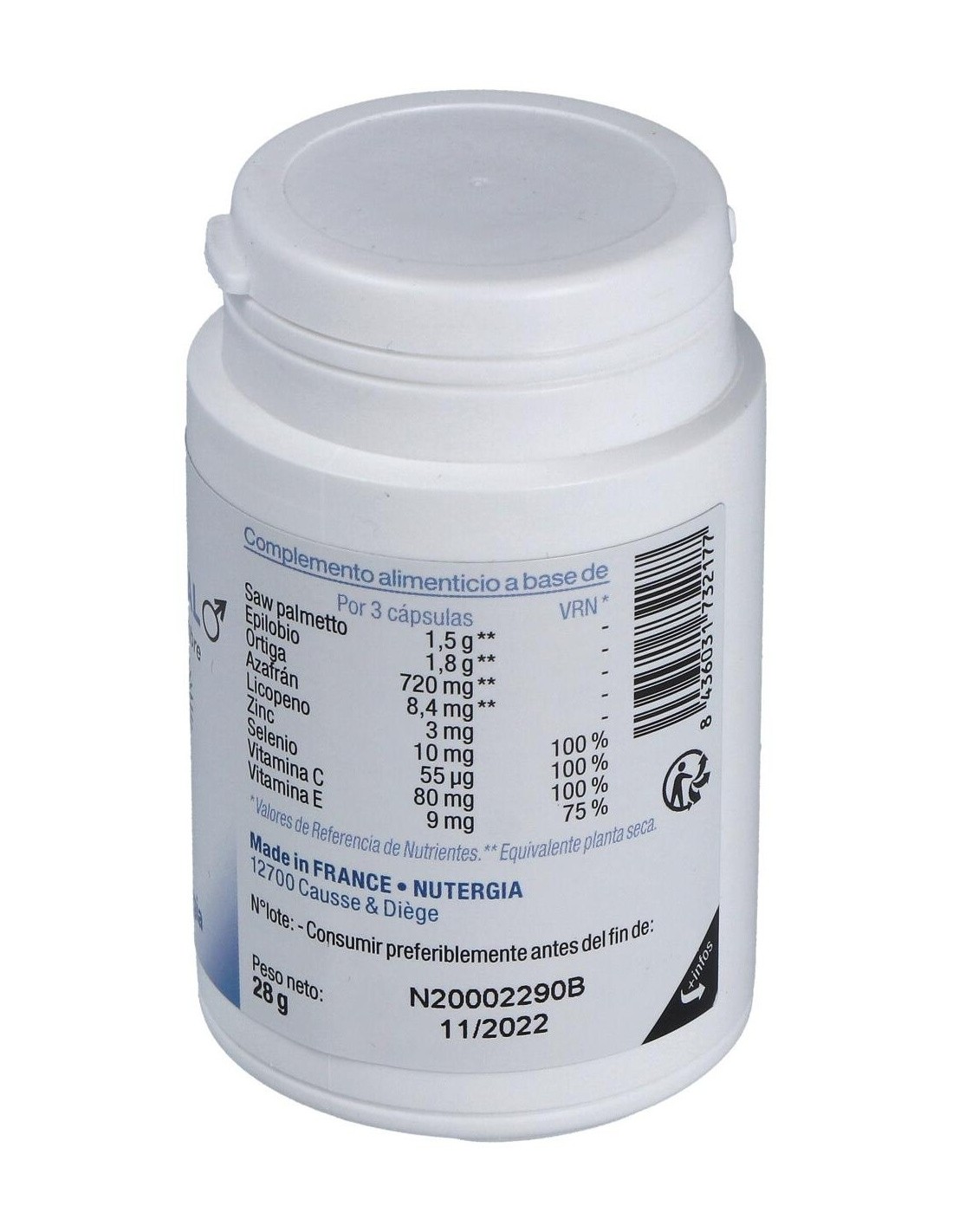 Fórmula única de 9 activos para los hombres de más de 45 años. Contiene una asociación de plantas y activos vegetales, entre ellas el Saw palmetto, el Epilobio, la Ortiga y el Azafrán, que cubre 3 grandes esferas de acción para el bienestar masculino: próstata y funciones urinarias, estrés oxidativo y libido.