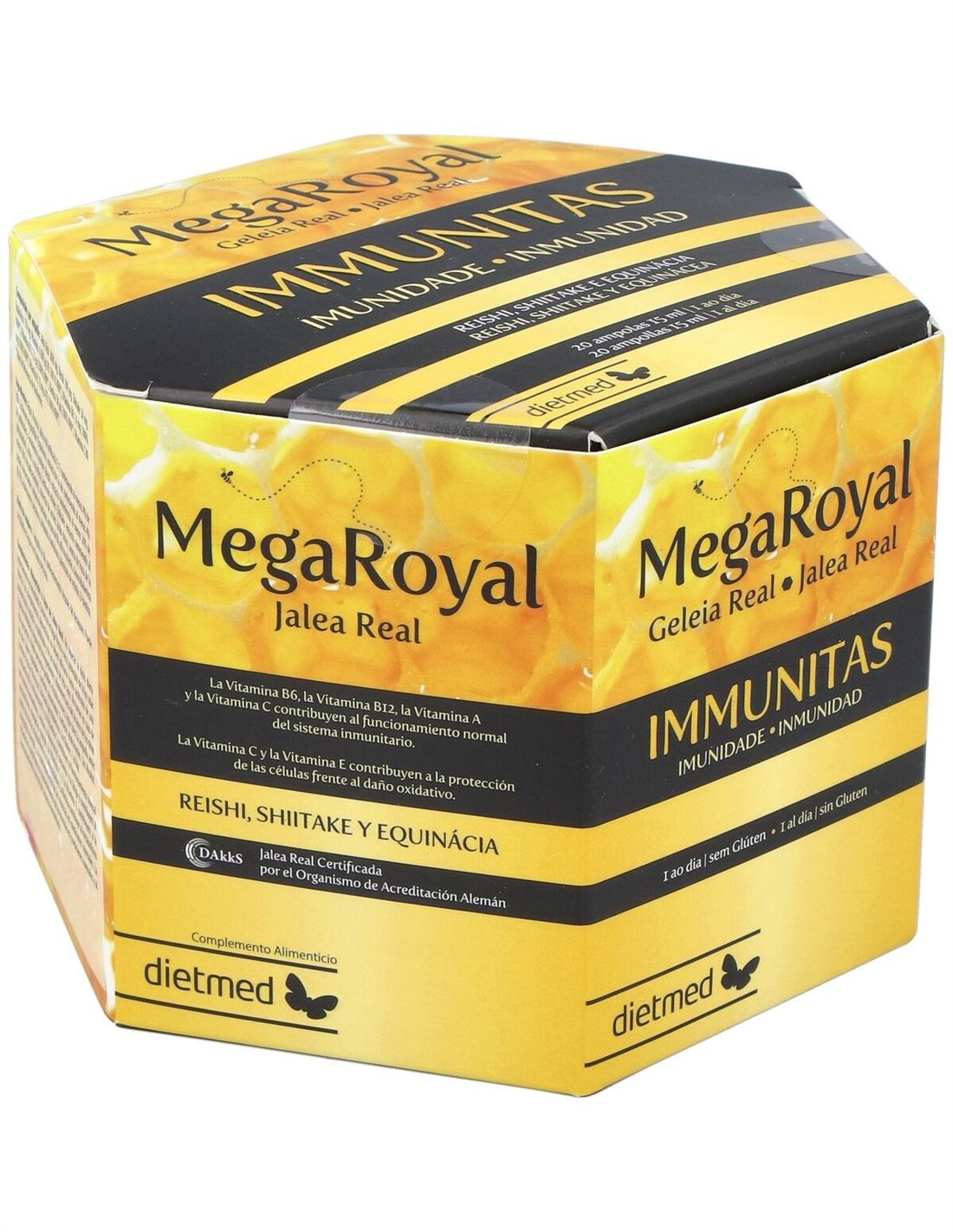 Megaroyal Immunitas 20Amp. de Dietmed es un complemento alimenticio diseñado para personas que buscan apoyar su bienestar diario mediante una fórmula equilibrada. Es adecuado para quienes desean mantener un estilo de vida activo y cuidar su salud de manera complementaria.