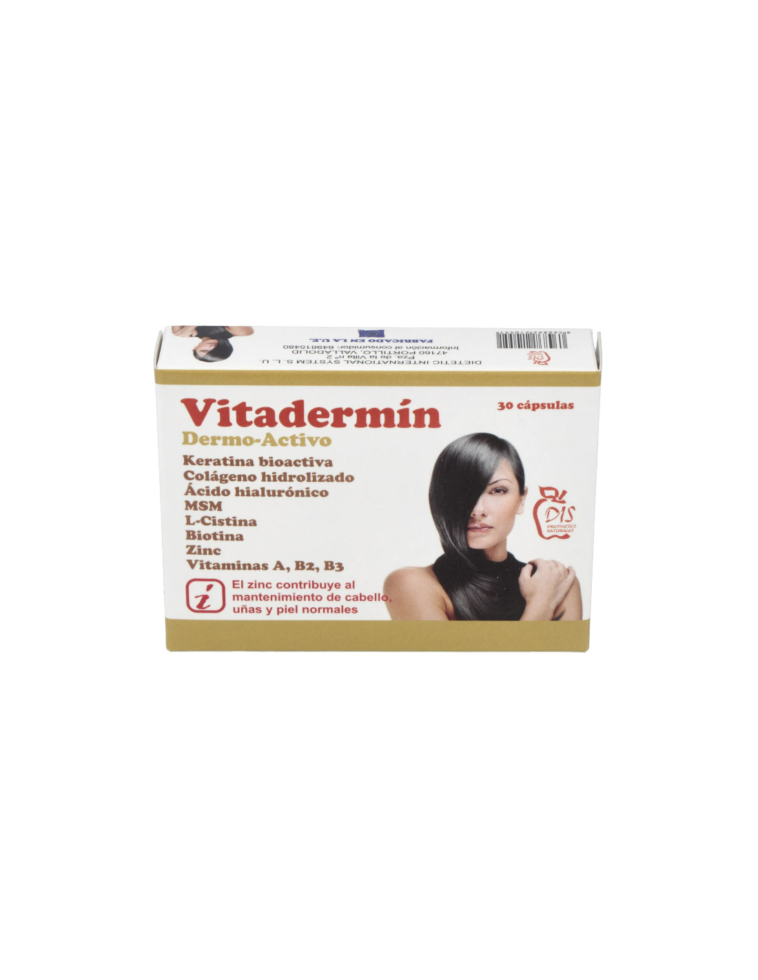 Vitadermin 30Cap.(Piel-Cabello-Uñas) de Dis es un suplemento diseñado para personas interesadas en mantener la salud integral de su piel, cabello y uñas. Su formulación está pensada para complementar la nutrición diaria y apoyar el cuidado externo desde el interior.