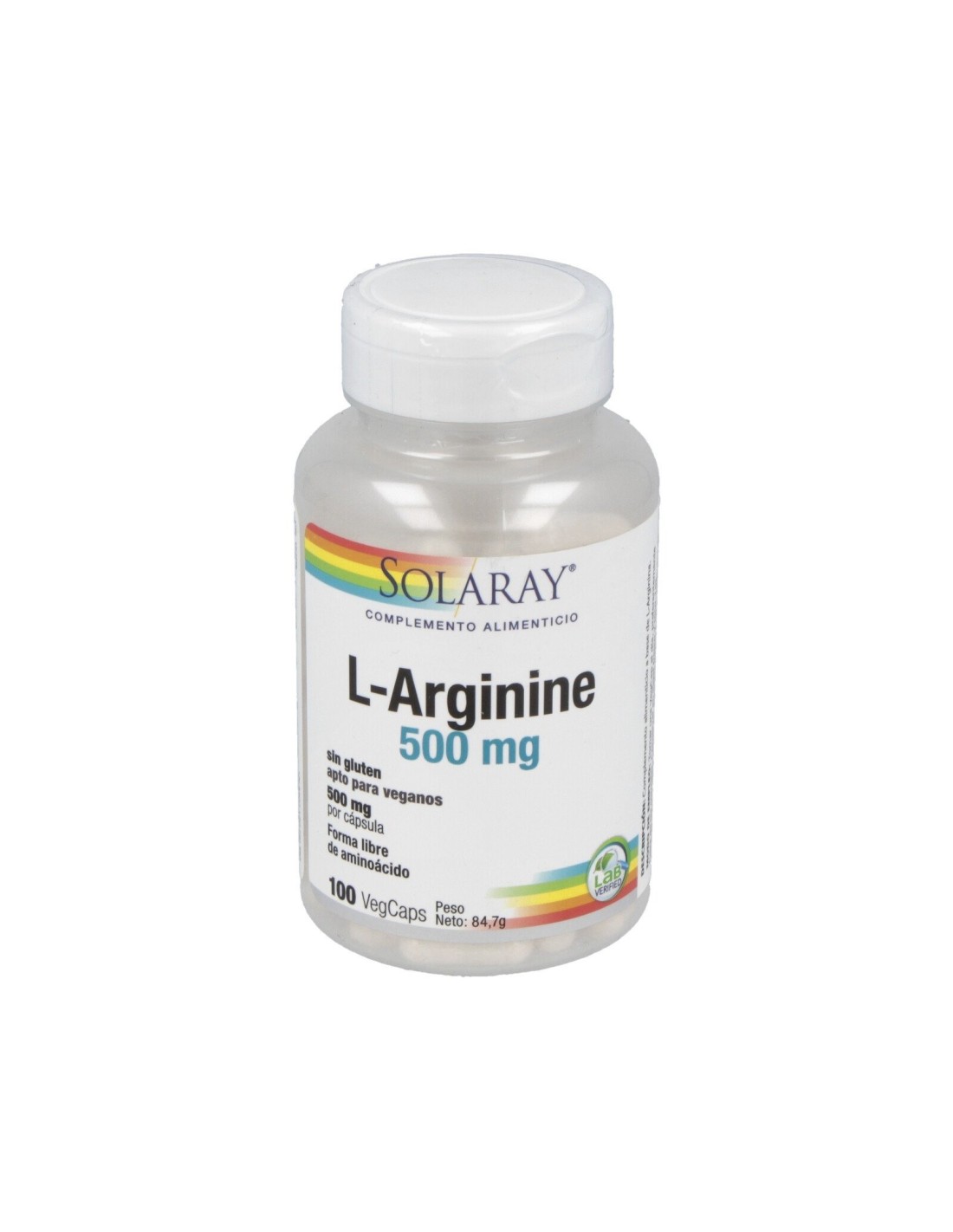 L-Arginine 500Mg. 100Cap. de Solaray es un suplemento nutricional para adultos que apoya la producción de óxido nítrico, contribuyendo a la salud vascular mediante su fórmula de 500 mg por cápsula.