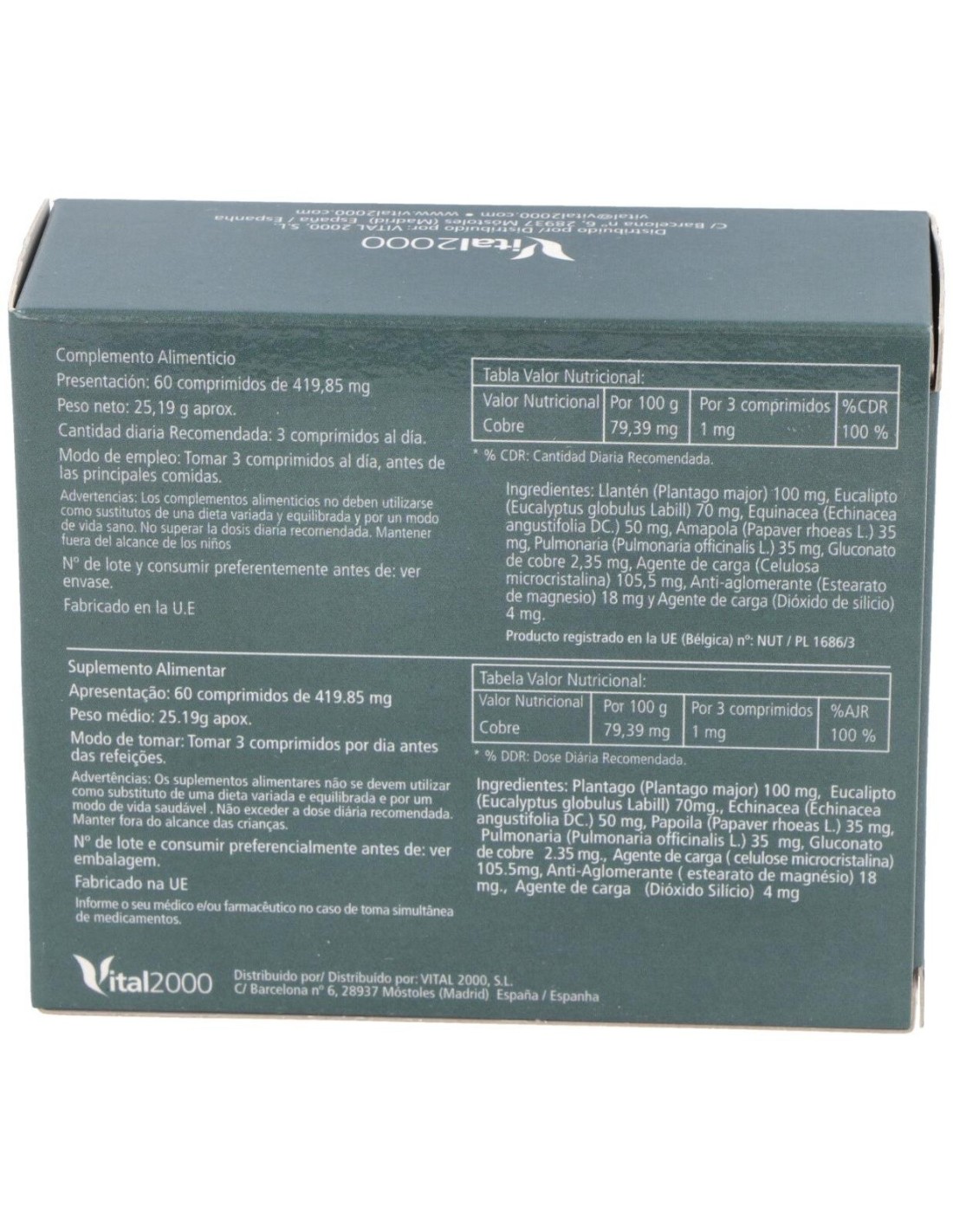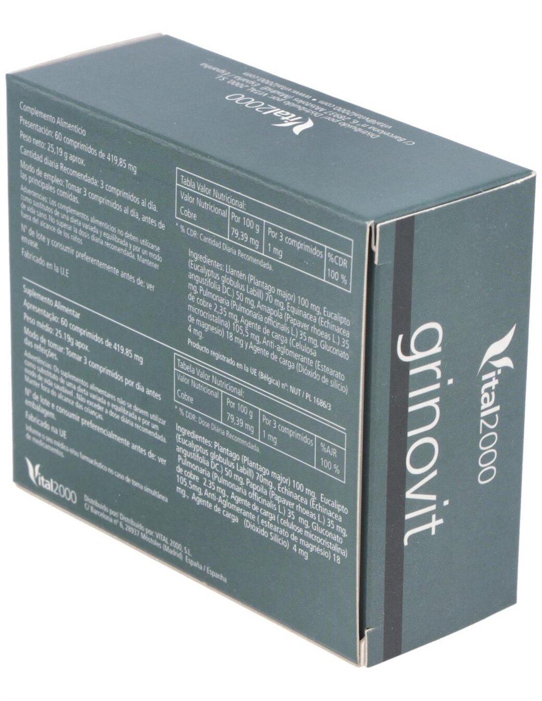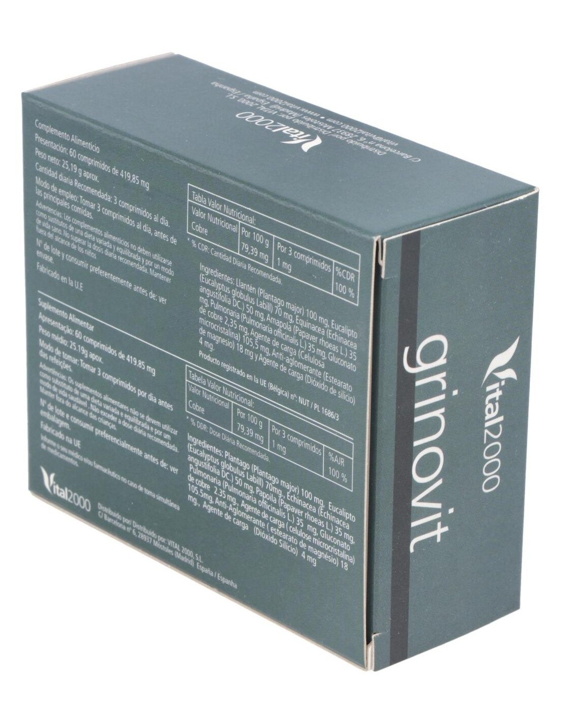 Grinovit de Vital 2000 es un producto fabricado a base de plantas medicinales y otros ingredientes naturales enfocados a equilibrar de una manera sana y saludable el sistema respiratorio.Ingredientes:Llantén (Plantago major) 100 mg, Eucalipto (Eucalyptus globulus Labill) 70 mg, Equinácea (Echinacea angustifolia DC:9 50 mg, Amapola (Papaver rhodeas L.) 35 mg, Pulmonaria (Pulmonaria officinalis L.) 35 mg, Gluconato de cobre 2,35 mg, Agente de carga (Celulosa microcristalina) 105,5 mg, Anti.-aglomerante (Estearato de magnesio) 18 mg y Agente de carga (Dióxido de silicio) 4 mg.Modo de empleo:Tomar 1 comprimidos tres veces al día antes de las principales comidas.Presentación:Envase de 60 comprimidos.