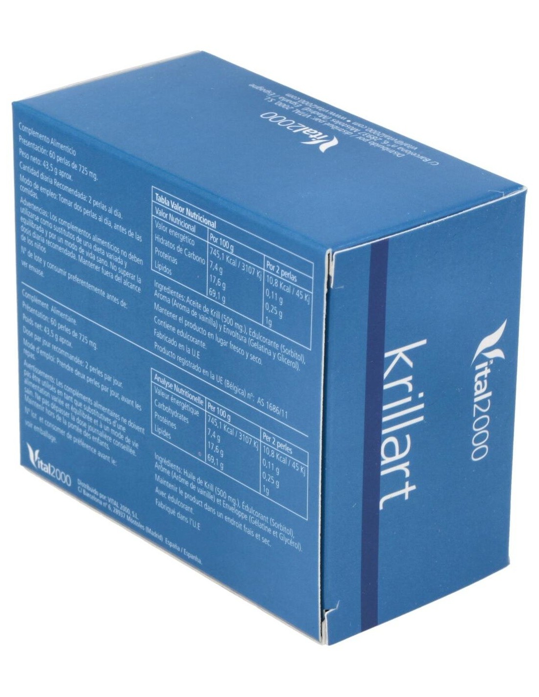 Krillart es una novedosa forma de aporte de ácidos grasos omega 3 unidos a fosfolípidos, que permite que nuestras células y tejidos absorban y distribuyan el EPA y DHA con mayor capacidad y rapidez, comparado con los omega 3 procedentes del aceite de pescado. El fosfolípido de Krillart es la fosfatidilcolina que posee la propiedad de incrementar la biodisponibilidad del EPA y del DHA y de incorporarlos a las membranas celulares.Contiene astaxantina, que da mayor estabilidad al aceite. El poder antioxidante del aceite de krill antártico es 300 veces mayor que la vitamina E y A, y 48 veces mayor que el del aceite de pescado estándar.Se presenta como un aceite 100% natural, sin enriquecer, con una concentración de EPA y DHA muy elevada, 19% y 10% y respectivamente, habiendo demostrado ser más eficaz que el aceite de pescado concentrado.