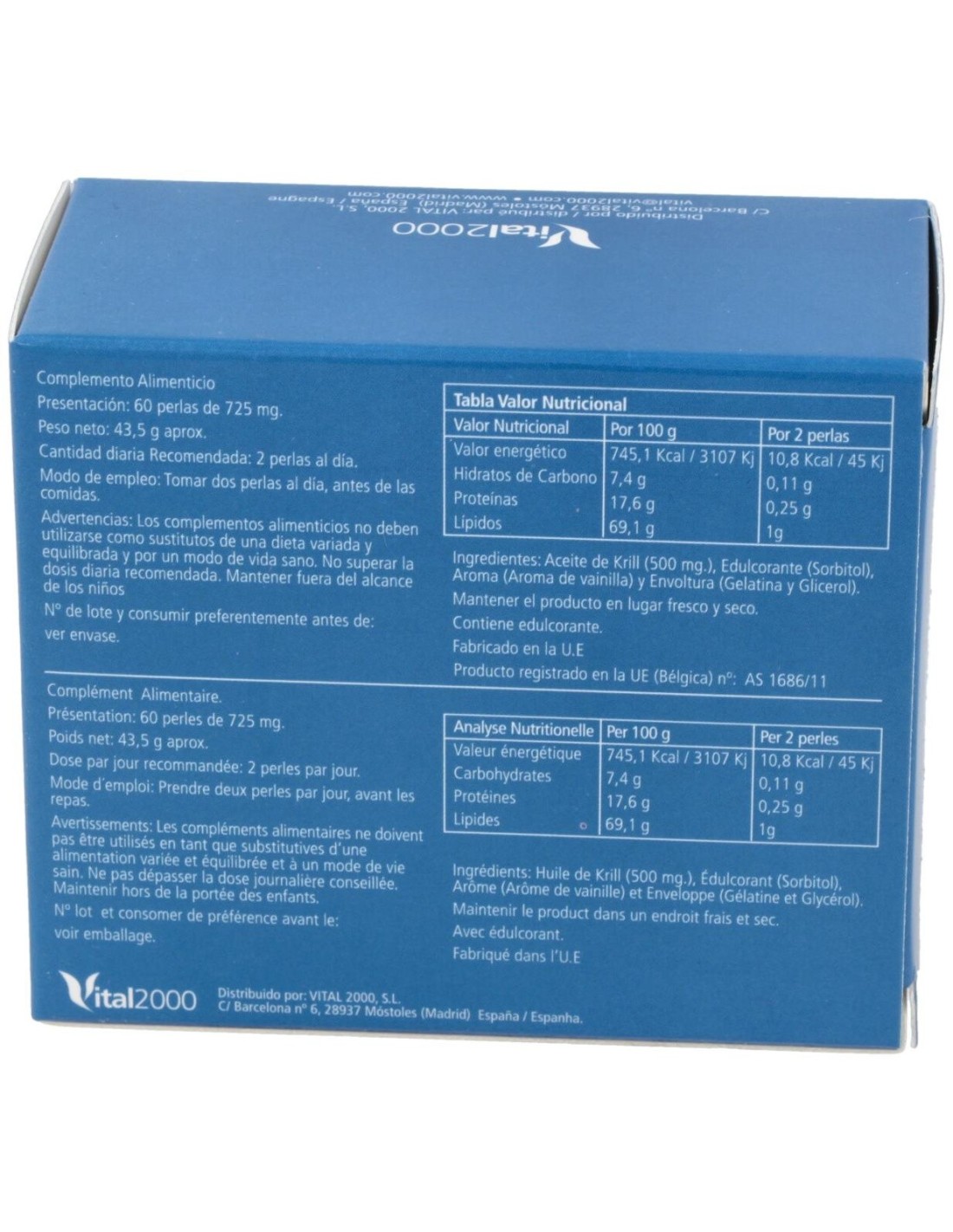 Ingredientes activos por perla:500 mg de aceite de krill (Euphausia superba).Modo de empleo:Tomar 1 perla dos veces al día.Presentación:Envase de 60 perlas.