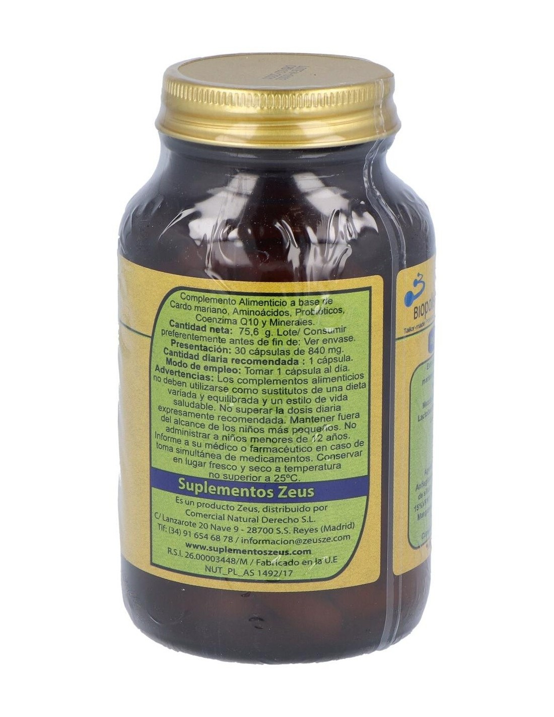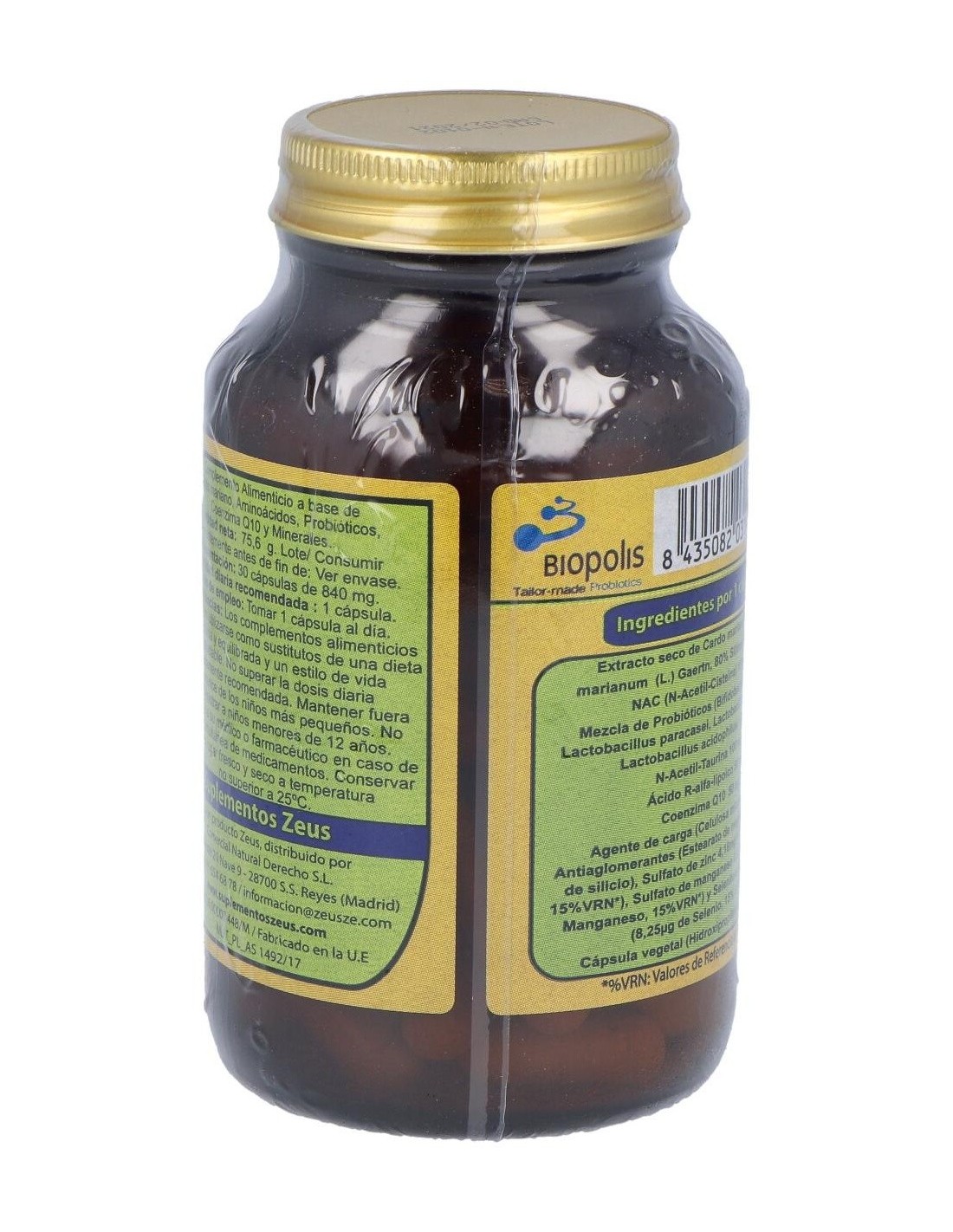 Extracto seco de Cardo Mariano (225 mg), N-Acetil Cisteína (150 mg), N-Acetil Taurina (100 mg), Ácido R-Alfa-Lipoico (50 mg), Coenzima Q10 Kaneka (50 mg), Sulfato de Zinc (4.16 mg), Sulfato de Manganeso (0.923 mg), Selenito Sódico (0.018 mg), Hidroxipropilmetilcelulosa, Lactobacillus Rhamnosus, Celulosa microcristalina, Lactobacillus Acidophilus, Lactobacillus paracasei, Bifidobacterium breve, Antiaglomerantes.