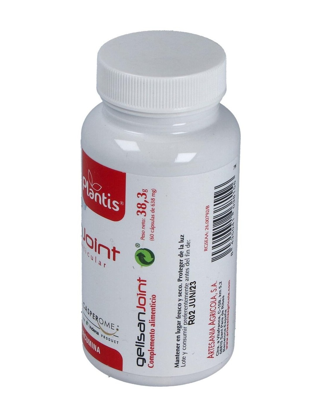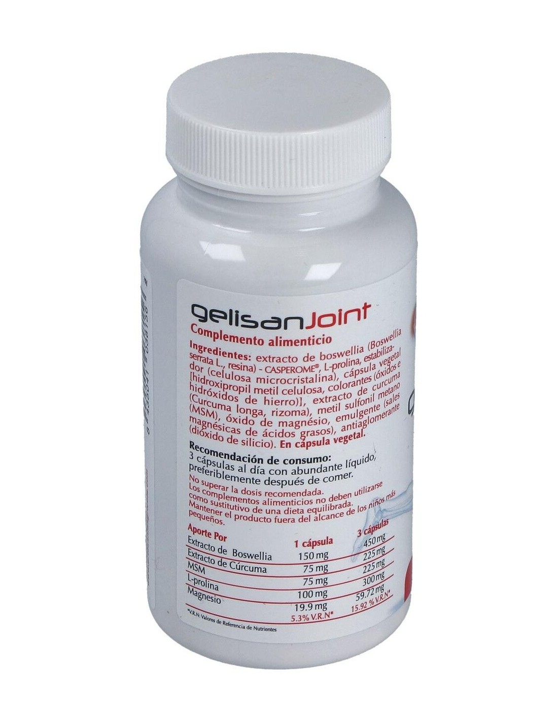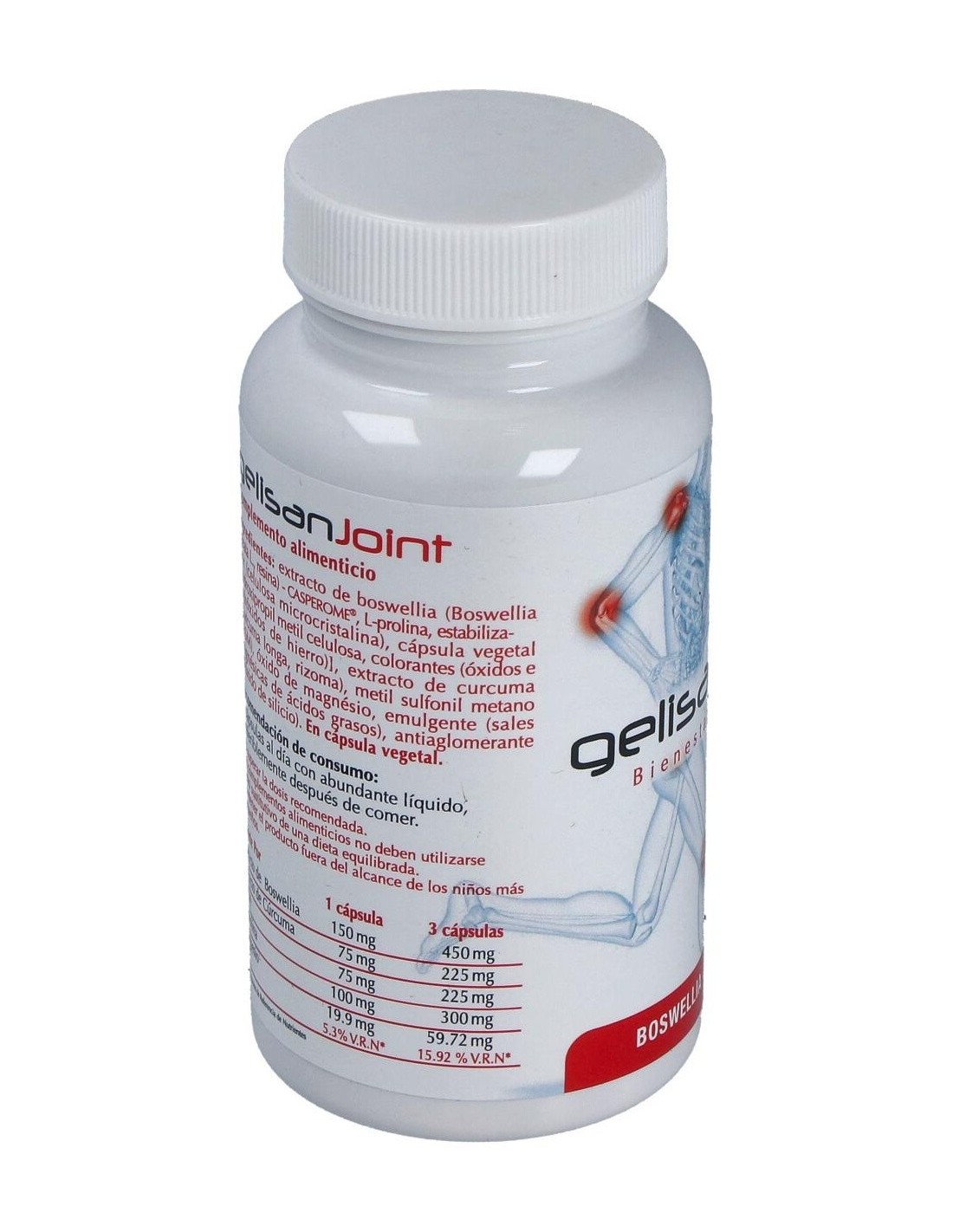 Ingredientes:Extracto de boswellia- Casperome® (Boswellia serrata, resina), L- prolina, estabilizador (celulosa microcristalina), cápsula vegetal [hidroxipropil metil celulosa, colorantes (óxidos e hidróxidos de hierro)], extracto de curcuma (Curcuma longa, rizoma), metil sulfonil metano (MSM), óxido de magnésio, emulgente (sales magnésicas de ácidos grasos), antiaglomerante (dióxido de silicio).Modo de empleo:Tomar 3 cápsulas al día con abundante líquido, preferiblemente después de comer.Presentación:Envase de 60 cápsulas.