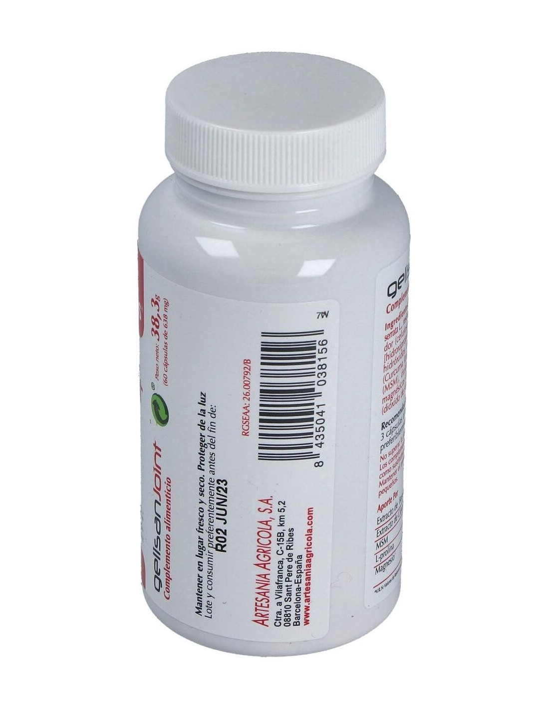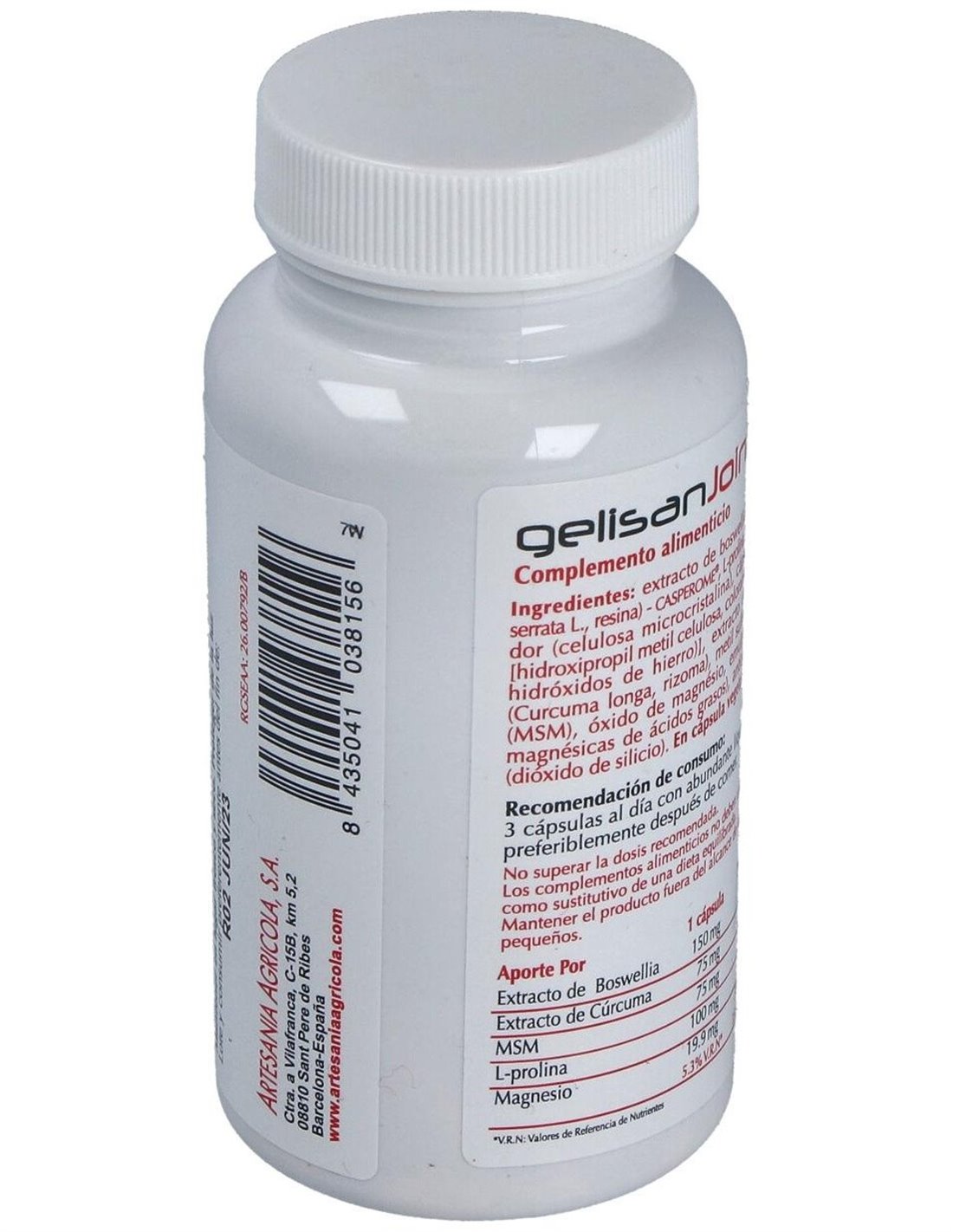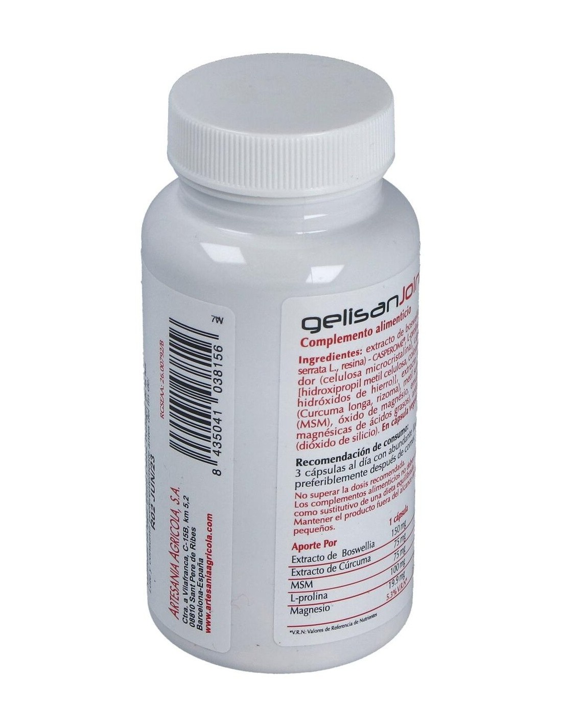 Ingredientes:Extracto de boswellia- Casperome® (Boswellia serrata, resina), L- prolina, estabilizador (celulosa microcristalina), cápsula vegetal [hidroxipropil metil celulosa, colorantes (óxidos e hidróxidos de hierro)], extracto de curcuma (Curcuma longa, rizoma), metil sulfonil metano (MSM), óxido de magnésio, emulgente (sales magnésicas de ácidos grasos), antiaglomerante (dióxido de silicio).Modo de empleo:Tomar 3 cápsulas al día con abundante líquido, preferiblemente después de comer.Presentación:Envase de 60 cápsulas.