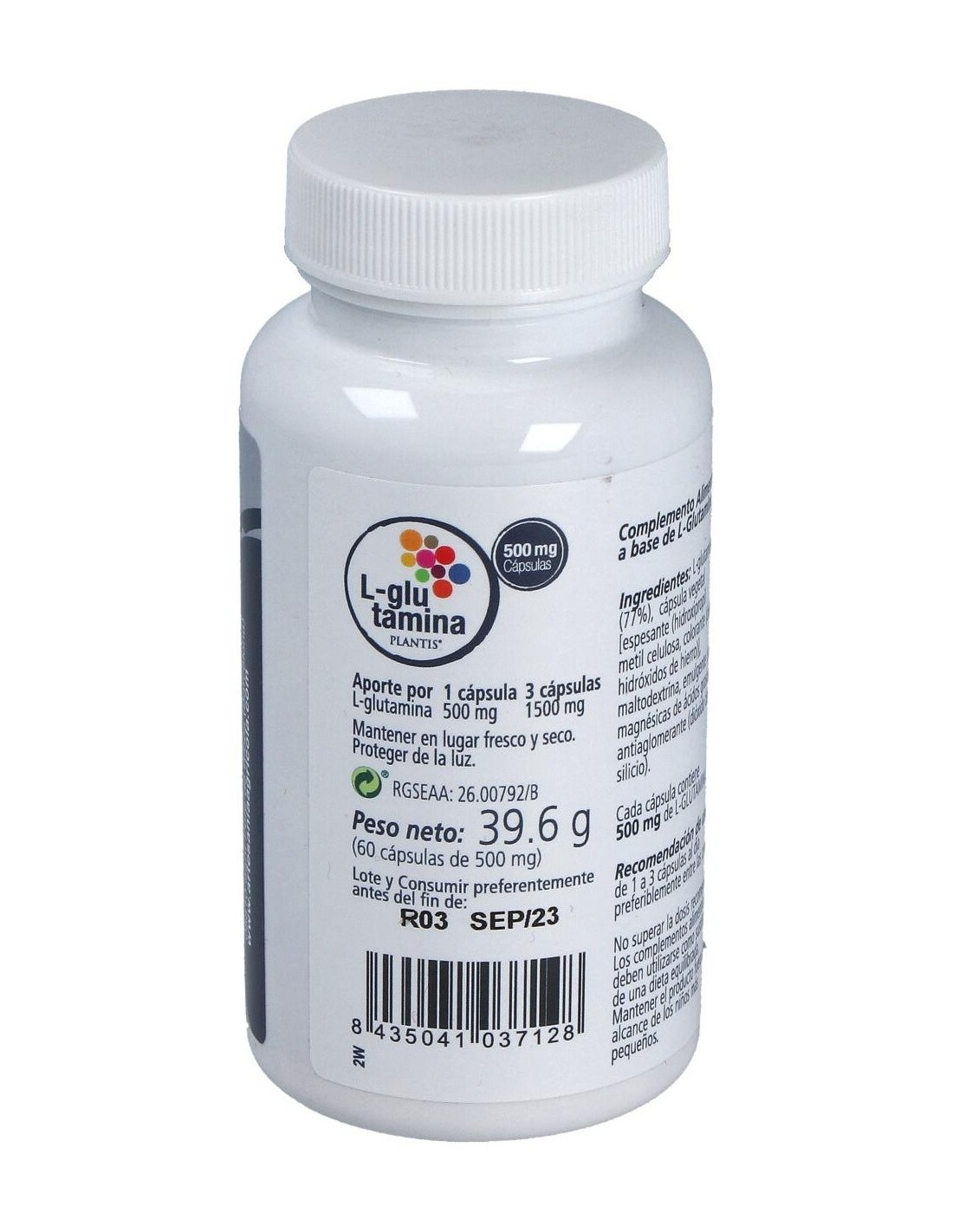 La L-Glutamina es un aminoácido no esencial es decir que puede sintetizarse en el organismo a partir de otros aminoácidos tales como la valina, la isoleucina o el ácido glutámico, sin embargo se le considera un "aminoácido esencial condicionado" o semi-esencial ya que en algunas condiciones (estrés, traumatismo, infección, entrenamiento intenso, etc.) su consumo es superior a su síntesis: el organismo demanda tanta cantidad de glutamina que este no es capaz de sintetizarla en cantidad suficiente.Una suplementación con glutamina favorece la síntesis proteica, previene el catabolismo muscular en situaciones de estrés oxidativo y mantiene o mejora la función inmune.La glutamina utilizada en nuestros productos es de altísima pureza y calidad, está fabricada por Kyowa, empresa líder en el sector biotecnológico.Composición activa por cápsula:500 mg de L-glutamina.Ingredientes:L-glutamina (77%), cápsula vegetal [espesante (hidroxipropil metil celulosa, colorante (óxidos e hidróxidos de hierro)], maltodextrina, emulgente (sales magnésicas de ácidos grasos), antiaglomerante (dióxido de silicio). En cápsula vegetal.Modo de empleo:Tomar de 1 a 3 cápsulas al día preferiblemente entre las comidas.Presentación:Envase de 60 cápsulas.
