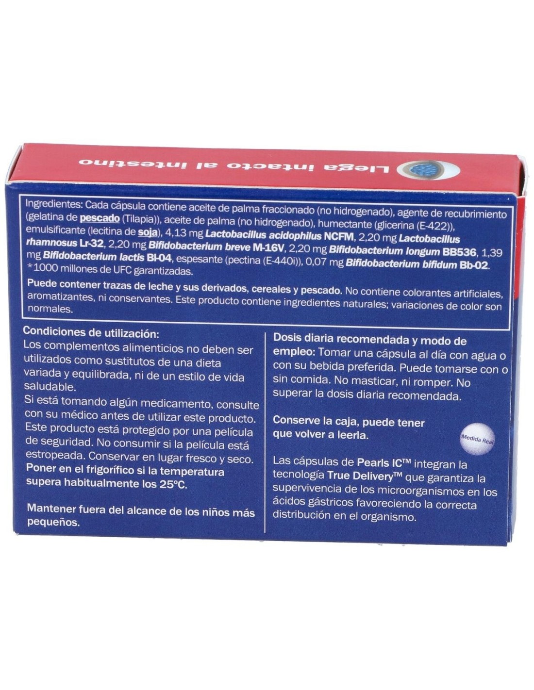 Lactobacillus acidophilus, Lactobacillus rhamnosus, Bifidobacterium bifidum, Bifidobacterium lactis, Bifidobacterium longum, Bifidobacterium brevis ... 1000 millones de UFC