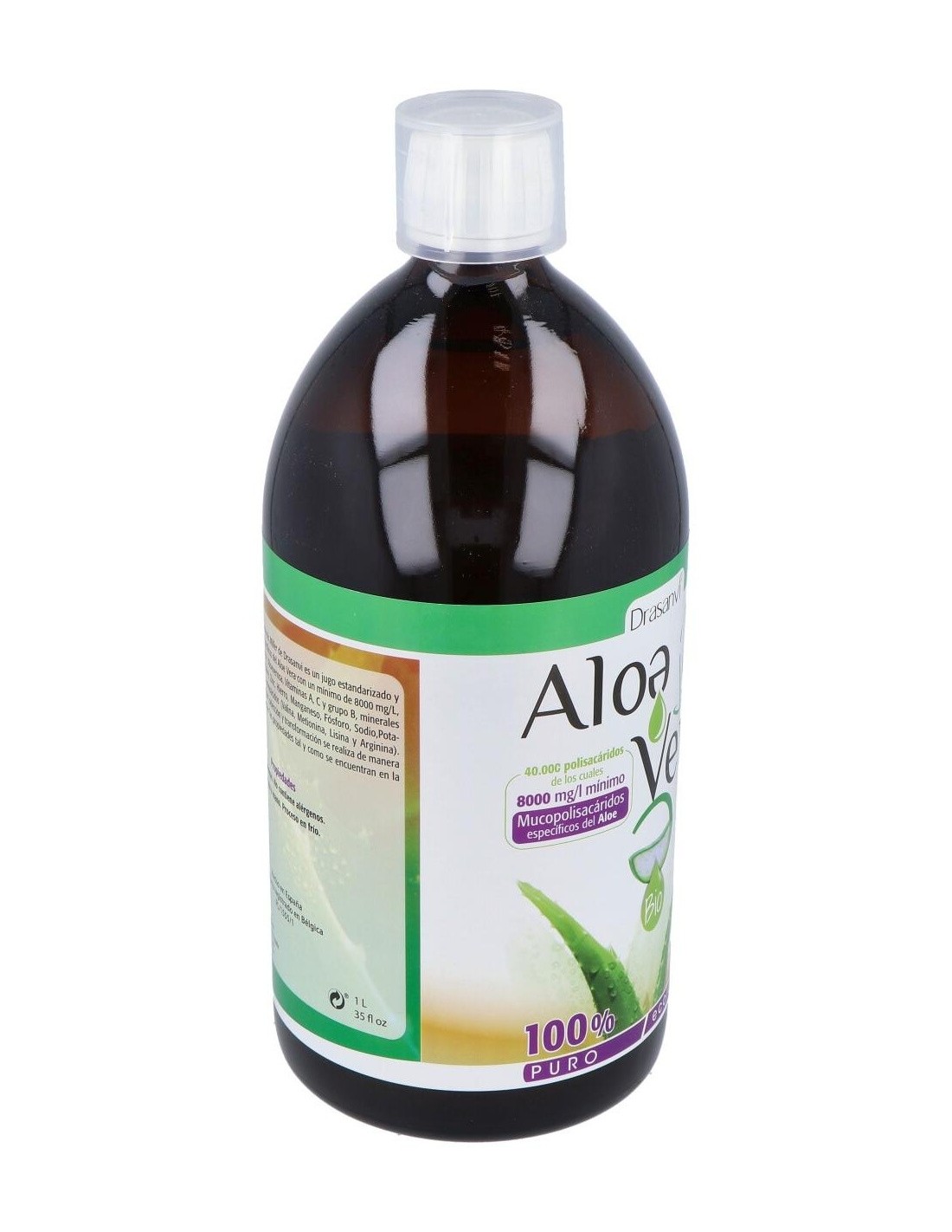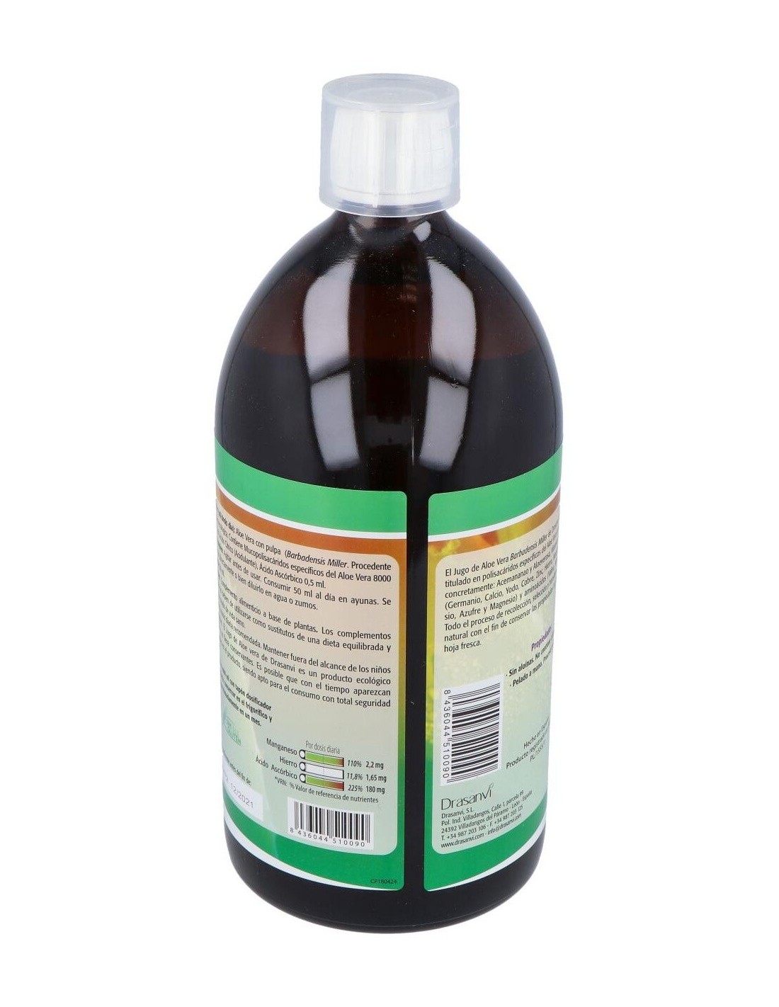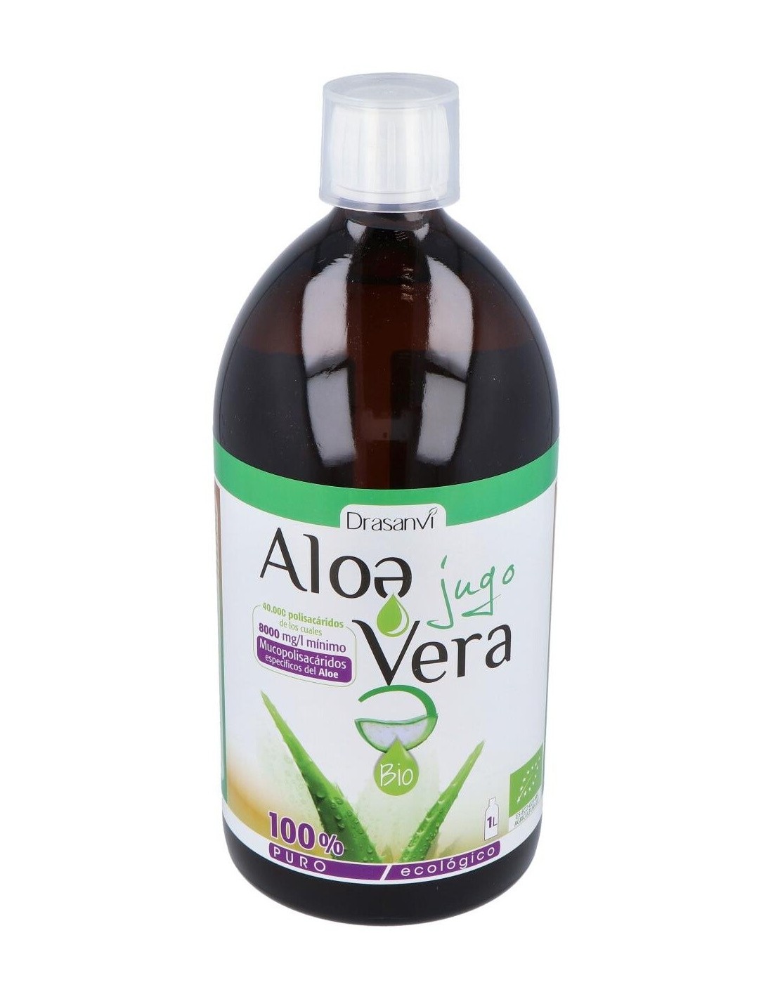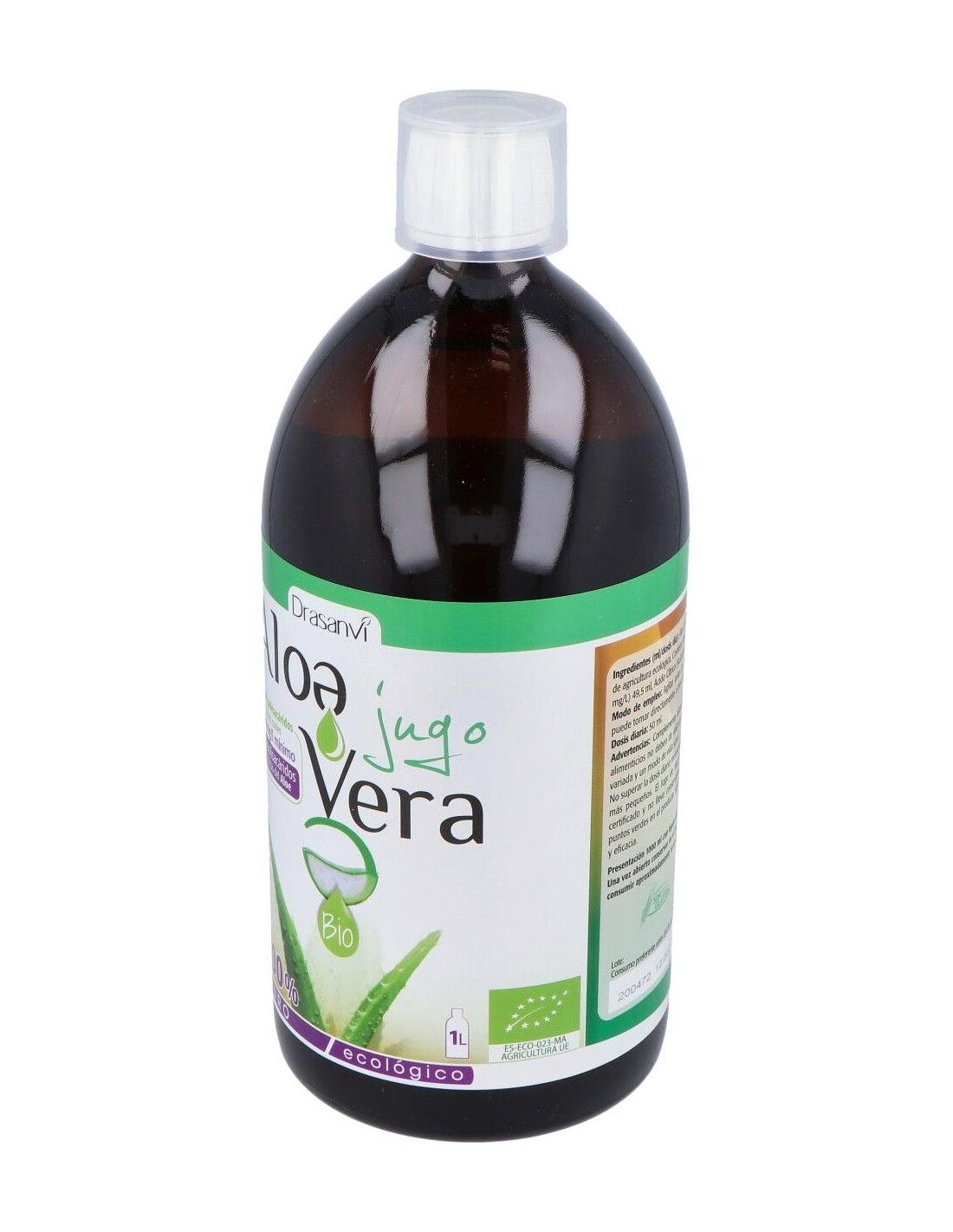 Beneficios del Jugo de Aloe VeraEl Aloe Vera se puede ver como la reina de la plantas en medicina natural, posee una propiedades excepcionales. Es conocida como la planta de la inmortalidad en el antiguo egipcio , también se le ha llamado la planta biblica por la de veces que se menciona en el Antiguo como en el nuevo testamento, se relata que Nicodemo utilizó una mezcla de Aloe y mirra para embalsamar a Jesús. Se cree que el nombre de esta planta como la conocemos actualmente es de origen árabe , alloeh significa en arabe amargo y brillante. Su otro nombre sabila se le atribuye a una deformación del vocablo cabira, que significa en árabigo antiguo planta espinosa, Vera parece que puede provenir del latín y significa verdad, asi seria una amarga y brillante verdad la que esconde dentro. Los beneficios para la salud del jugo de aloe vera se conocen desde hace mucho tiempo. Históricamente se ha utilizado como un bálsamo calmante, siendo aplicado externamente en cortes, raspaduras y quemaduras. En la actualidad, el gel de Aloe Vera, se ha hecho muy popular por su amplia utilización en productos de belleza, higiene y cuidado corporal. Pero, su uso interno, también resulta muy beneficioso para nuestra salud, siendo un excelente complemento para nuestra dieta. El jugo de Aloe Vera contiene diecinueve aminoácidos, veinte minerales y doce vitaminas, por lo que es un excelente suplemento nutricional natural. Beber diariamente entre 50 y 100 ml. de jugo de Aloe Vera proporciona numerosos beneficios para la salud. Ayuda a dilatar los capilares y apoyar el crecimiento celular mejorando la circulación, regula la presión arterial, promueve la curación de huesos y articulaciones, cura los daños de tejidos internos y úlceras, fortalece el sistema inmunológico, mejora e incluso elimina el estreñimiento, defiende el organismo contra las bacterias, favorece la regulación de azúcar en la sangre, ayuda en la curación de la psoriasis reduciendo la picazón, y, además, proporciona una sensación de bienestar y energía. Son conocidas las propiedades de la planta de aloe vera para bajar el colesterol malo o LDL y mantener sano el organismo. El aloe vera a través de sus componentes logra actuar contra las altas concentraciones de colesterol en sangre.Composición activa por dosis diaria (50 ml):Aloe vera con pulpa (hoja)(aloe barbadensis miller. Procedente de agricultura ecológica. Contiene Mucopolisacáridos específicos del aloe vera 8.000 mg/L) 49,5 ml, acidulante (ácido cítrico), antioxidante (ácido ascórbico).Modo de empleo:Tomar 50 ml al día en ayunas. Se puede tomar directamente o disuelto en agua o zumo.Presentación:Botella de 1 litro.Recomendaciones y advertencias:No contiene aloína. No contieen alérgenos. Pelado a mano. Proceso en frio.