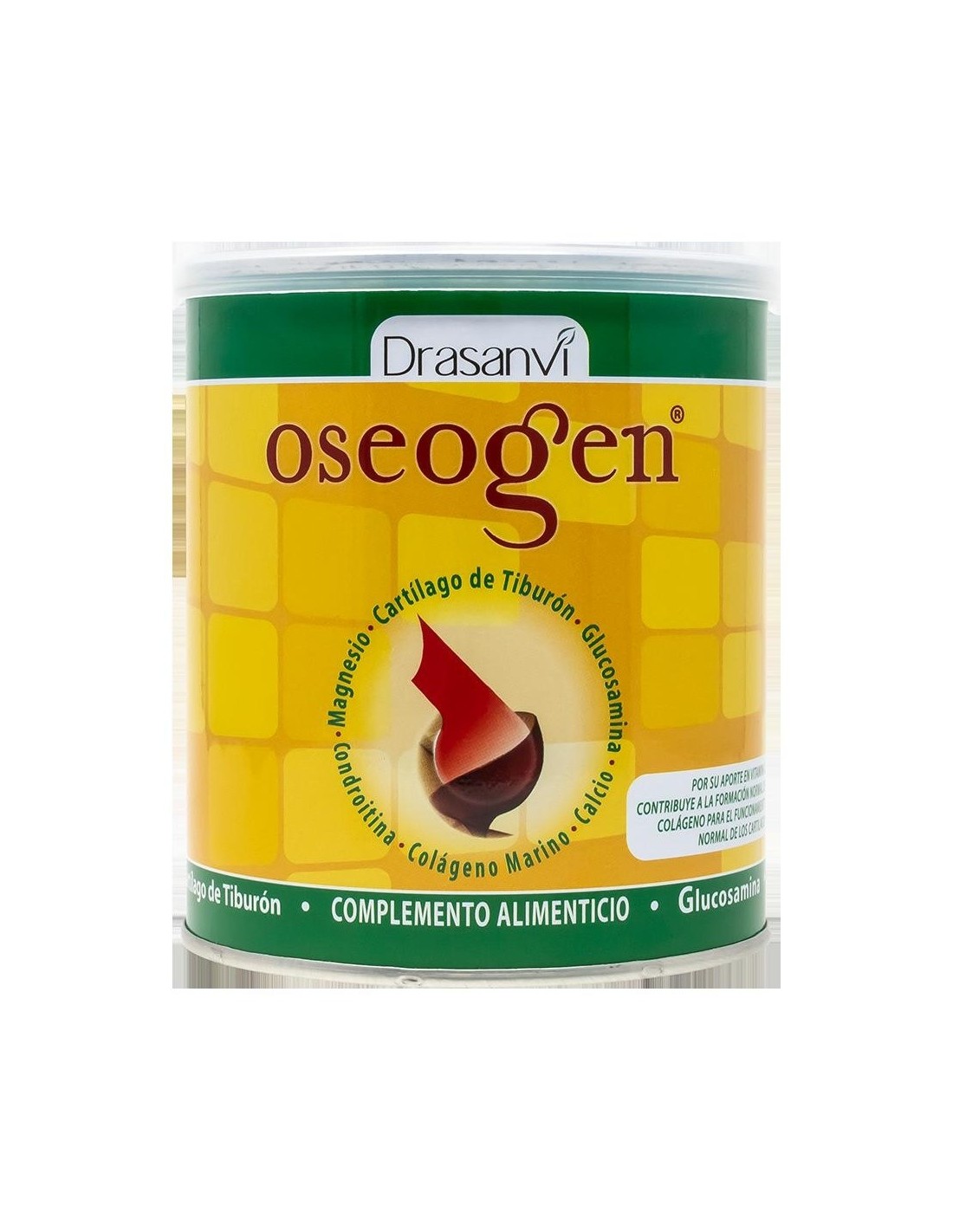 ¿Que es Oseogen Articular?Oseogen Articular es un complemento alimenticio único que incorpora en su composición nutrientes como el colágeno marino, el cartílago de tiburón, la condroitina y el sulfato de glucosamina. Además de la alta concentración de los nutrientes ya señalados cabe destacar la presencia de 8 Vitaminas (7 de ellas aportan un 100% de cantidad diaria recomendada) y de minerales esenciales. ¿Cuales son los beneficios de Oseogen Articular?El colágeno es una proteína fundamental en la composición de huesos, ligamentos, tendones, cartílagos (incluidos los que protegen las articulaciones) y músculos. Por tanto, el colágeno es necesario para el funcionamiento del cartílago. Entre otras localizaciones, el cartílago cubre los extremos de los huesos, dando lugar a las articulaciones, las cuales permiten que los huesos se deslicen uno sobre el otro, de manera correcta. Para ello, Oseogen Articular, esta formulado a base de minerales y vitaminas de máxima asimilación por el organismo y reforzado con Condroitina, Glucosamina, Cartílago de tiburón y Colágeno hidrolizado de origen marino. Ingredientes por 20 grs: