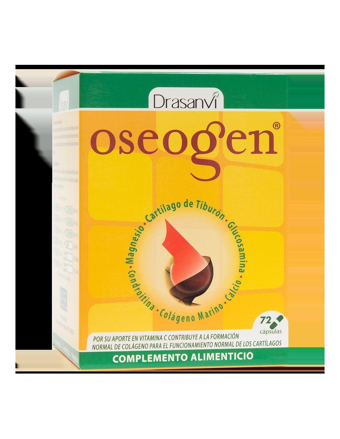 ¿Que es Oseogen Articular?Oseogen Articular es un complemento alimenticio único que incorpora en su composición nutrientes como el colágeno marino, el cartílago de tiburón, la condroitina y el sulfato de glucosamina. Además de la alta concentración de los nutrientes ya señalados cabe destacar la presencia de 8 Vitaminas (7 de ellas aportan un 100% de cantidad diaria recomendada) y de minerales esenciales. ¿Cuales son los beneficios de Oseogen Articular?El colágeno es una proteína fundamental en la composición de huesos, ligamentos, tendones, cartílagos (incluidos los que protegen las articulaciones) y músculos. Por tanto, el colágeno es necesario para el funcionamiento del cartílago. Entre otras localizaciones, el cartílago cubre los extremos de los huesos, dando lugar a las articulaciones, las cuales permiten que los huesos se deslicen uno sobre el otro, de manera correcta. Para ello, Oseogen Articular, esta formulado a base de minerales y vitaminas de máxima asimilación por el organismo y reforzado con Condroitina, Glucosamina, Cartílago de tiburón y Colágeno hidrolizado de origen marino. Composición activa por 3 cápsulas:
