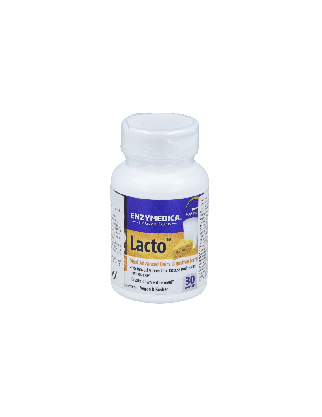 Complemento alimenticio a base de lactasa y un amplio espectro de enzimas. Apto para vegetarianos, veganos y Kosher.