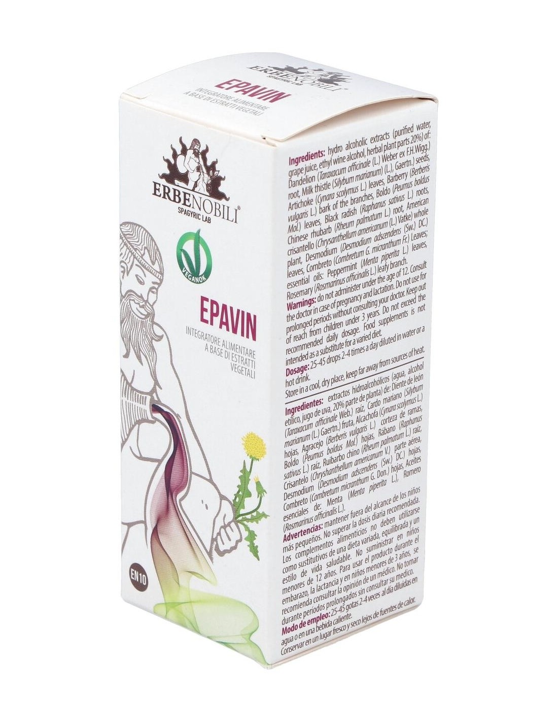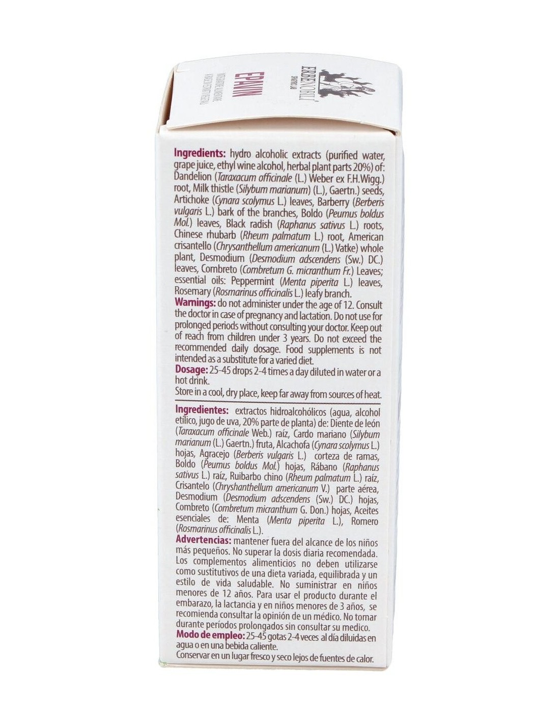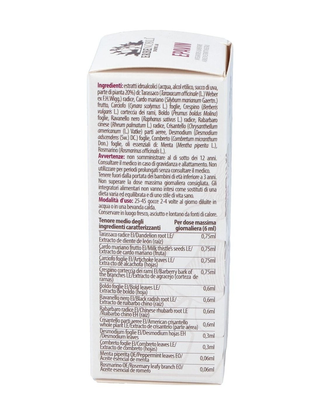 Extractos hidroalcohólicos (agua, alcohol etílico, jugo de uva, parte de la planta 20%) de: Diente de león (Taraxacum officinale Weber) raíz, Cardo mariano (Silybum marianum Gaertn.) fruto, Alcachofa (Cynara scolymus L.) hojas, Agracejo (Berberis vulgaris L.) hojas, Boldo (Peumus boldus Molina) hojas, Rábano negro (Raphanus sativus L.) raiz, Ruibarbo chino (Rheum palmatum L.) raíz, Manzanilla (Chrysantellum americanum Vatke) partes aéreas, Cúrcuma (Curcumalonga L.) rizoma, Combreto (Combretum micranthum Don.) hojas, aceites esenciales de: Hierbabuena (Mentha piperita L.), Romero (Rosmarinus officinalis L.).