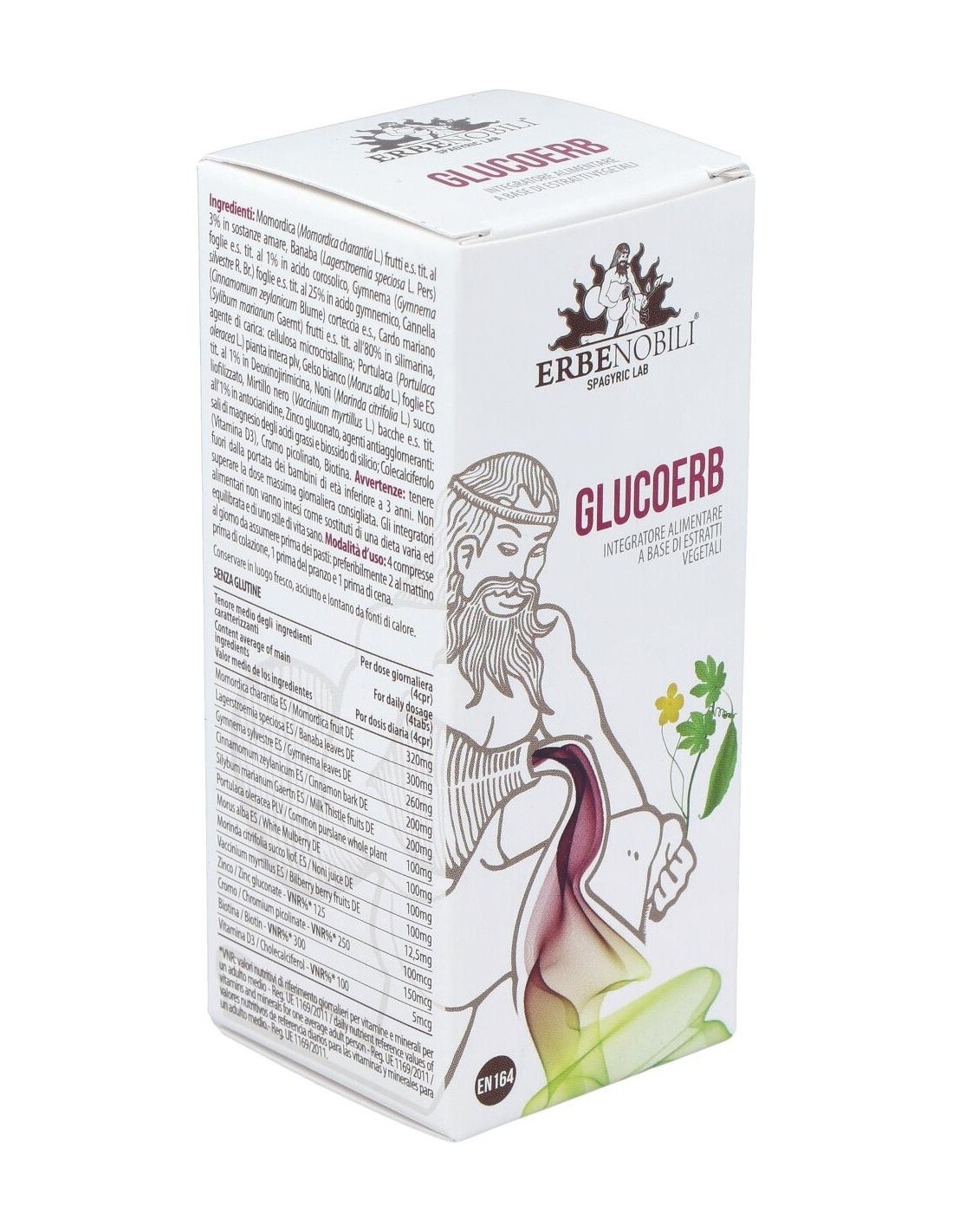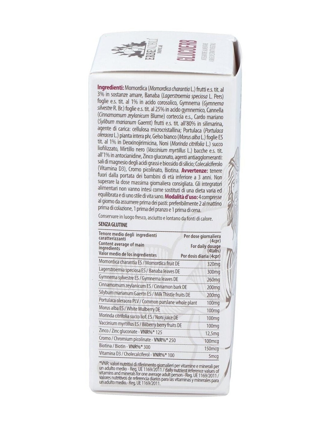 Extracto seco de frutas Momordica (Momordica charantia L.) (titulado al 3% en sustancias amargas), Banaba (Lagerstroemia speciosa L. Pers) extracto seco (1% en ácido corosólico), Gymnema (Gymnema silvestre R. Br .) extracto seco de hojas (valorado al 25% en ácido gimémico), extracto seco de corteza de canela (Cinnamomum zeylanicum), agente de carga: celulosa microcristalina: Portulaca (Portulaca oleracea L.) planta entera plv, hojas de morera blanca (Morus alba L.) tituladas al 1% en Deoxinojirimicina, jugo liofilizado de Noni (Morinda citrifolia), extracto seco de bayas de arándano (Vaccinium myrtillus L.) (titulado a ´1% en antocianidinas), gluconato de zinc, antiaglomerantes: sales de magnesio de ácidos grasos y dióxido de silicio: Colecalciferol (vitamina D3), picolinato de cromo, biotina.