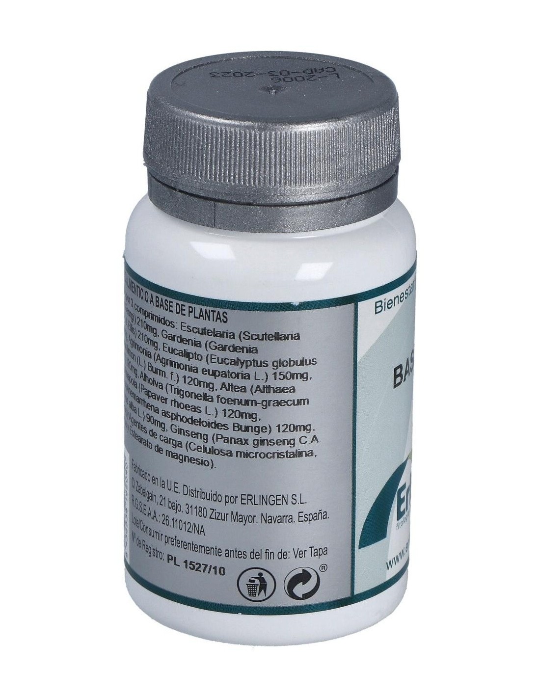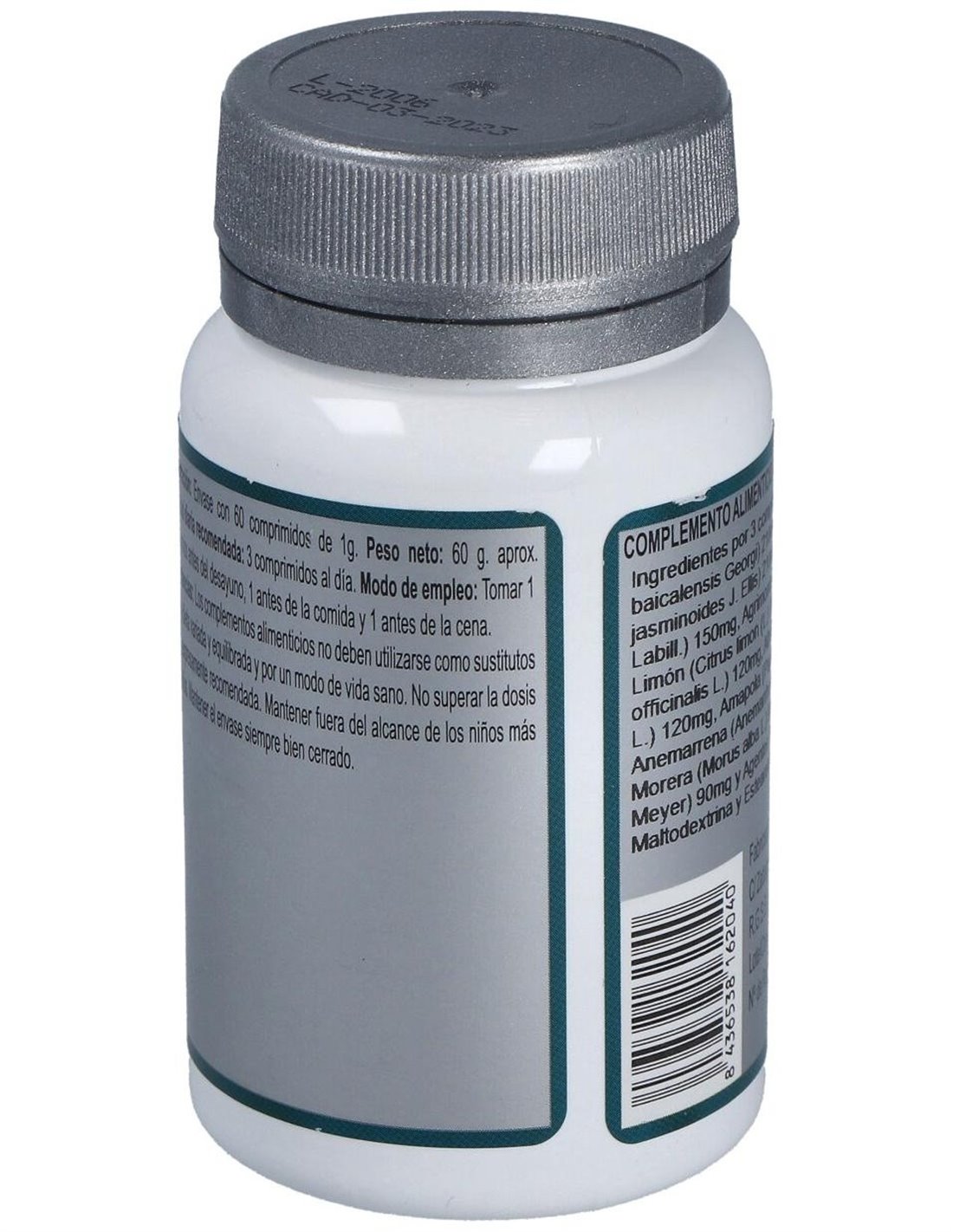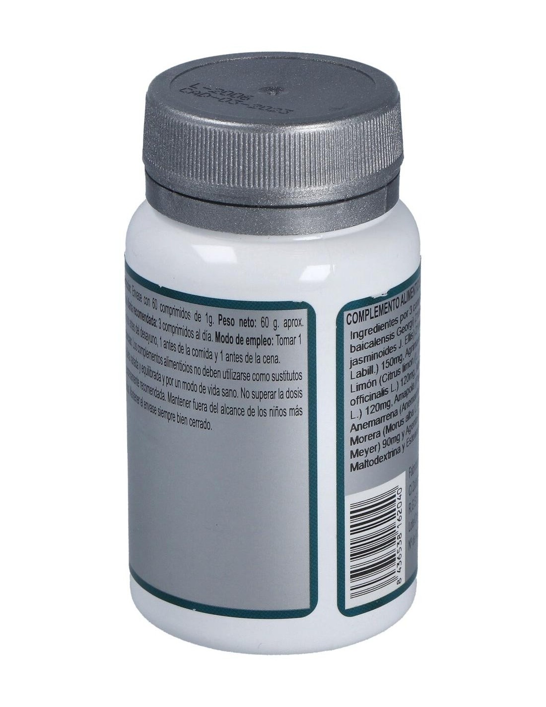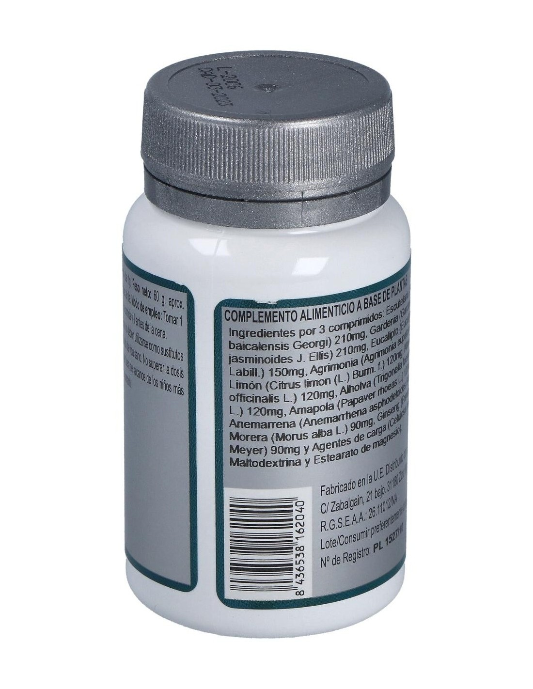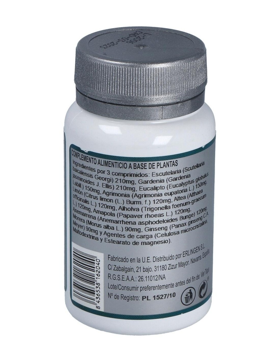 Escutelaria (Scutellaria baicalensis Georgi) 210 mg, Gardenia (Gardenia jasminoides J. Ellis) 210 mg, Eucalipto (Eucalyptus globulus Labill.) 150 mg, Agrimonia (Agrimonia eupatoria L.) 150 mg, Limón (Citrus limon (L.) Burm. f.) 120 mg, Altea (Althaea officinalis L.) 120 mg, Alholva (Trigonella foenum-graecum L.) 120 mg, Amapola (Papaver rhoeas L.) 120 mg, Anemarrena (Anemarrhena asphodeloides Bunge) 120 mg, Morera (Morus alba L.) 90 mg, Ginseng (Panax ginseng C.A. Meyer) 90 mg y Agentes de carga (Celulosa microcristalina, Maltodextrina y Estearato de magnesio).