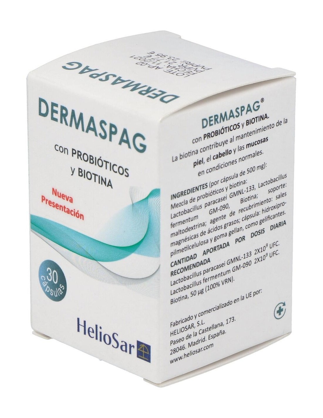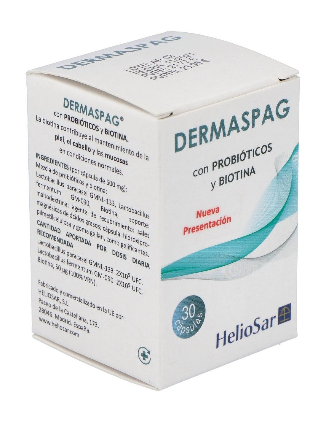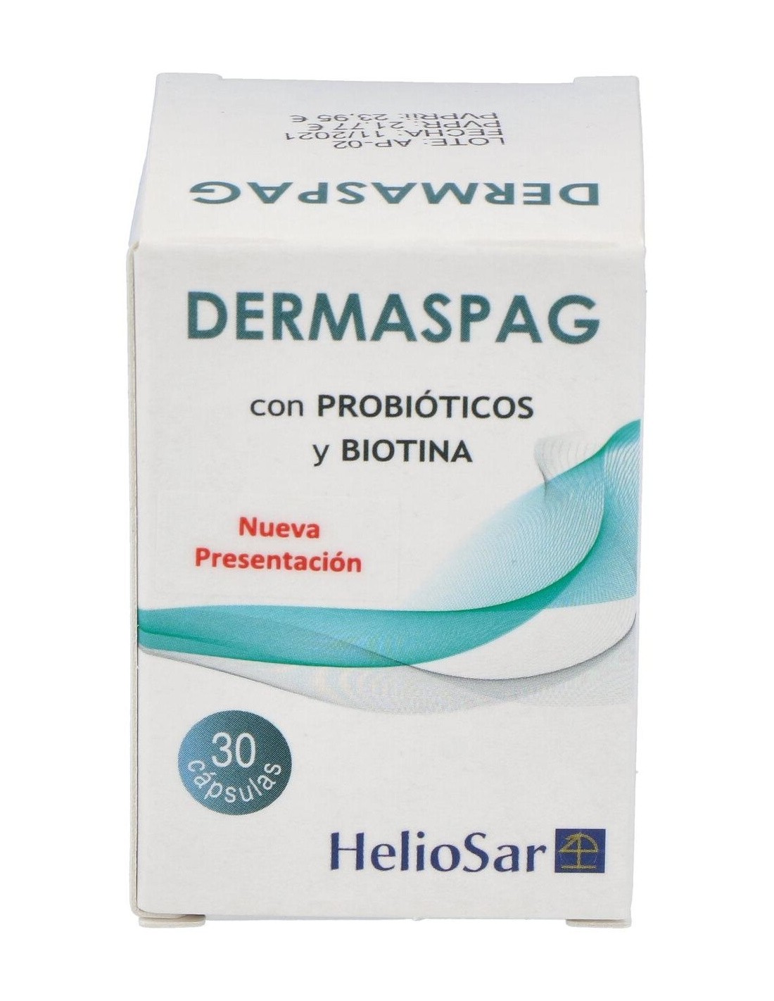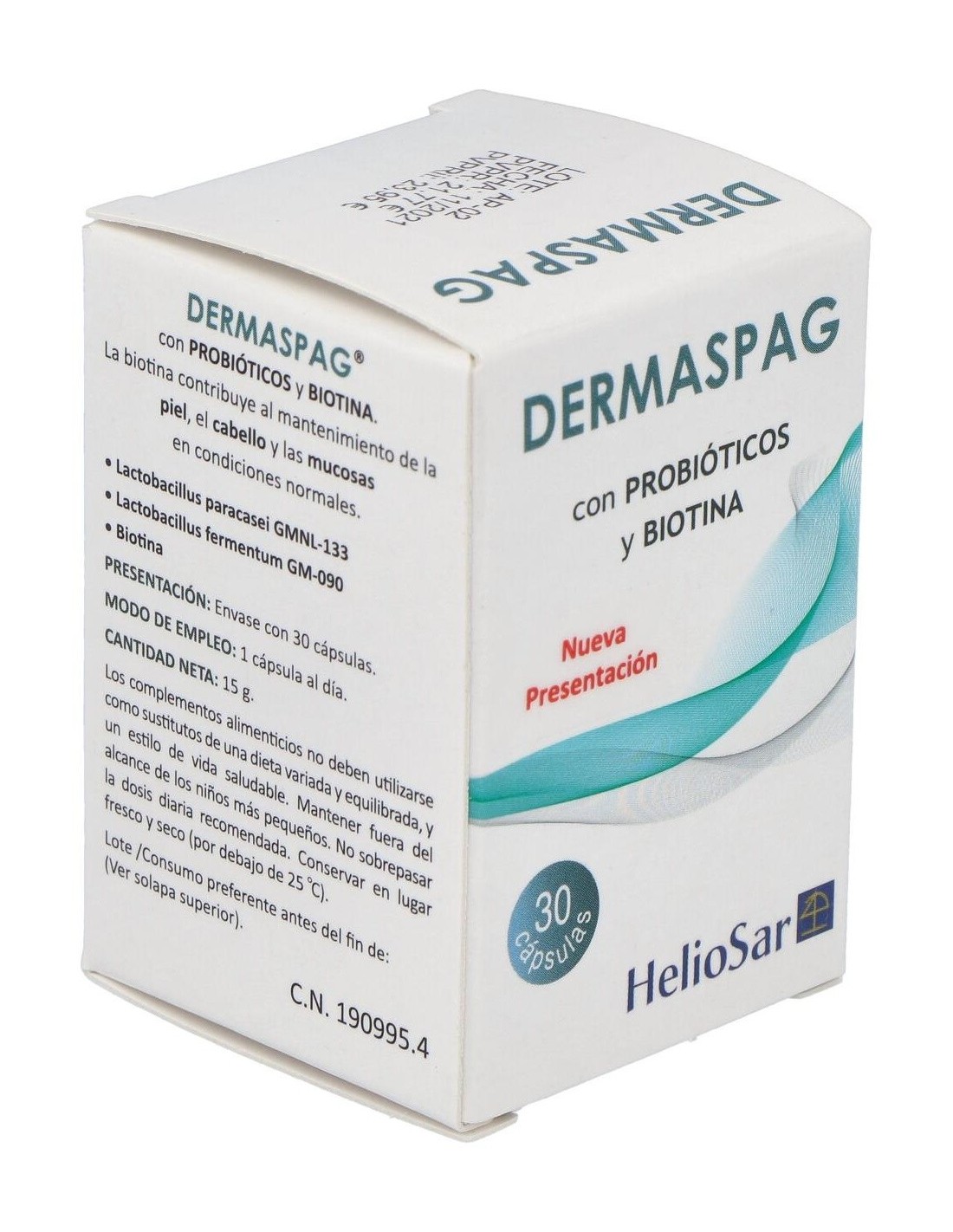 Las cápsulas Dermaspag de Heliosar están indicadas para mantener la piel y el cabello saludables. Este es un complemento alimenticio formulado con probióticos y biotina. Está diseñado para reforzar la salud de piel, mucosas y cabello, especialmente en casos de alergia.
