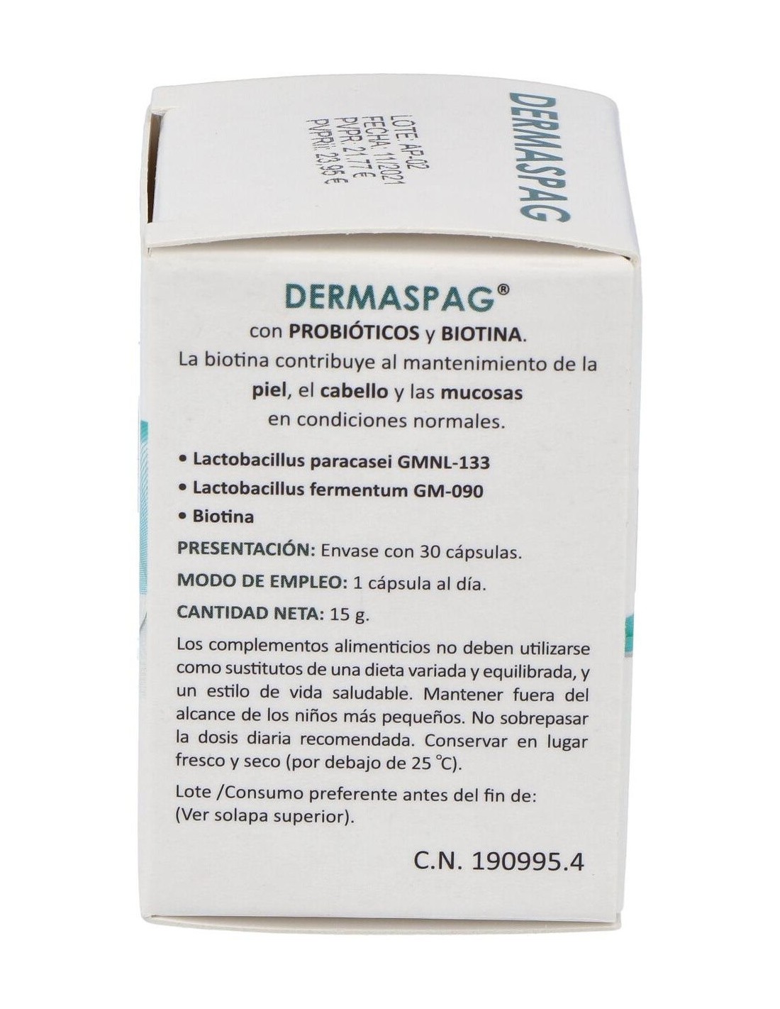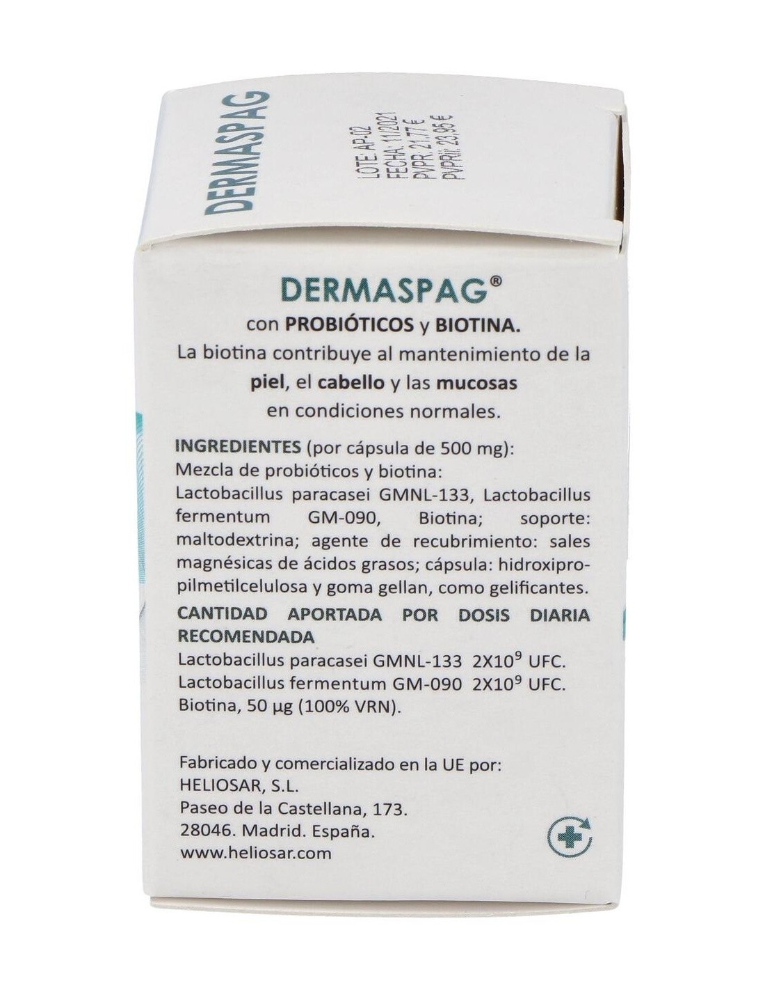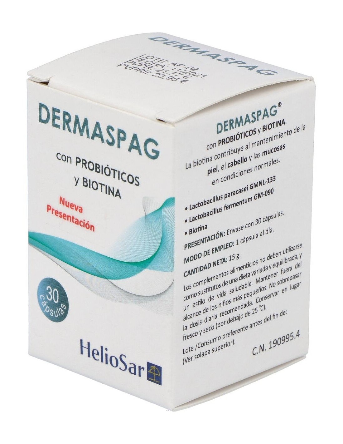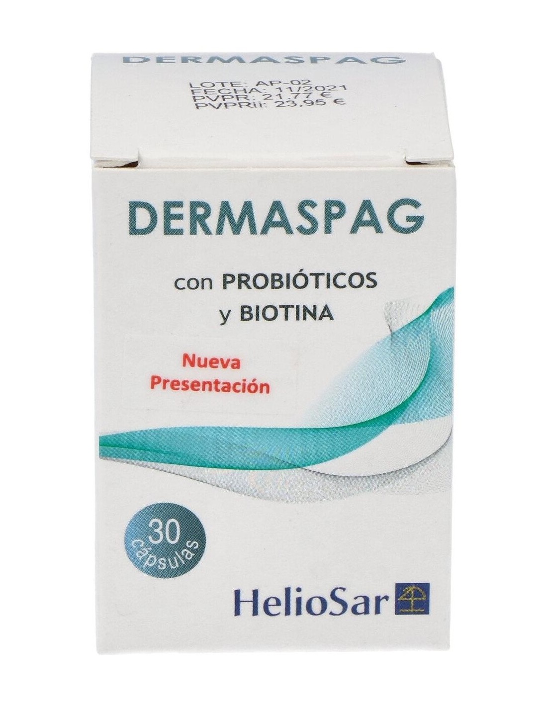 Las cápsulas Dermaspag de Heliosar están indicadas para mantener la piel y el cabello saludables. Este es un complemento alimenticio formulado con probióticos y biotina. Está diseñado para reforzar la salud de piel, mucosas y cabello, especialmente en casos de alergia.