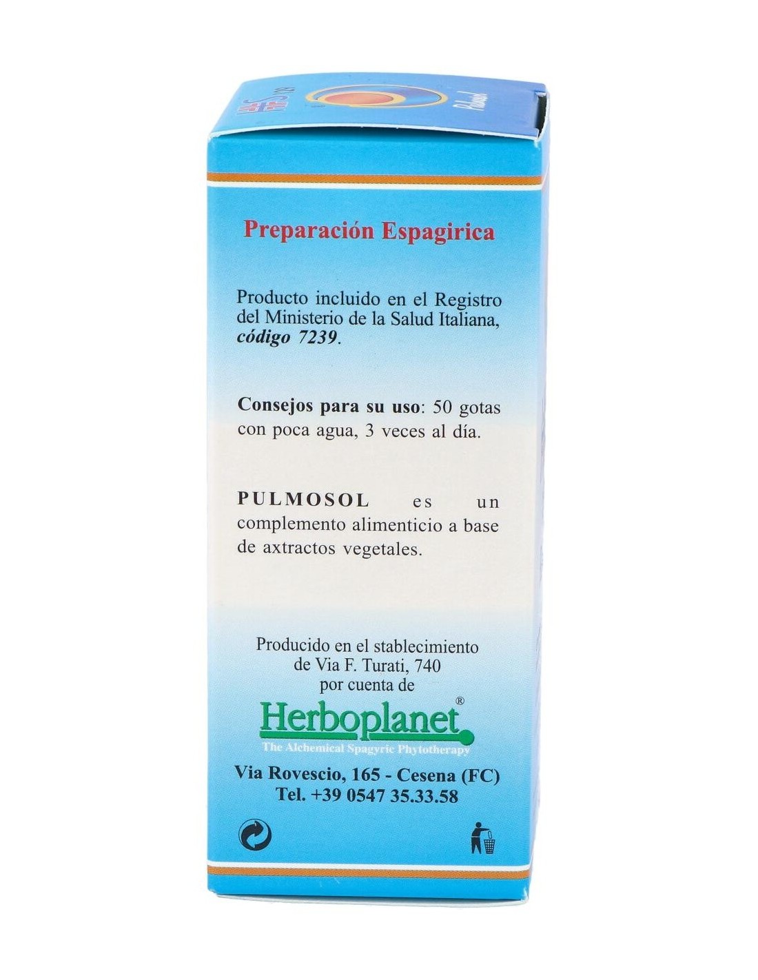 Pulmosol de Herboplanet es un complemento alimenticio a base de extractos vegetales que contribuye a la funcionalidad de la mucosa del sistema respiratorio, a la funcionalidad de las vías respiratorias superiores. Promueve el bienestar de la garganta. El MARRUBIO favorece la fluidez de las secreciones bronquiales y a la acción emoliente y calmante (funcionalidad de la mucosa orofaríngea y del tono de la voz).Pulmosol esta recomendado en casos de asma, fibrosis pulmonar, enfisema pulmonar, alergias, toses espasmódicas y nerviosas.Principios activos: