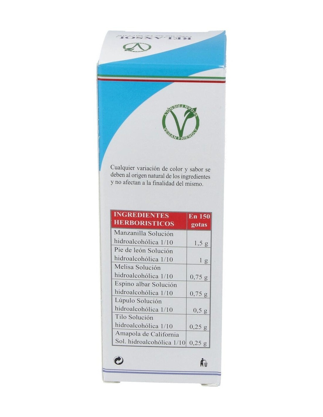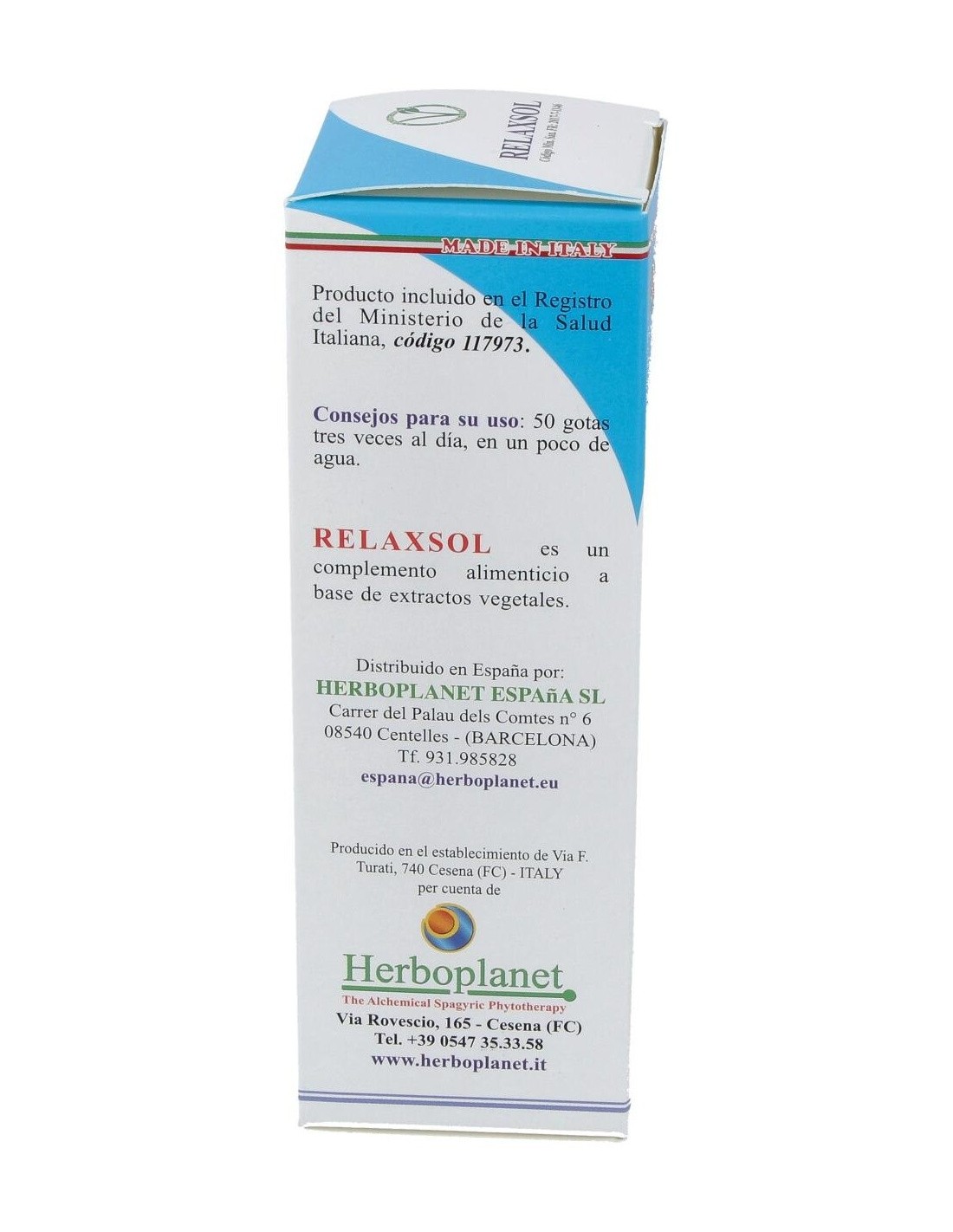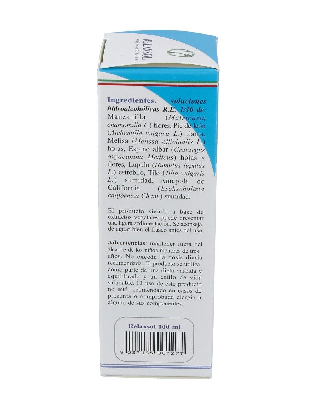 Relaxsol es un complemento alimenticio a base de ingredientes vegetales que promueve la relajación, el sueño y el bienestar mental. Además de ser un antioxidante, promueve la función digestiva y la eliminación de los gases. Útil para la relajación y el bienestar mental, así como para recuperar el estado de ánimo normal. El lúpulo, el tilo y la amapola de california promueven el sueño y la relajación en caso de estrés. El espino albar contribuye a la regularidad de la presión arterial.Principios activos: