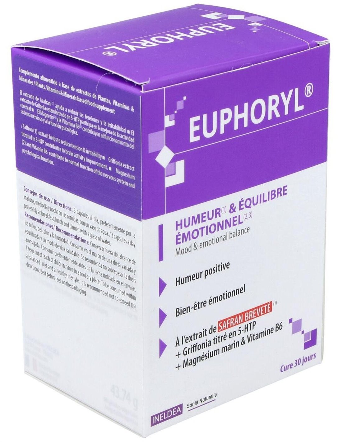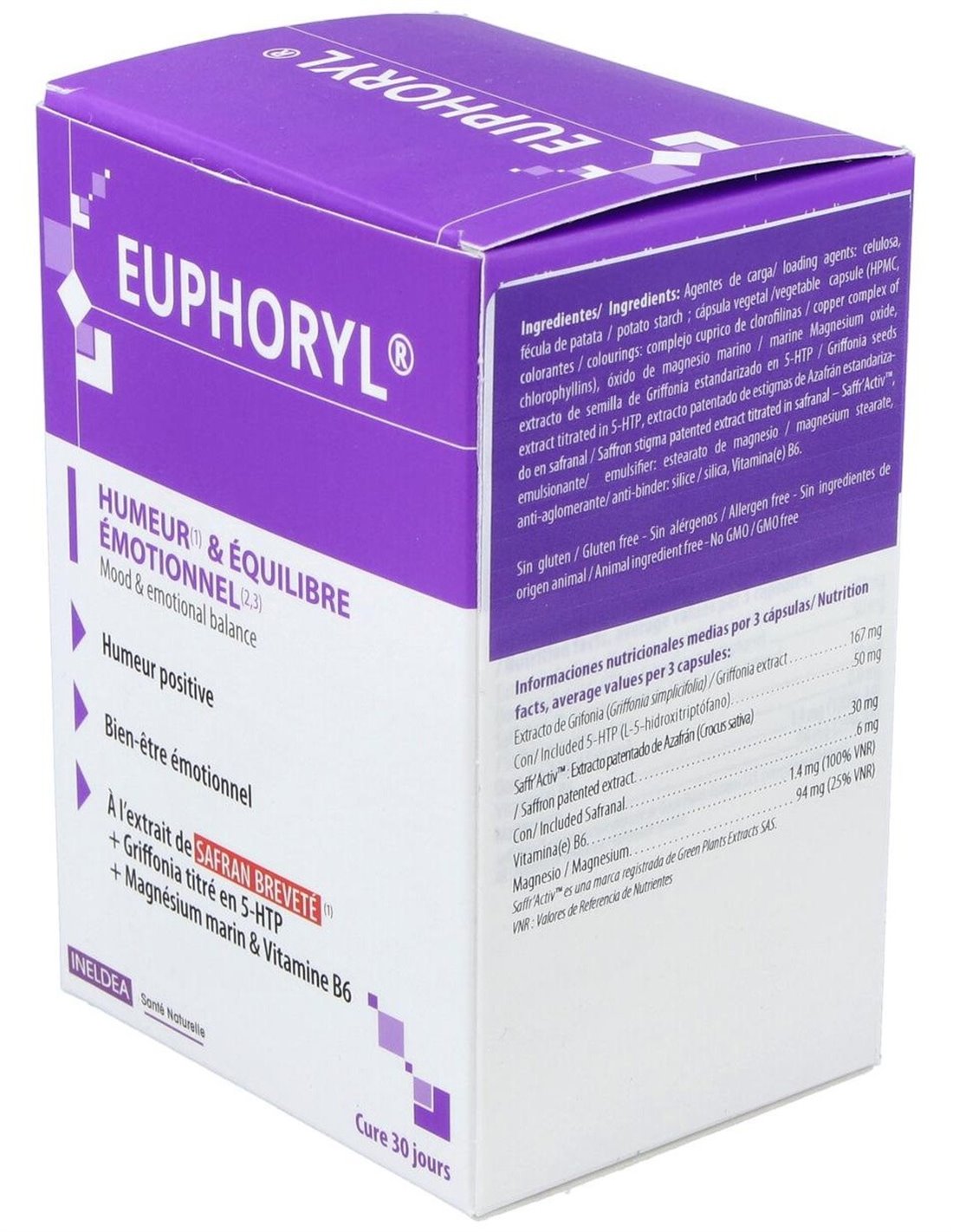 El Ins Euphoryl Safranal 5Htp 90Cap. de Ineldea es un suplemento para adultos que busca apoyar el bienestar emocional mediante una fórmula que combina 5-HTP y safranal.