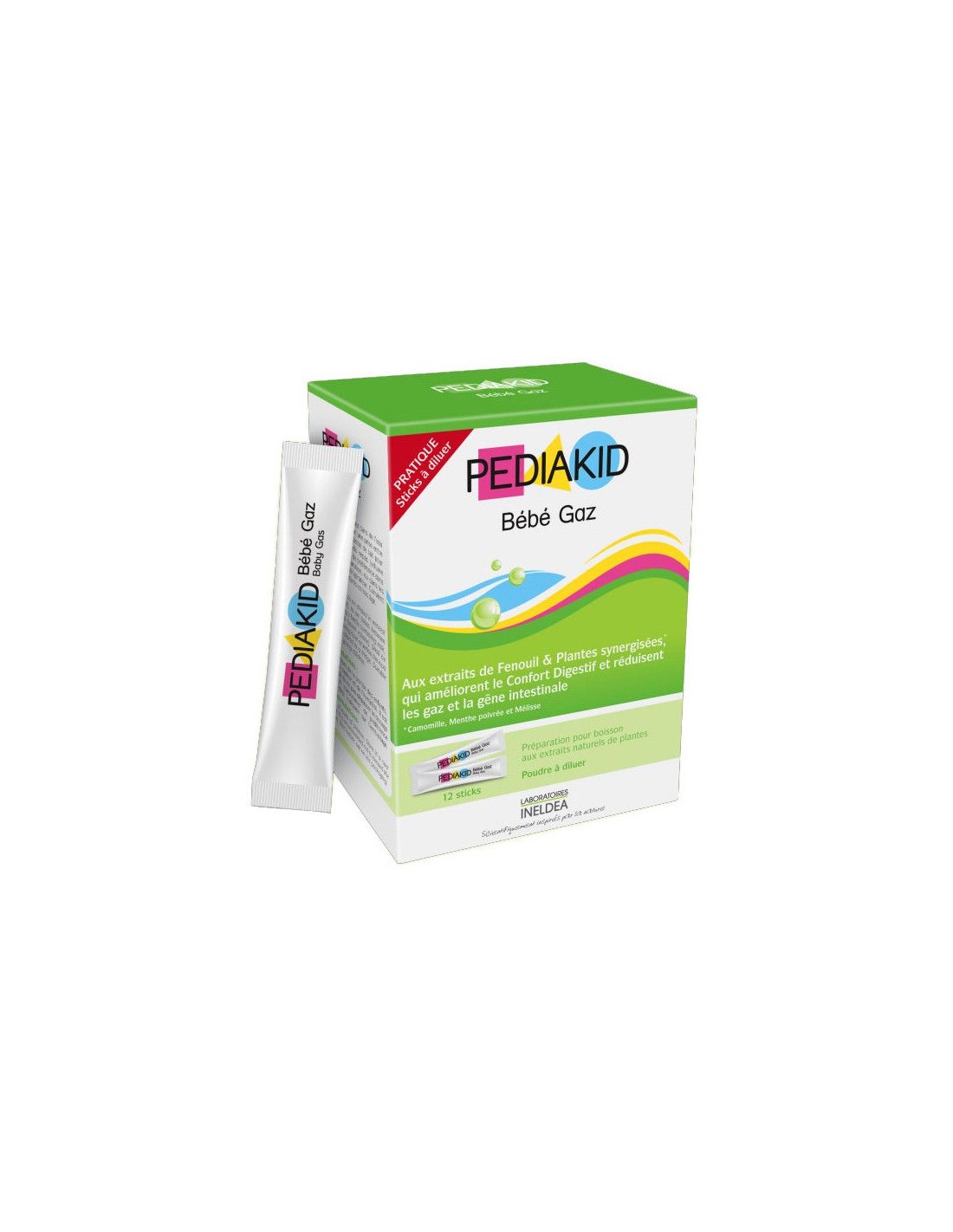 Ingredientes:Agente de carga maltodextrina, inulina, dextrosa, extracto de hinojo (fruta), extracto de las partes aéreas de extracto de menta hojas de toronjil, extracto de flores de manzanilla, emulsionante: dióxido de silicio.Modo de empleo:Tomar 1 o 2 sticks al día, diluido en agua mineral (20 a 30 ml) para tomar entre las comidas o en el biberón de leche para tomar entre la comida (volumen habitual). Consumir preferentemente dentro de una hora siguiente a la preparación, o de 12 horas si se mantiene refrigerado.Presentación:Envase de 12 sticksRecomendaciones y advertencias:No contiene gluten.