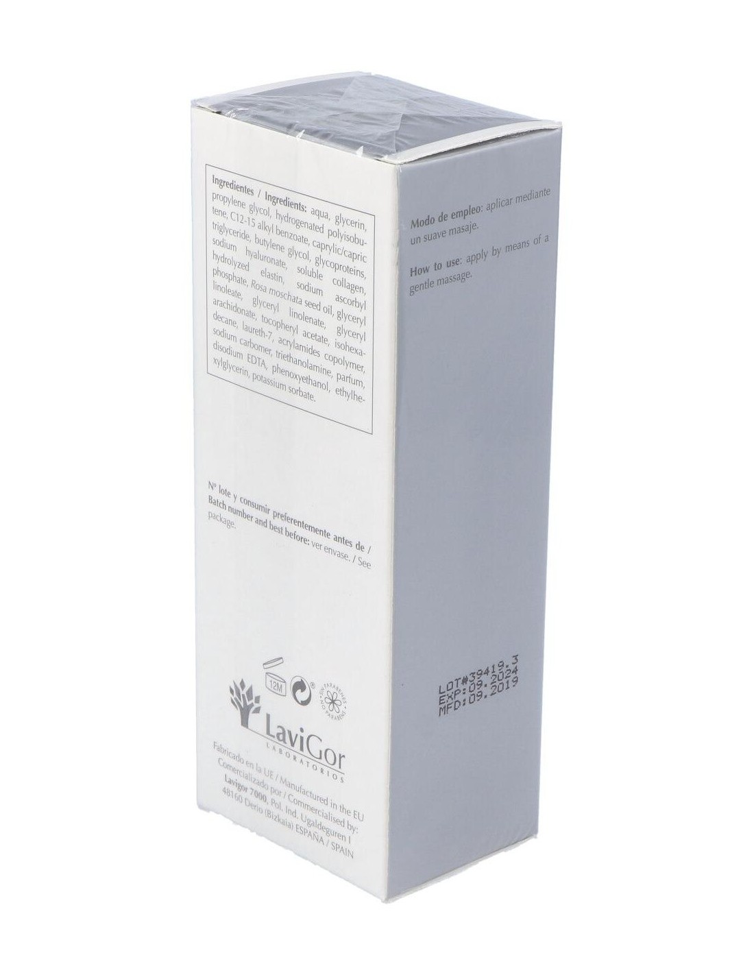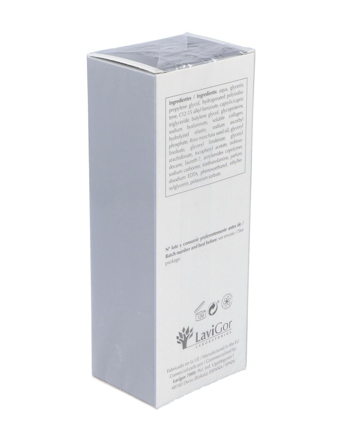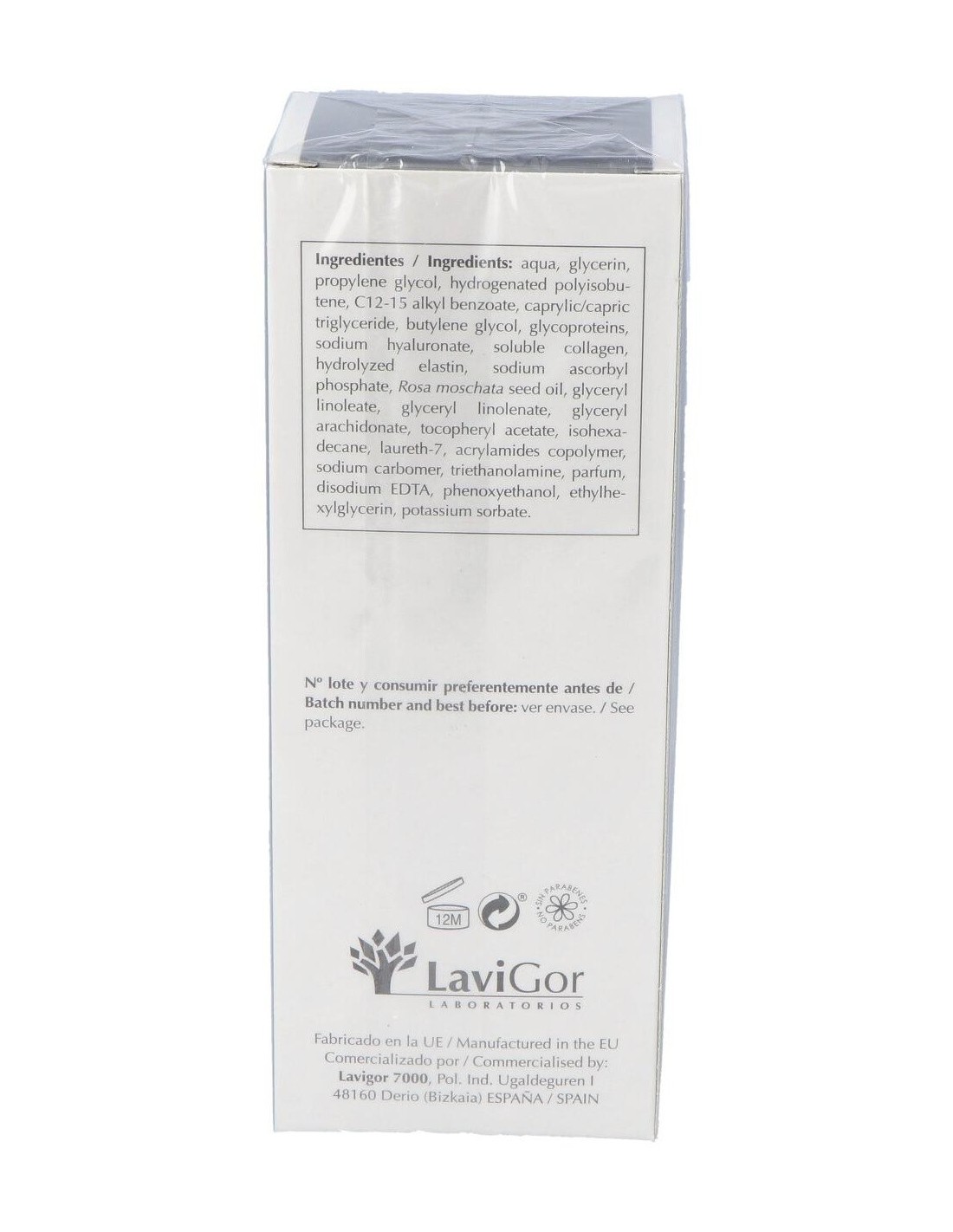 Proteoglicanos, ácido hialurónico puro, colágeno, elastina, rosa mosqueta, vitaminas C, E y F.