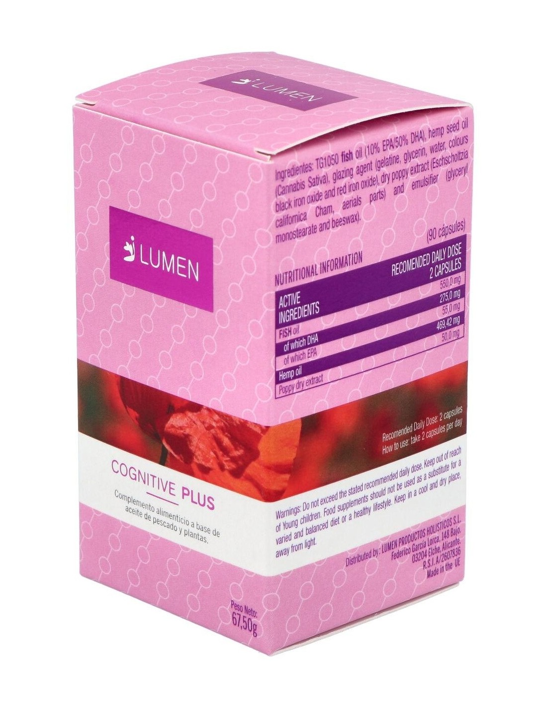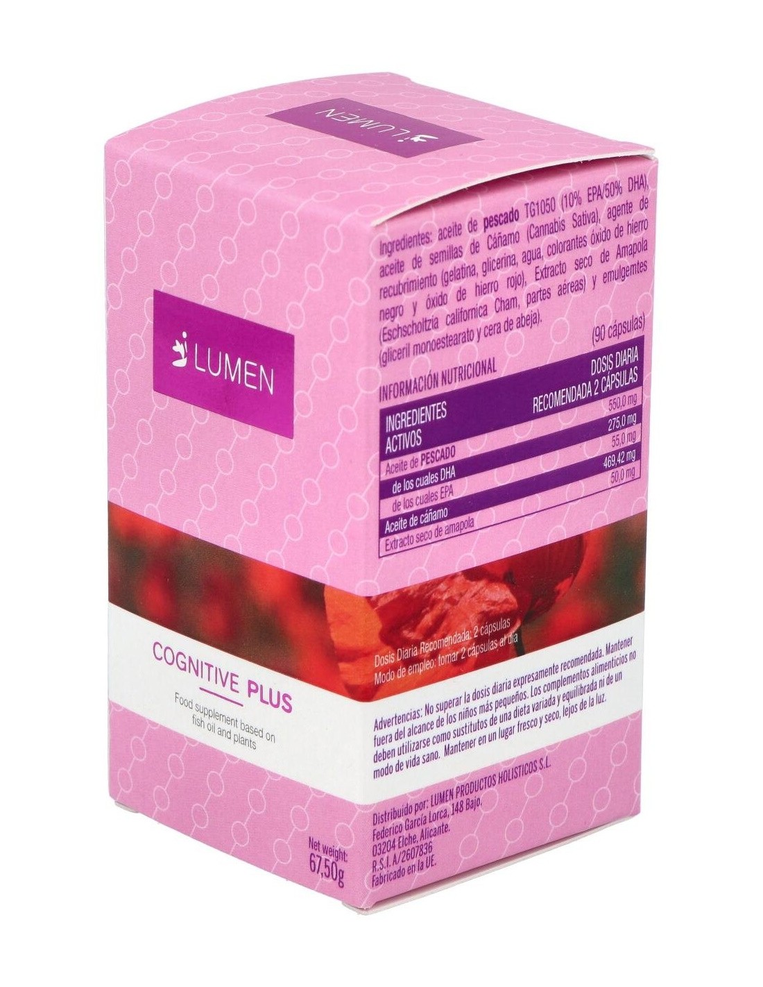 Fórmula a base de aceite de pescado (DHA y EPA), extracto de cáñamo y amapola. Presentada en perlas duras. Elaborada para mejorar las funciones cognitivas.