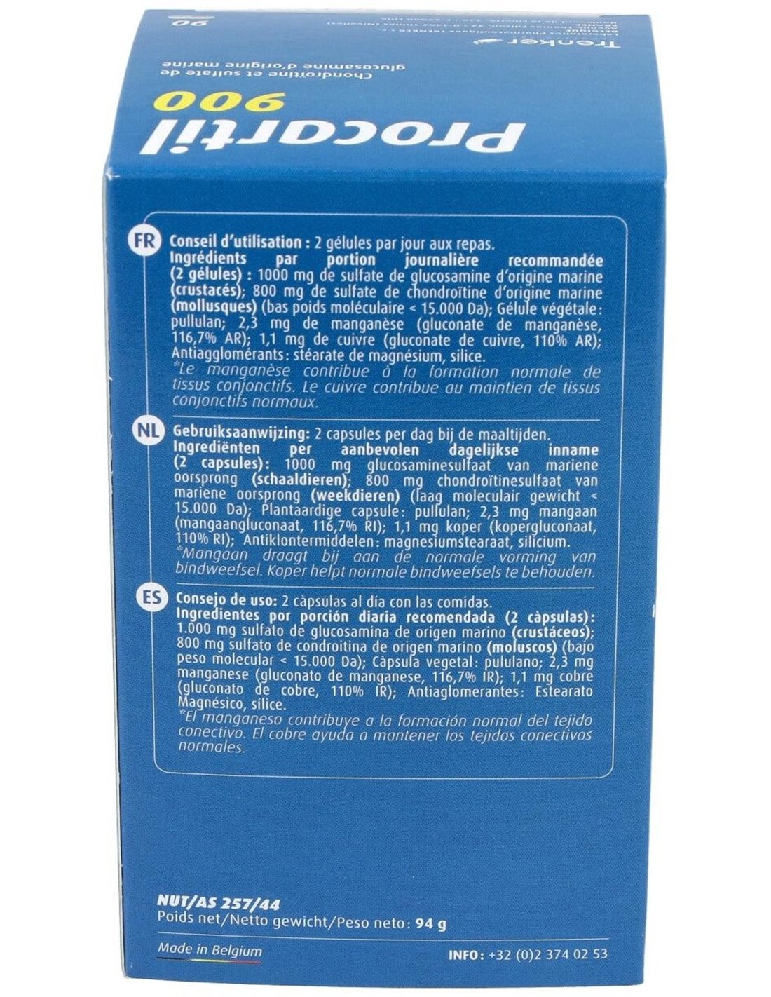 La glucosamina, que se produce naturalmente en nuestro organismo, es una materia prima necesaria para la construcción del cartílago y otros tejidos conectivos. Desempeña un importante papel en la amortiguación de las articulaciones. La glucosamina ayuda a mantener la salud de las articulaciones, huesos, ligamentos y tendones. Un suplemento de glucosamina ayuda a mantener las articulaciones sanas. Tanto la glucosamina como la condroitina son dos sustancias son sintetizadas por nuestro organismo pero con la edad nuestra capacidad de respuesta disminuye y son necesarios los aportes externos. Para completar la fórmula y mejorar su eficacia se han incorporado el gluconato de cobre y el gluconato de manganeso, que actúan actúan mejorando el aprovechamiento de la glucosamina y de la condroitina en el organismo. La asociación de todos estos ingredientes activos hacen de Procartil 900 un suplemento ideal para la protección y recuperación de los cartílagos. Procartil 900 permite una mejor lubricación de las articulaciones, en consecuencia, una disminución muy apreciable del problema articular y de sus consecuencias. Ingredientes activos por cápsula: