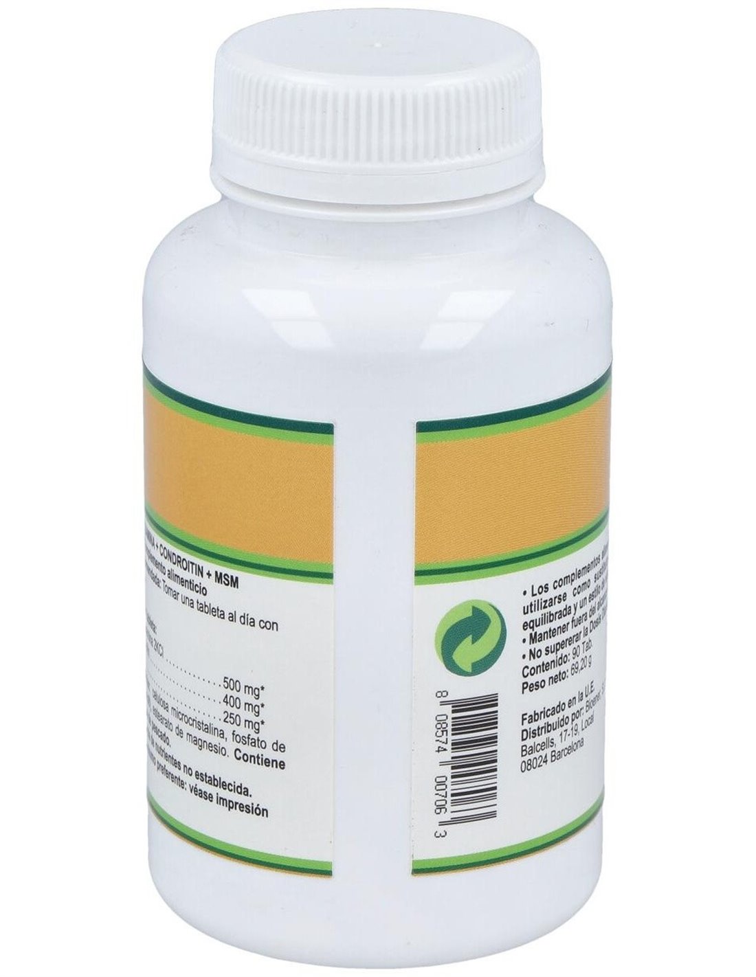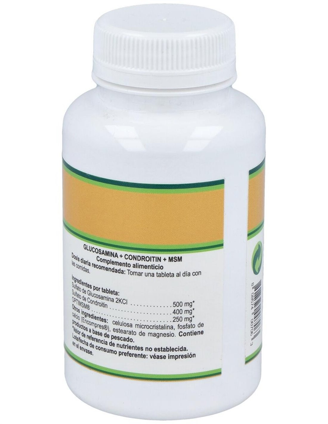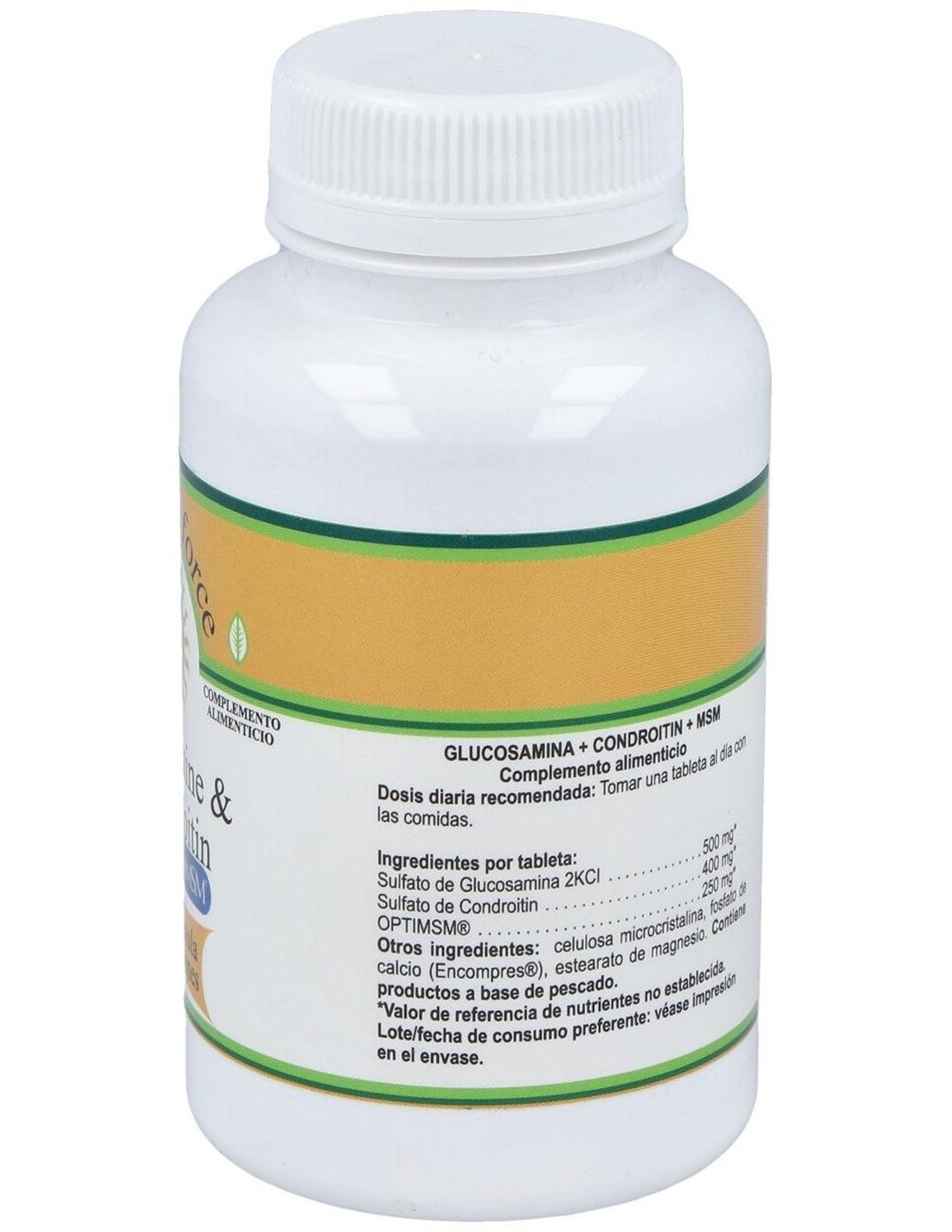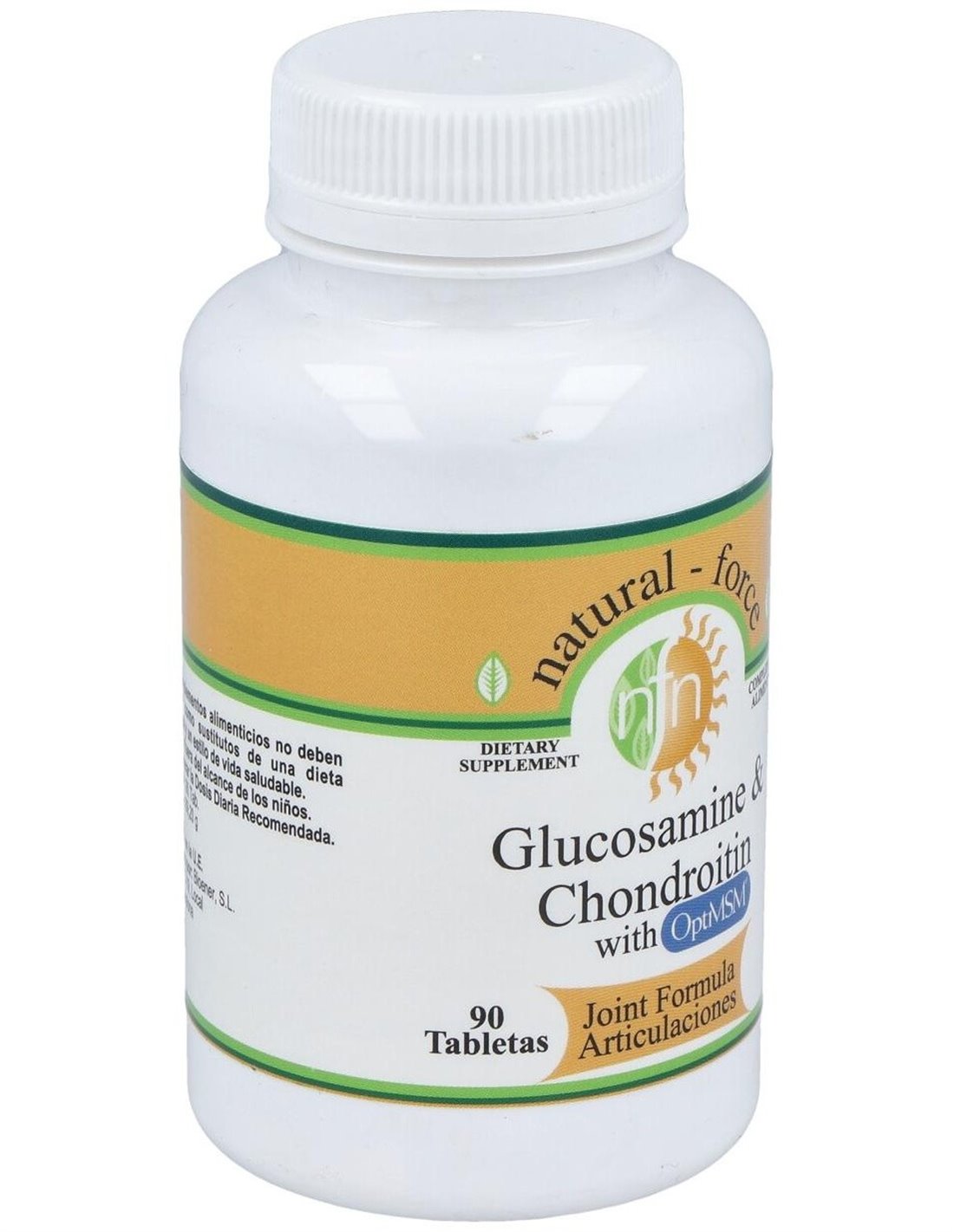 Por 1 comprimido: Sulfato de glucosamina ... 500 mg. Sulfato de condroitina ... 400 mg. MSM (metilsulfonilmetano) en polvo ... 250 mg. Dióxido de silicio, maltodextrina, croscarmelosa sódica, ácido esteárico y estearato de magnesio.