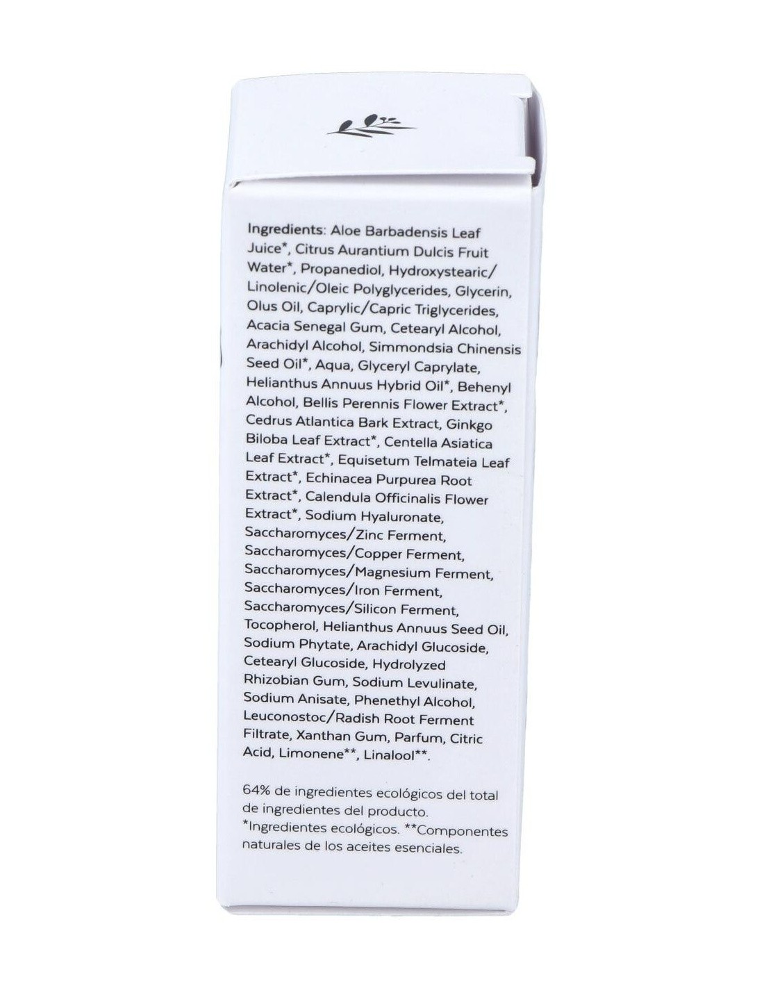 Aloe Barbadensis Leaf Juice*, Citrus Aurantium Dulcis Fruit Extract*, Propanediol, Hydroxystearic/Linolenic/Oleic Polyglycerides, Olus Oil, Acacia Senegal gum, Cedrus Atlantica Bark Extract, Caprylic/Capric Triglyceride, Cetearyl Alcohol, Arachidyl Alcohol, Simmondsia Chinensis Seed Oil*, Aqua, Behenyl Alcohol, Glyceryl Caprylate, Bellis Perennis Flower Extract*, Glycerin, Ginkgo Biloba Leaf Extract*, Centella Asiatica Leaf Extract, Equisetum Arvensis Leaf Extract*, Equinacea Purpurea Root Extract*, Calendula Officinalis Flower Extract*, Sodium Hyaluronate, Saccharomyces/Zinc Ferment, Saccharomyces/Copper Ferment, Saccharomyces/Magnesium Ferment, Saccharomyces/Iron Ferment, Saccharomyces/Silicon Ferment, Hydrolyzed Rhizobian Gum, Tocopherol, Helianthus Annuus Seed Oil, Arachidyl Glucoside, Sodium Levulinate, Sodium Phytate, Cetearyl Glucoside, Xanthan Gum, Parfum, Citric Acid.