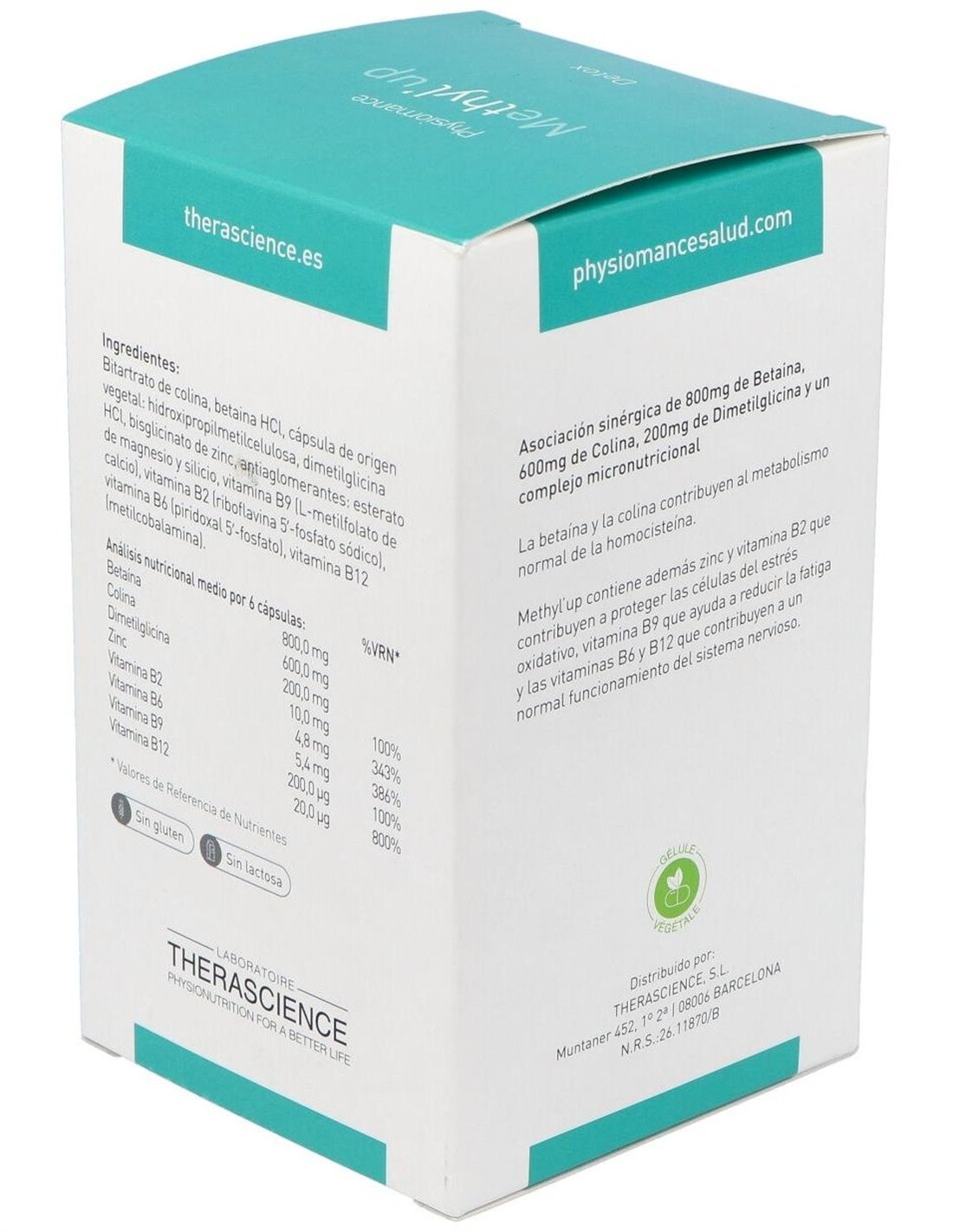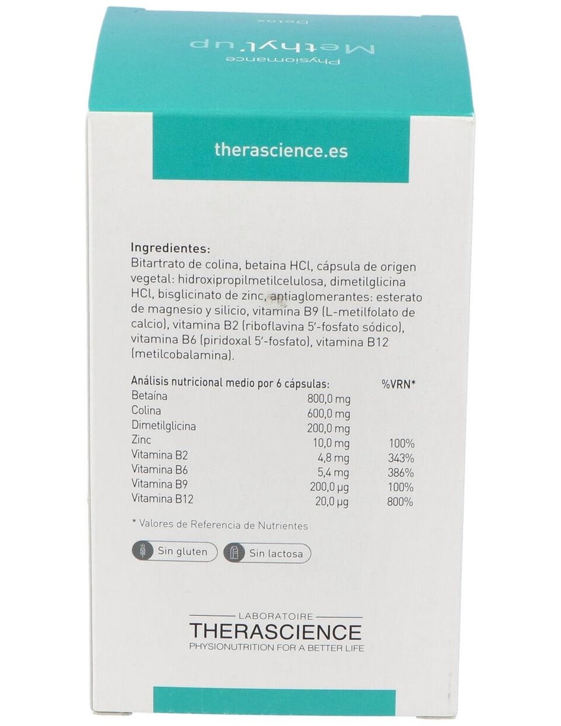 Bitartrato de colina, betaina HCl, cápsula de origen vegetal :hidroxipropilmetilcelulosa, dimetilglicina HCl, bisglicinato de zinc, antiaglomerantes : esterato de magnesio y silicio, vitamina B9 (L- ?metilfolato de calcio), vitamina B2 (riboflavina 5´-fosfato sódico), vitamina B6 (piridoxal 5´-fosfato), vitamina B12 (metilcobalamina).