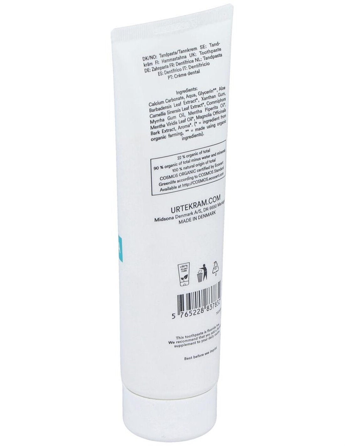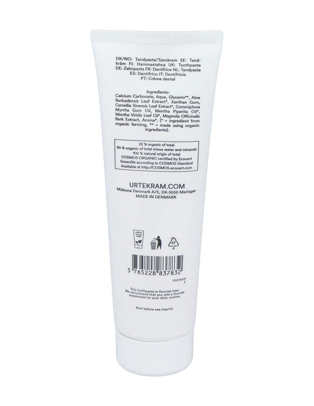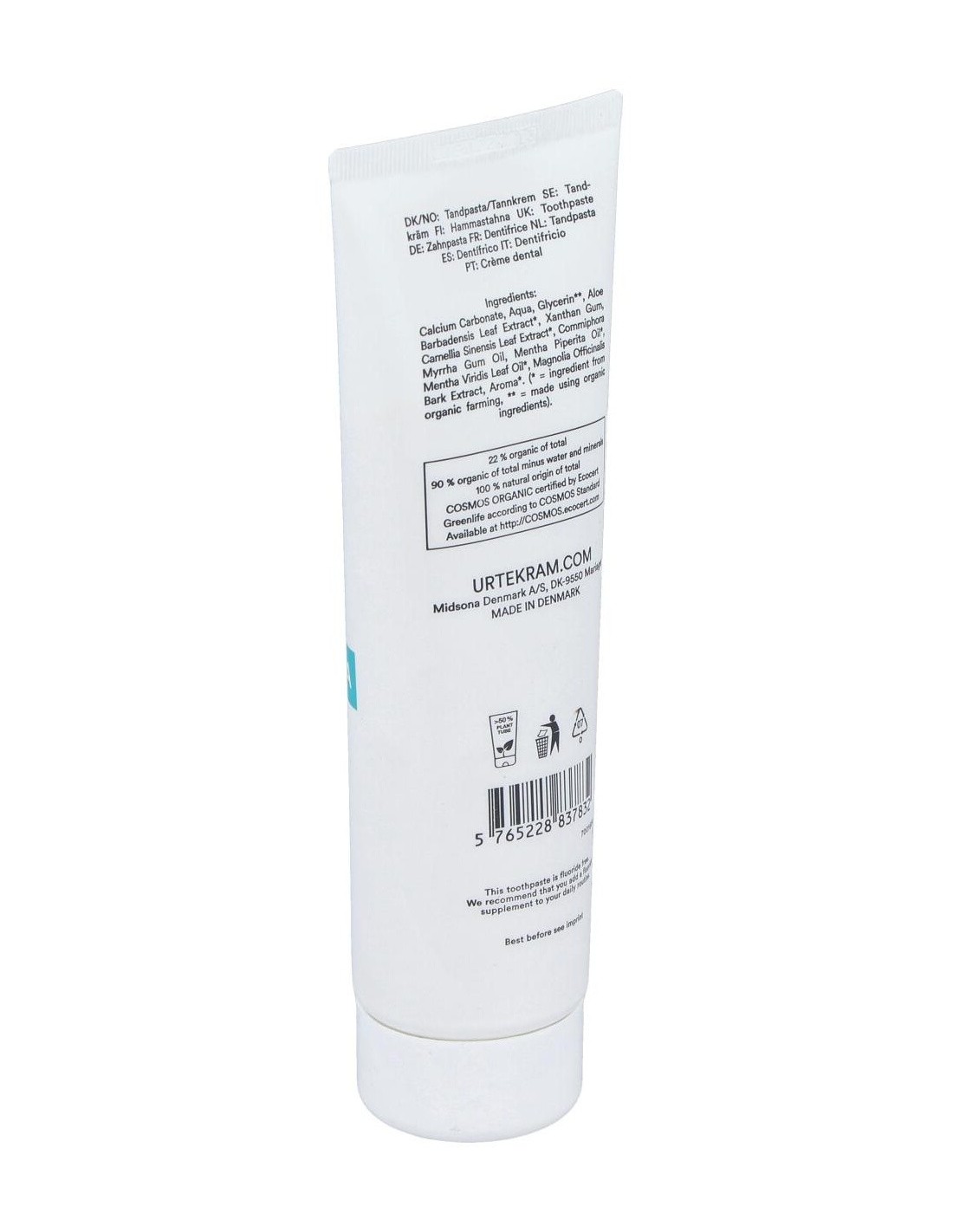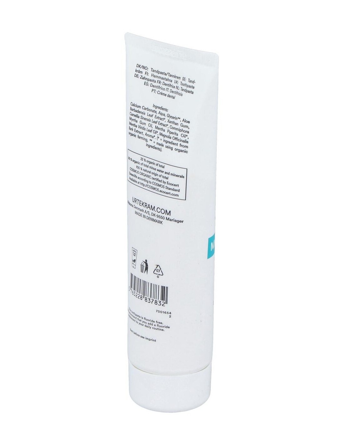 Dentífrico con menta y té verde. Sin flúor. Eficaz en los diferentes aspectos del cepillado. La creta que contiene se recupera del fondo marino y se pulveriza. Por eso la pasta tiene color natural Al sabor fresco de la menta se une el té verde. Los polifenoles del té verde tienen un efecto positivo sobre los dientes y las encías. El alto contenido de aloe vera ayuda a proteger las encías. El toque final es la mirra que tiene un efecto desinfectante. COSMOS ORGANIC certificado por Ecocert Greenlife. Vegano. No testado con animales.