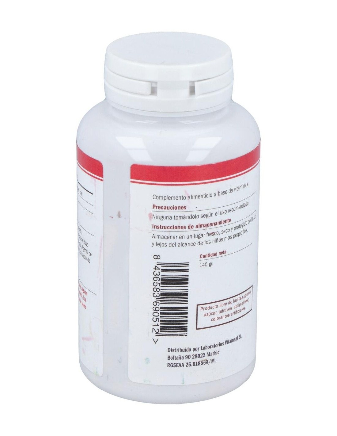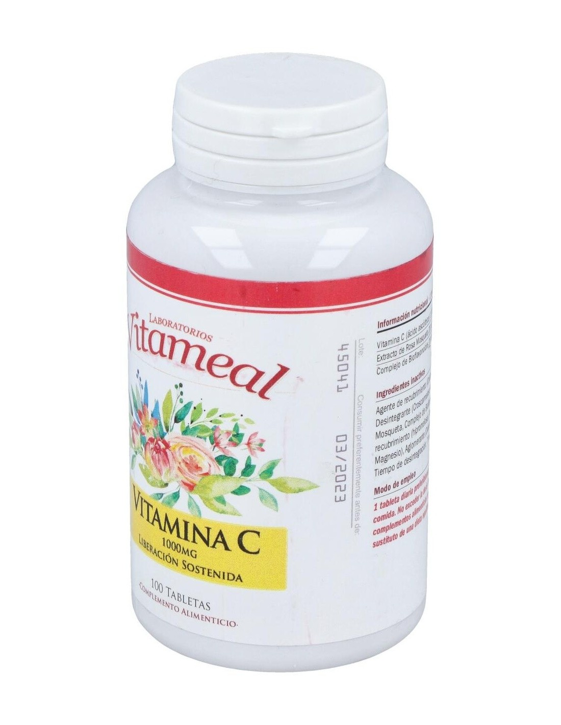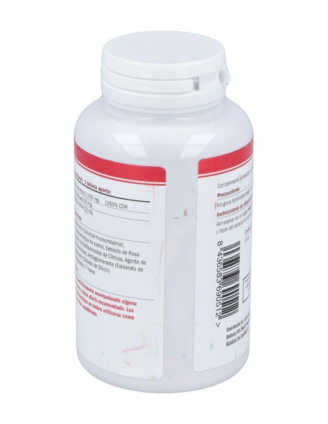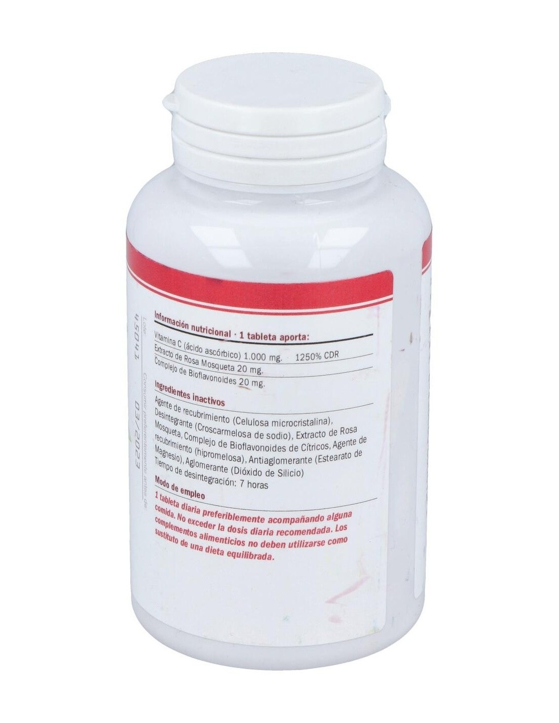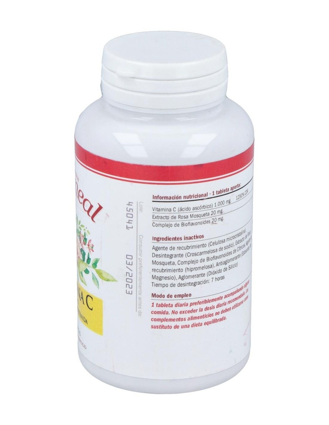 Ingredientes:Ácido L-ascórbico (vitamina C), Agente de recubrimiento (Celulosa microcristalina), Extracto de Rosa Mosqueta (Rosa rubiginosa), Complejo de Bioflavonoides de Cítricos (fruto del Citrus aurantium, Citrus limon y Citrus sinensis), Agente de recubrimiento (hidroxipropilmetilcelulosa), Antiaglomerante (Dióxido de Silicio, Sales magnesicas de ácidos grasos), Agentes de recubrimiento (hidroxipropilmetilcelulosa y alcohol polivinílico).Modo de empleo:Tomar 1 comprimido por día, preferiblemente con alimentos.Presentación:Envase de 100 comprimidos.
