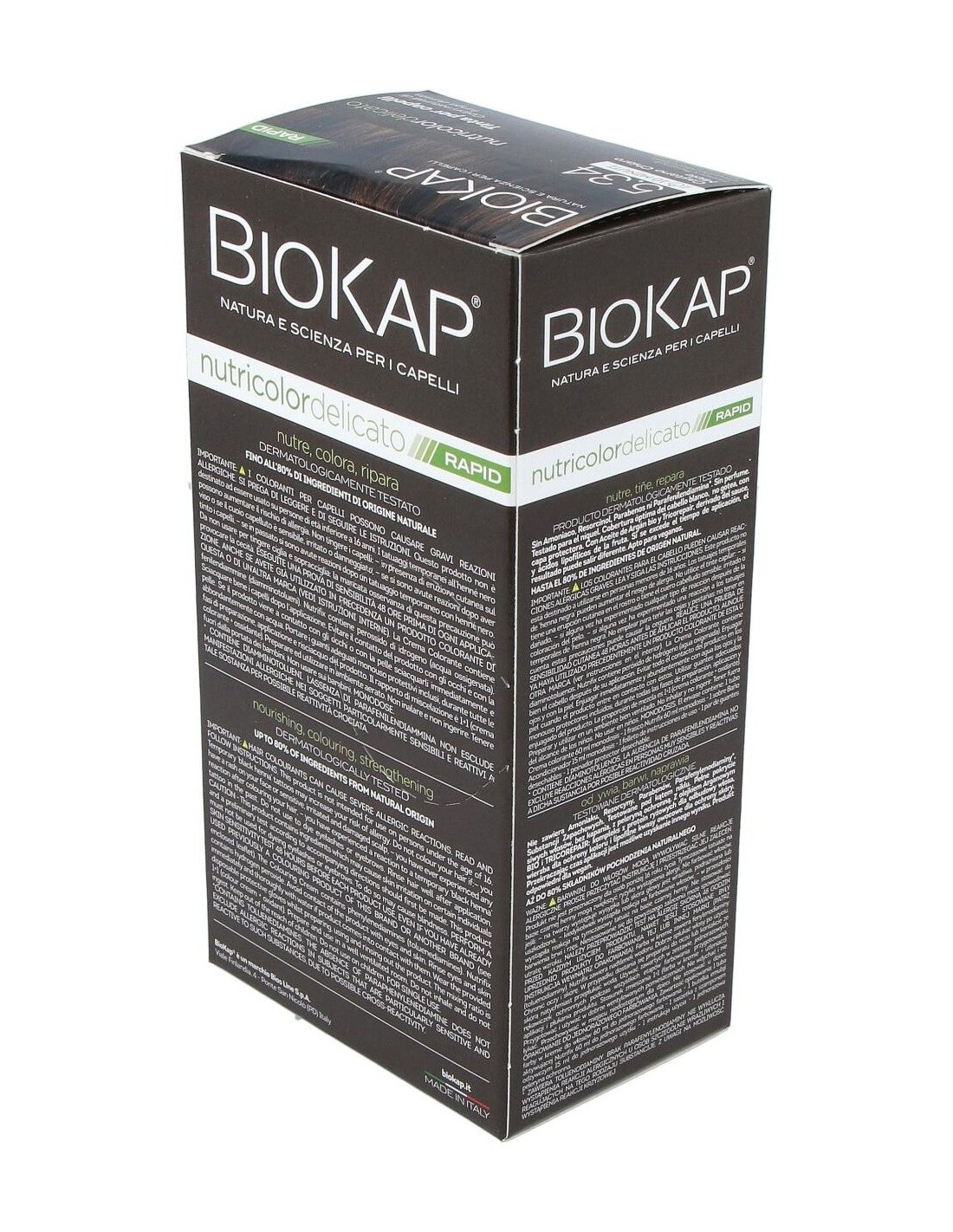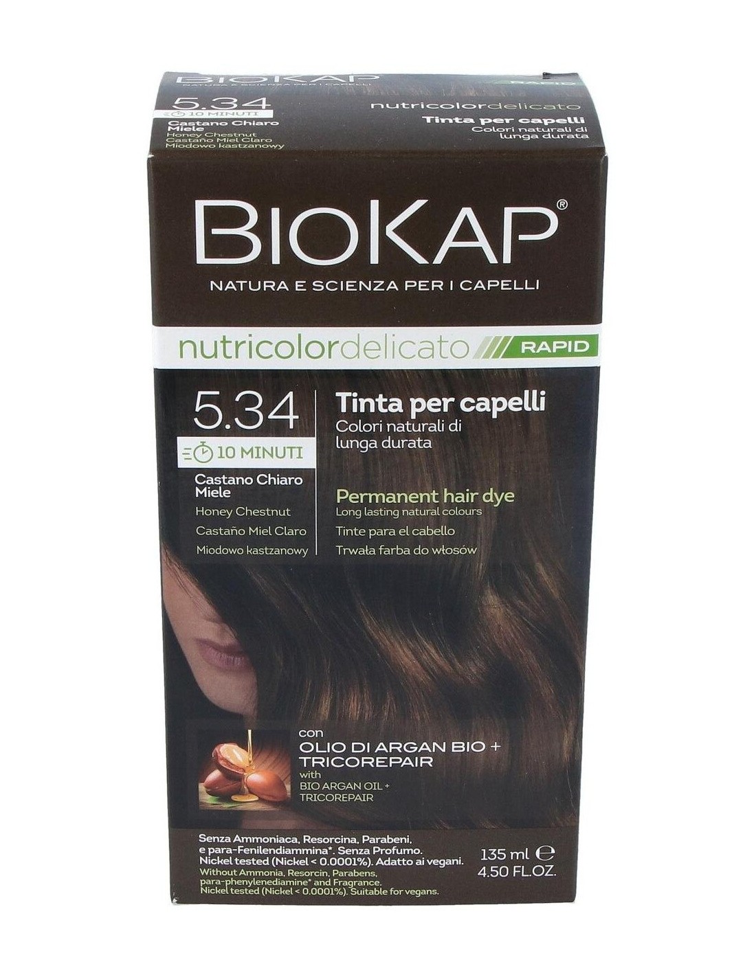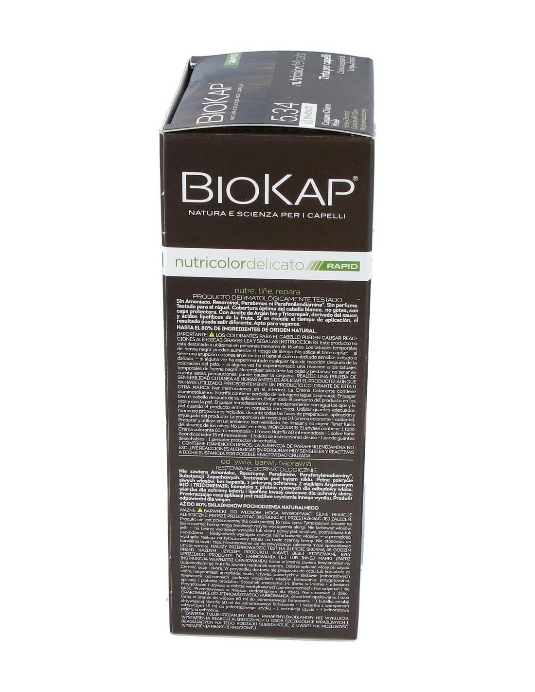 El Rapid delicato 5,34 Castaño Miel de Biokap es un tinte capilar para quienes buscan un color castaño miel natural, formulado con ingredientes que cuidan el cabello durante el proceso de coloración.