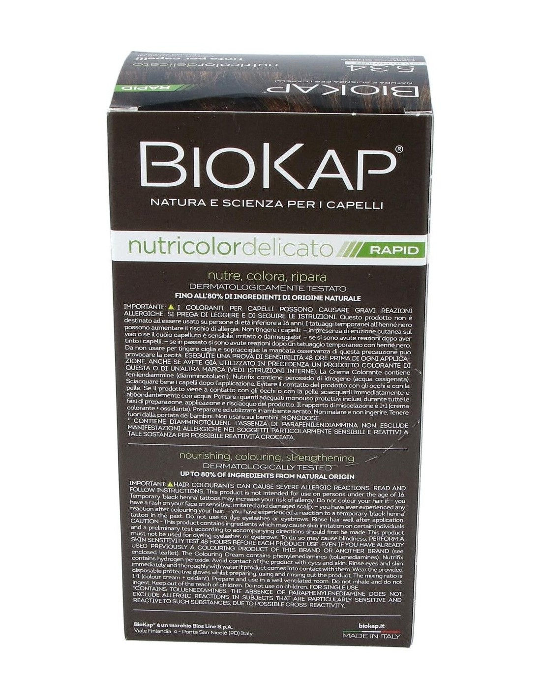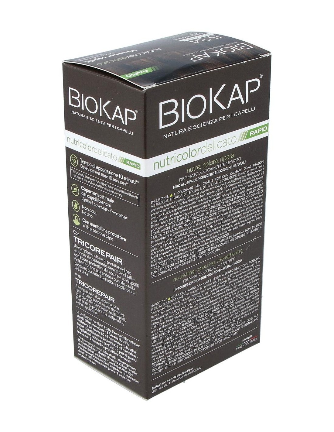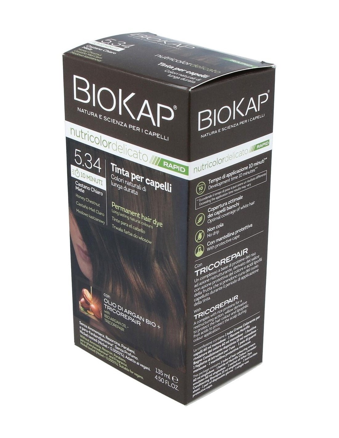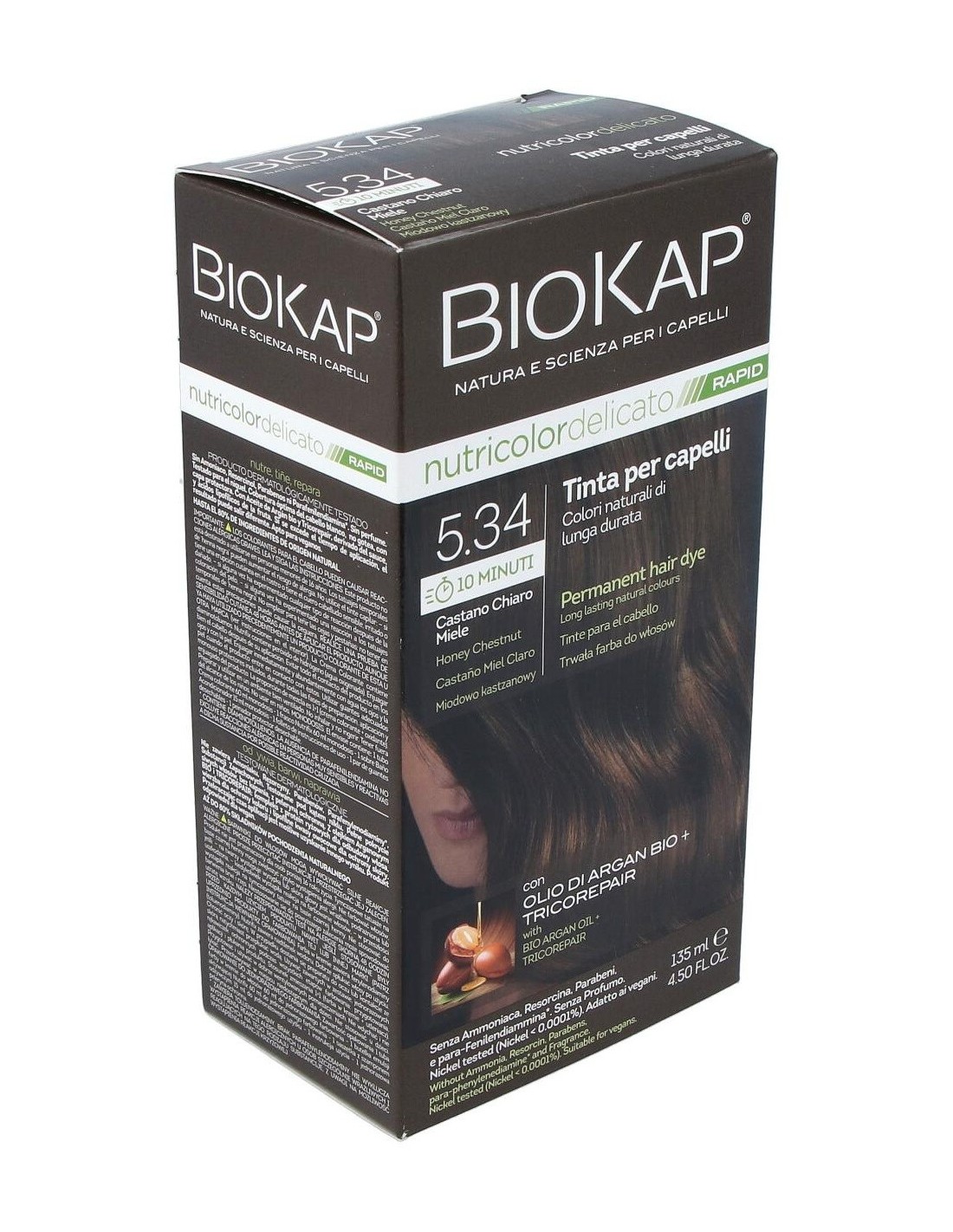 El Rapid delicato 5,34 Castaño Miel de Biokap es un tinte capilar para quienes buscan un color castaño miel natural, formulado con ingredientes que cuidan el cabello durante el proceso de coloración.