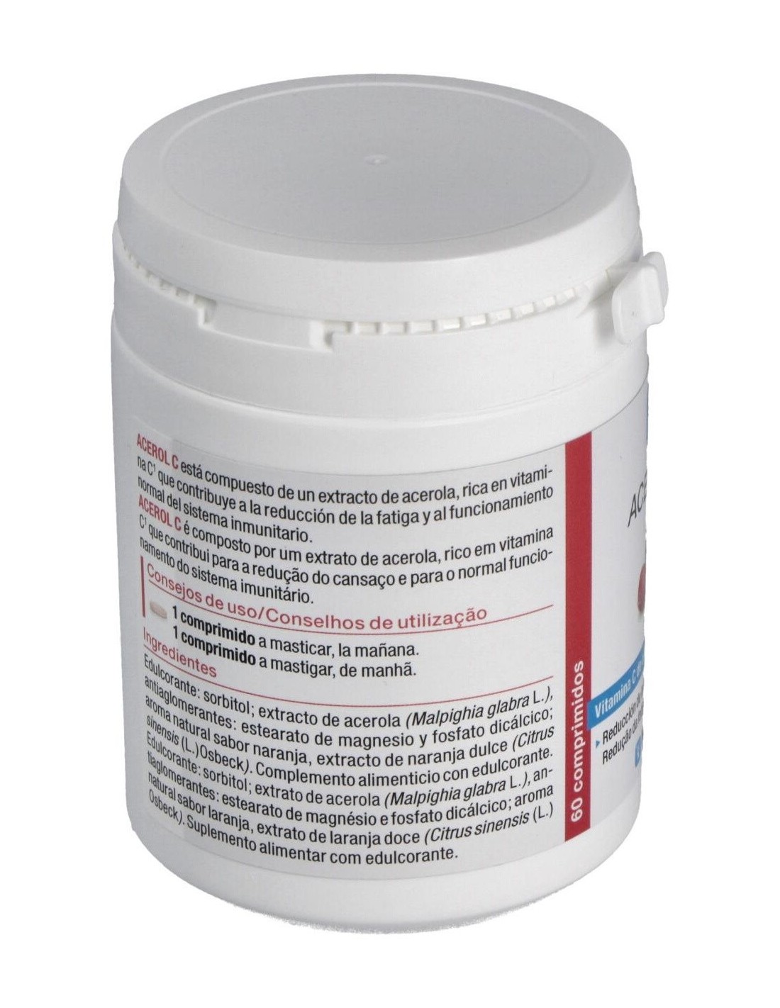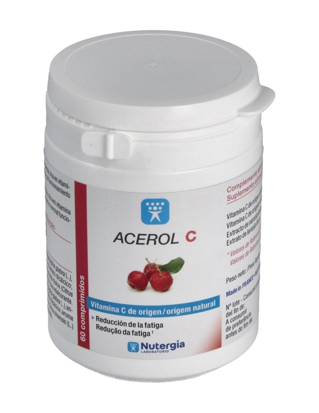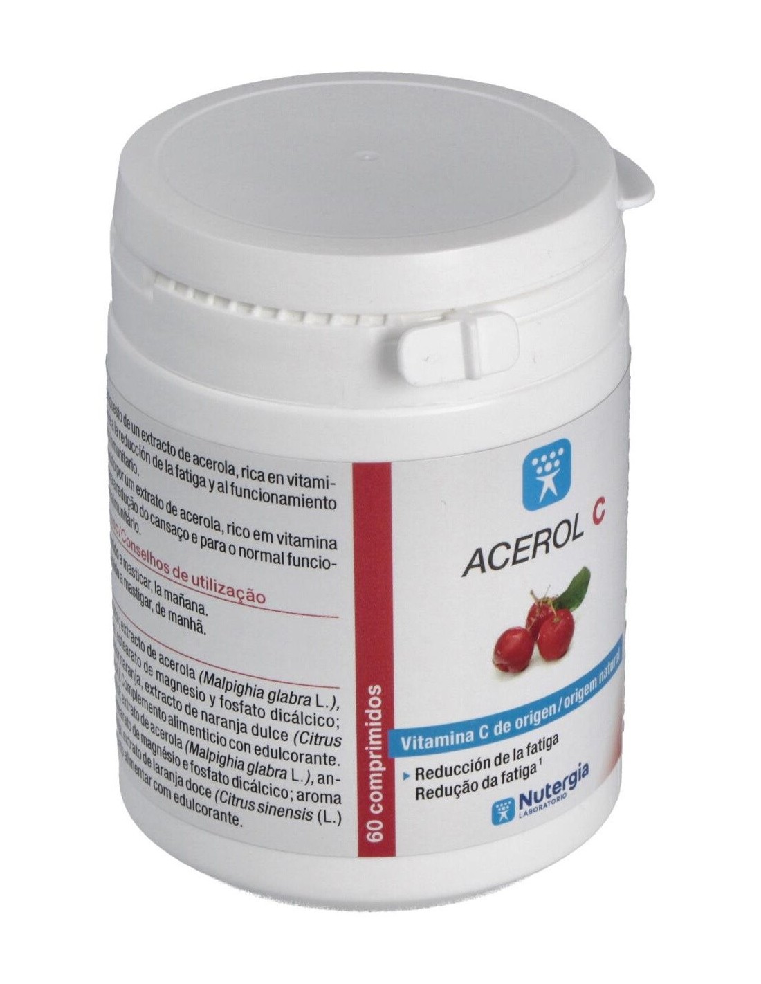 Acerol C es un extracto de acerola rico en vitamina C, que protege las células contra el estrés oxidativo, contribuye al buen funcionamiento del sistema nervioso e inmunitario, reduce la fatiga, aumenta la absorción del hierro, participa en el metabolismo energético. Composición:Extracto de acerola rico en vitamina C natural (120 mg), sabor naranja natural, estearato de magnesio, extracto de limón, sorbitol.Modo de empleo:Tomar 1 comprimido al día por la mañana.Presentación:Bote de 60 comprimidos masticables.
