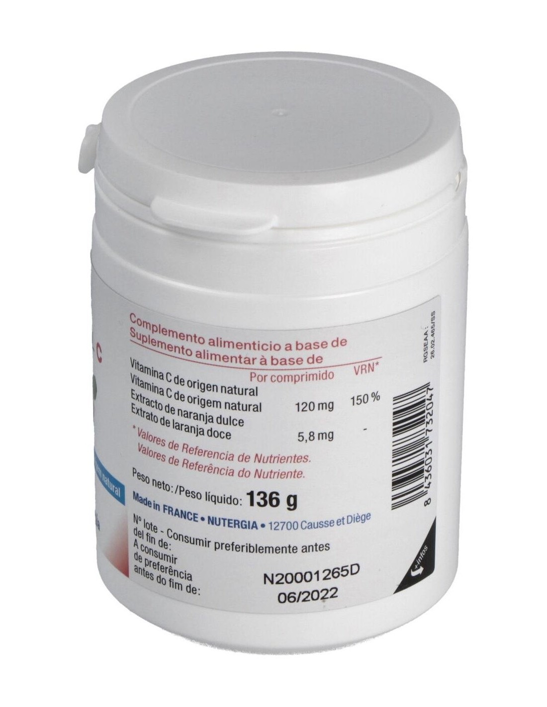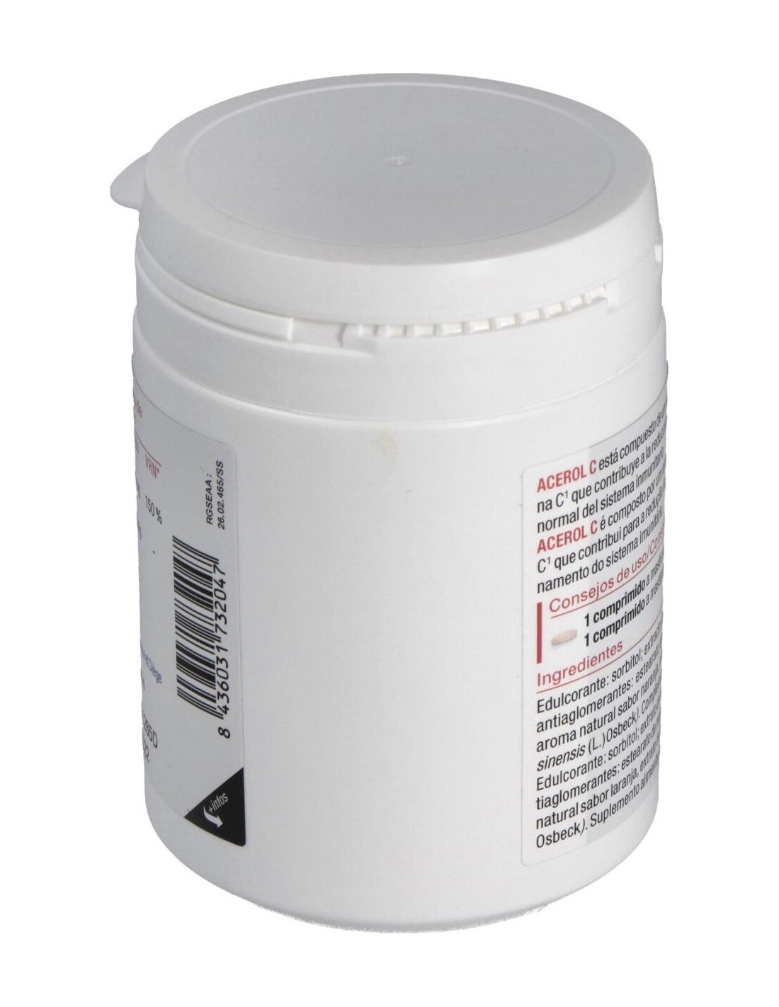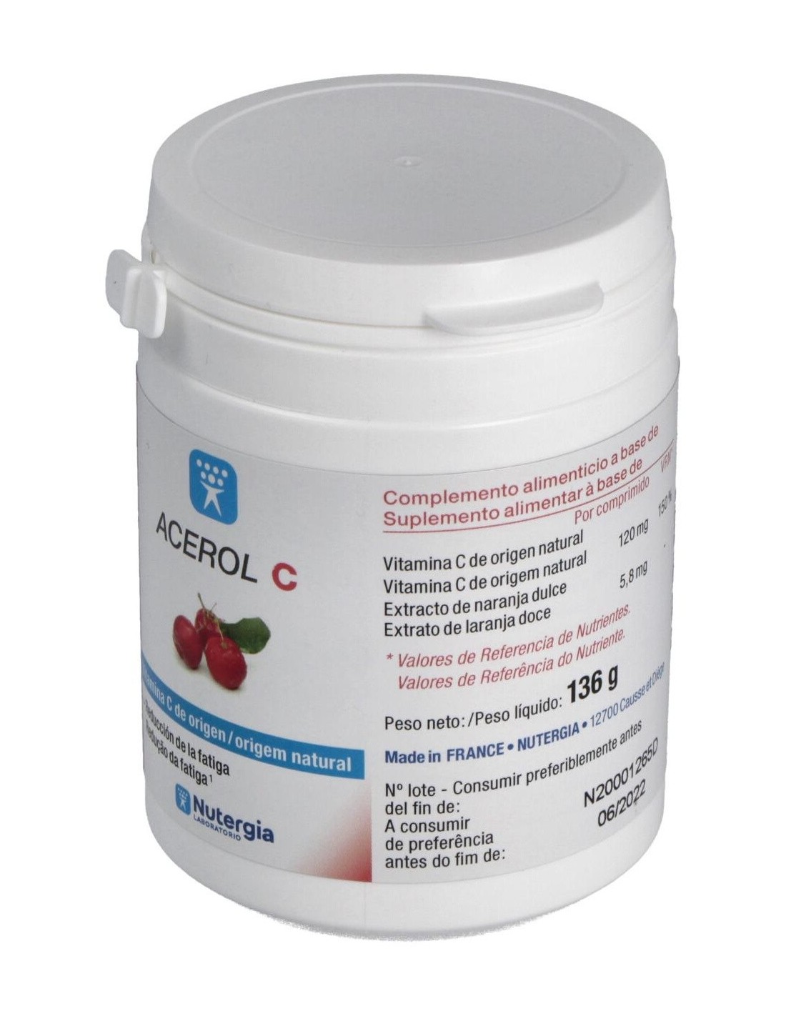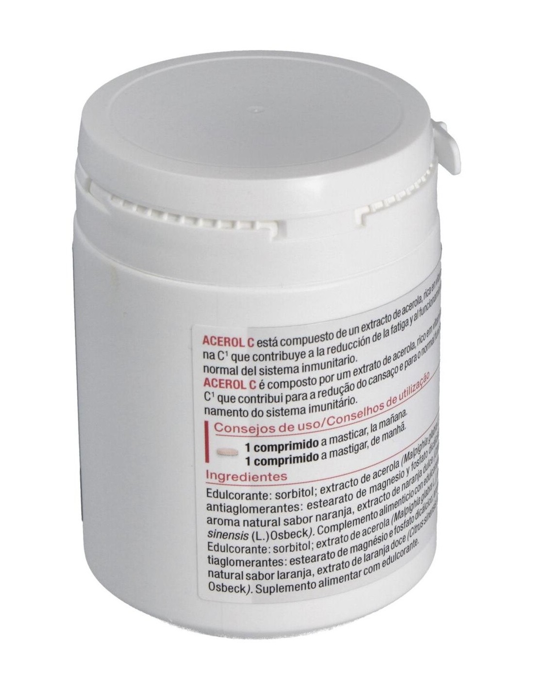 Acerol C es un extracto de acerola rico en vitamina C, que protege las células contra el estrés oxidativo, contribuye al buen funcionamiento del sistema nervioso e inmunitario, reduce la fatiga, aumenta la absorción del hierro, participa en el metabolismo energético. Composición:Extracto de acerola rico en vitamina C natural (120 mg), sabor naranja natural, estearato de magnesio, extracto de limón, sorbitol.Modo de empleo:Tomar 1 comprimido al día por la mañana.Presentación:Bote de 60 comprimidos masticables.
