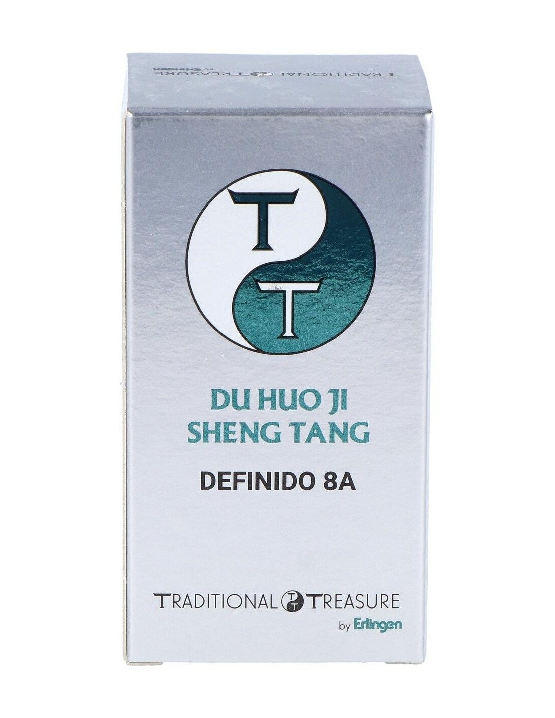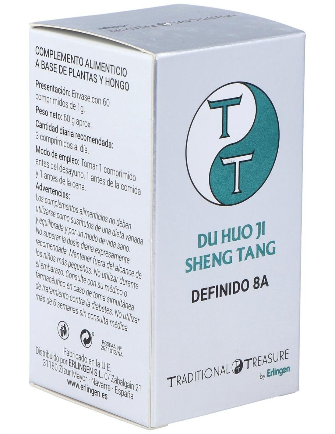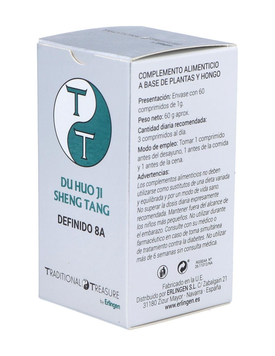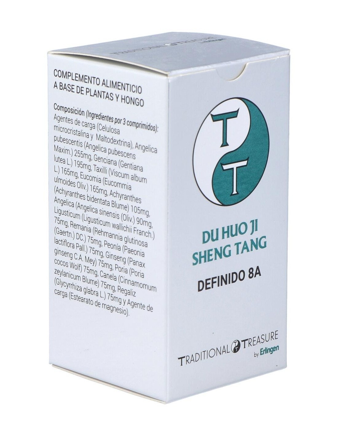 Agentes de carga (Celulosa microcristalina y Maltodextrina), Angelica pubescentis (Angelica pubescens Maxim.) 255 mg, Genciana (Gentiana lutea L.) 195 mg, Taxilli (Viscum album L.) 165 mg, Eucomia (Eucommia ulmoides Oliv.) 165 mg, Achyranthes (Achyranthes bidentata Blume) 105 mg, Angelica (Angelica sinensis (Oliv.) 90 mg, Ligusticum (Ligusticum wallichii Franch.) 75 mg, Remania (Rehmannia glutinosa (Gaertn.) DC.) 75 mg, Peonía (Paeonia lactiflora Pall.) 75 mg, Ginseng (Panax ginseng C.A. Mey) 75 mg, Poria (Poria cocos Wolf) 75 mg, Canela (Cinnamomum zeylanicum Blume) 75 mg, Regaliz (Glycyrrhiza glabra L.) 75 mg y Agente de carga (Estearato de magnesio).