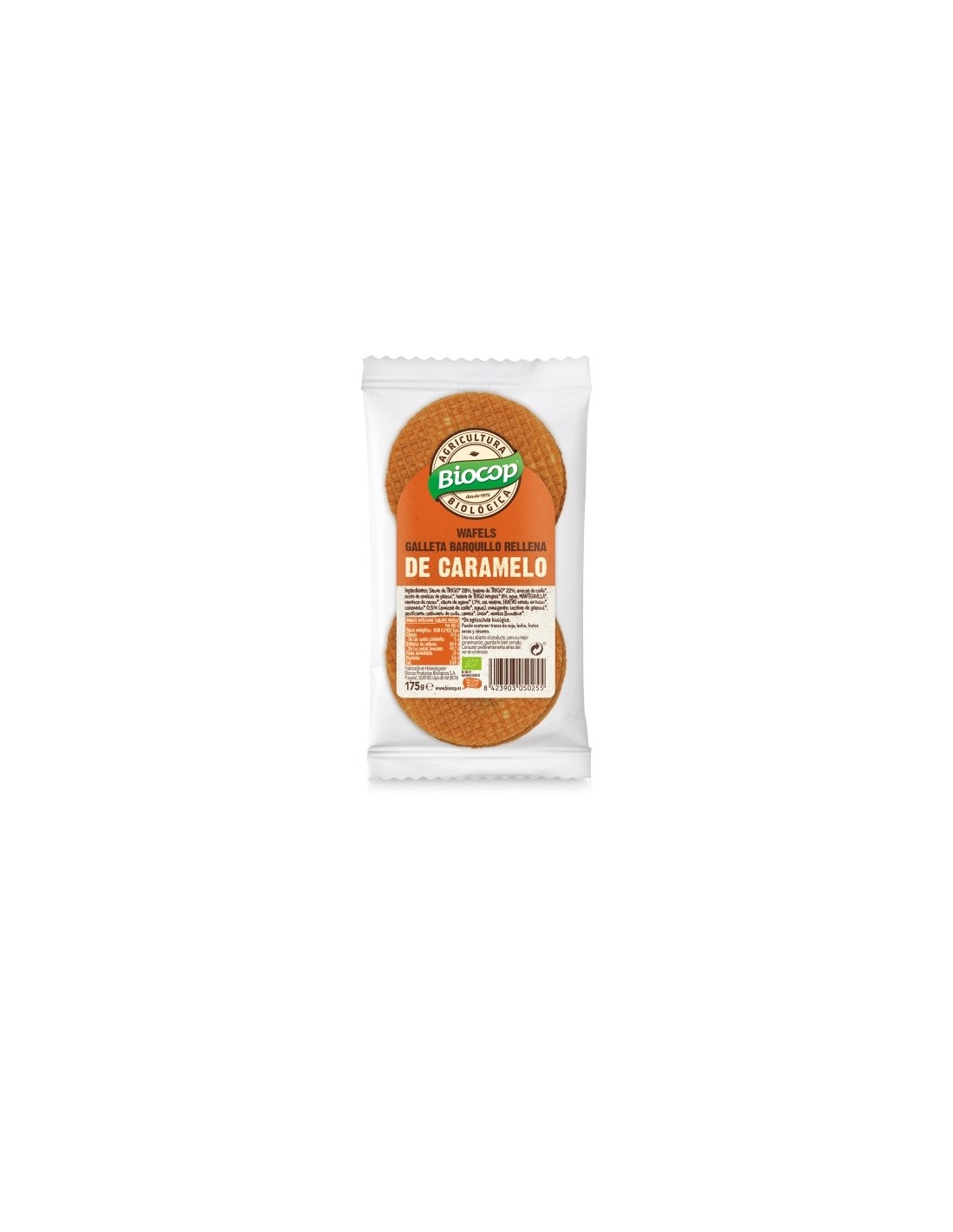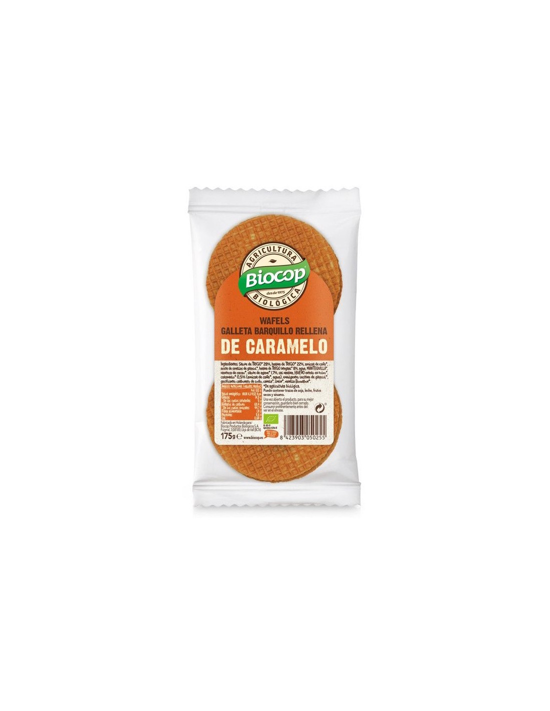 Ingredientes:Sirope de Trigo* 28%, harina de Trigo* 22%, azúcar de caña*, aceite de semillas de girasol*, harina de Trigo integral* 8%, agua, Mantequilla*, manteca de cacao*, sirope de agave* 1.7%, sal marina, Huevo entero en polvo*, caramelo* 0.5% (azúcar de caña*, agua), emulgente: lecitina de girasol*, gasificante: carbonato de sodio, canela*, limón*, vainilla Bourbon*. (*) De cultivo ecológico.Valor nutricional por 100 gramos: