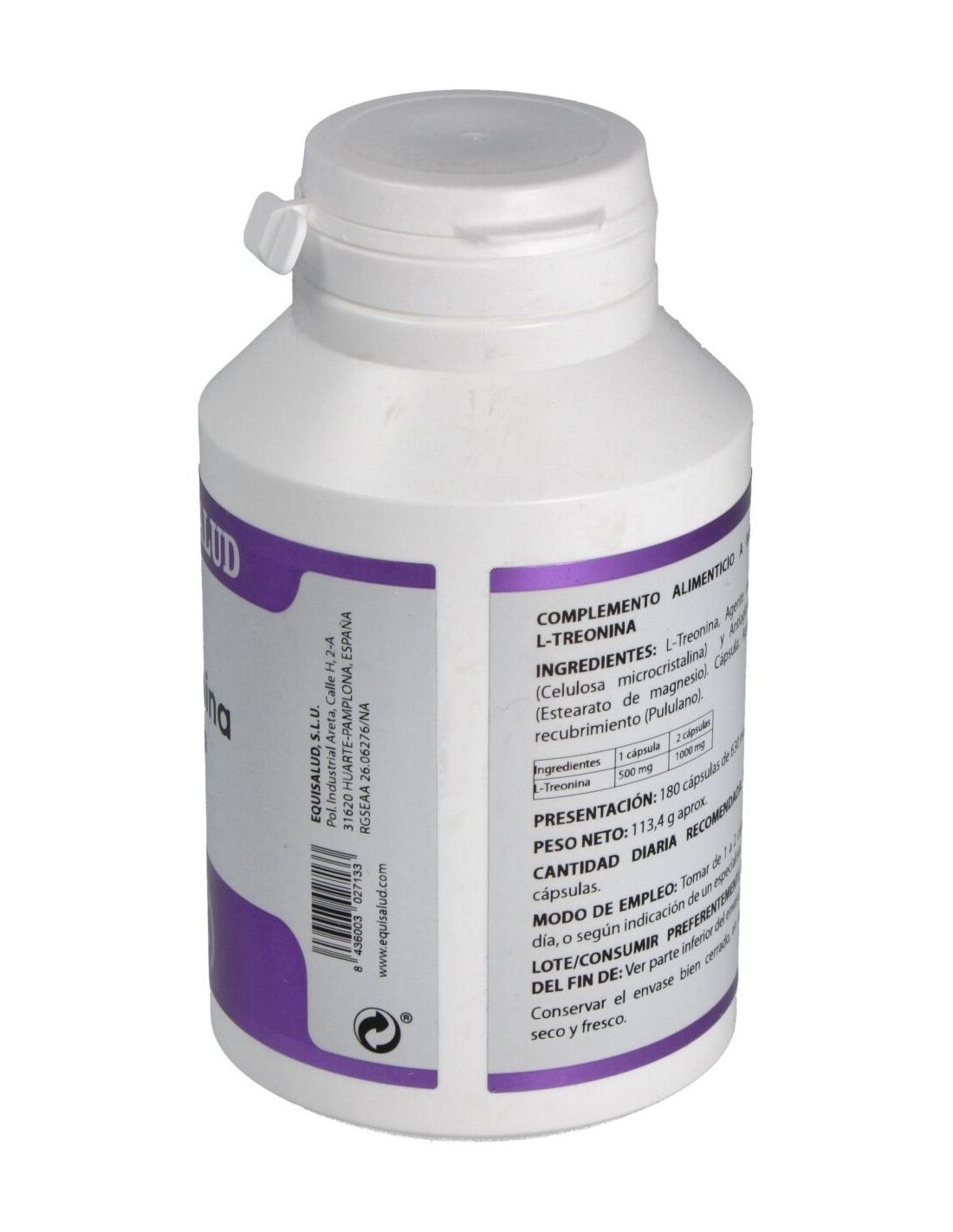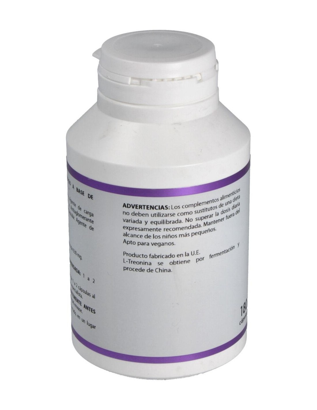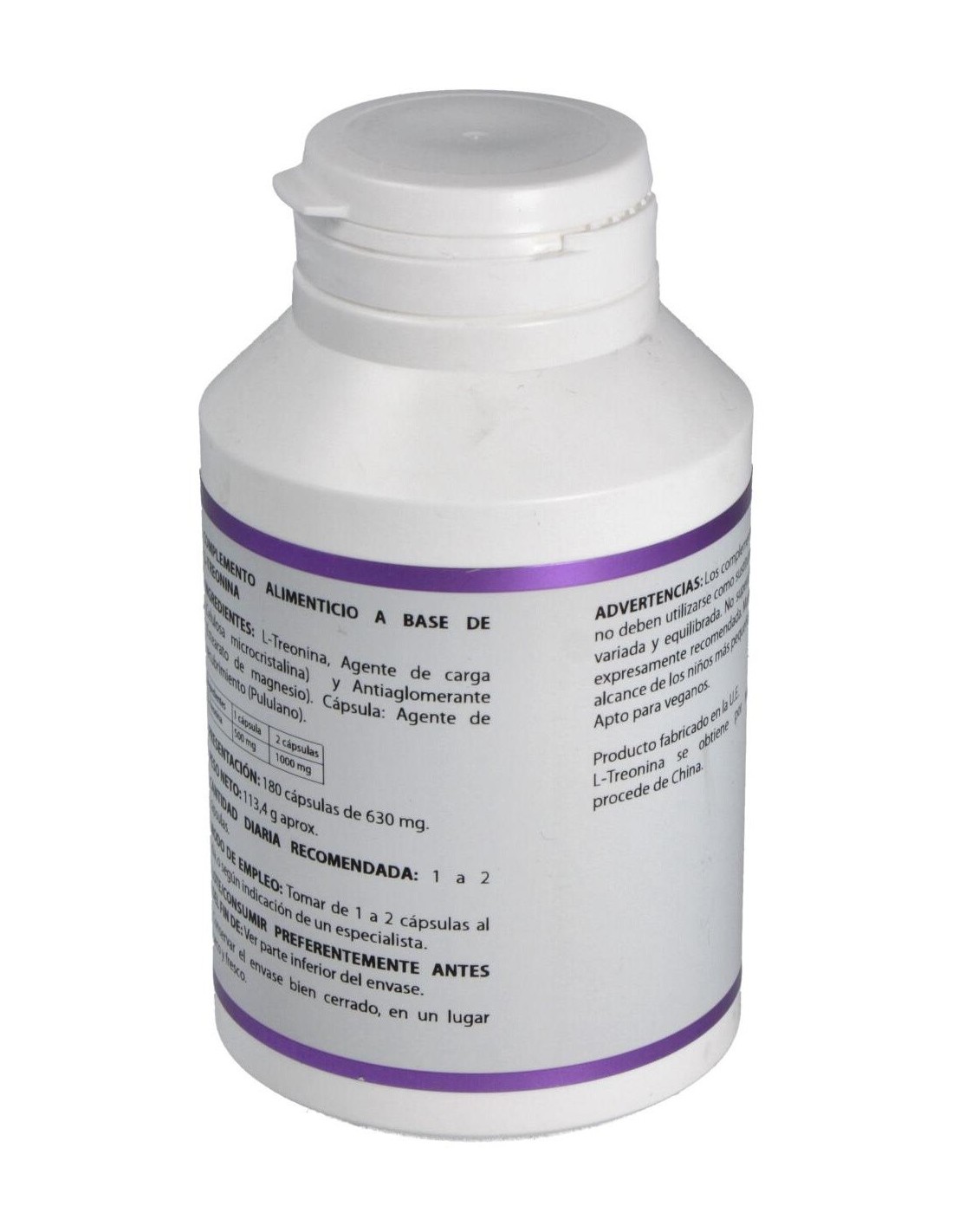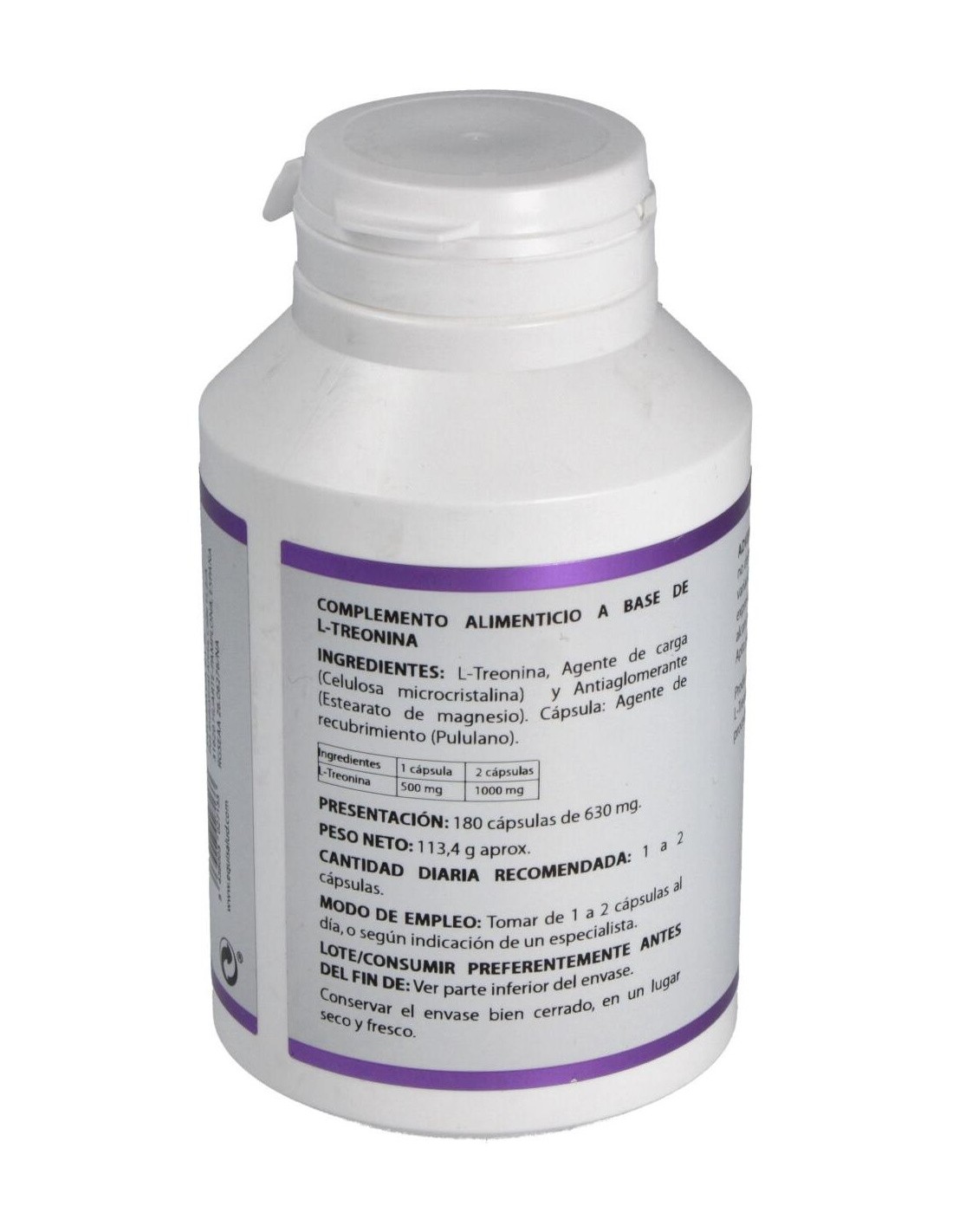 Composición por cápsula: L-treonina*, 500 mg. Envoltura: polisacárido de origen vegetal (pululano). No contiene gluten, ni almidón, ni transgénicos, ni colorantes. Apta para vegetarianos, diabéticos y pacientes con dietas restrictivas. * L-treonina obtenida por fermentación. País de origen: China.