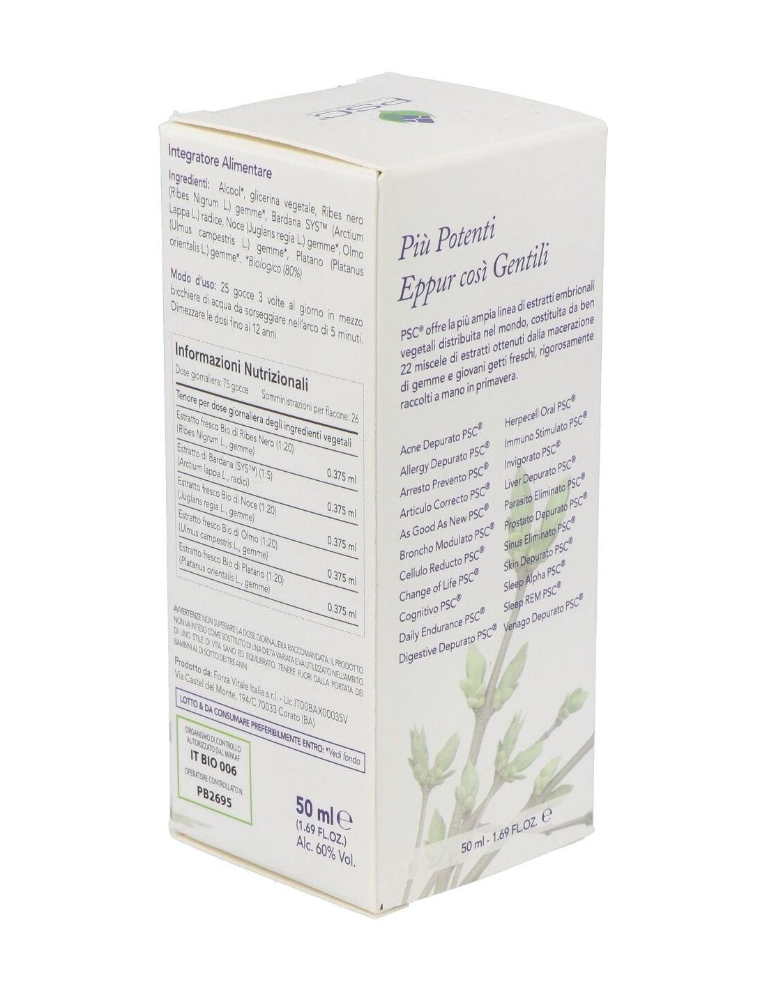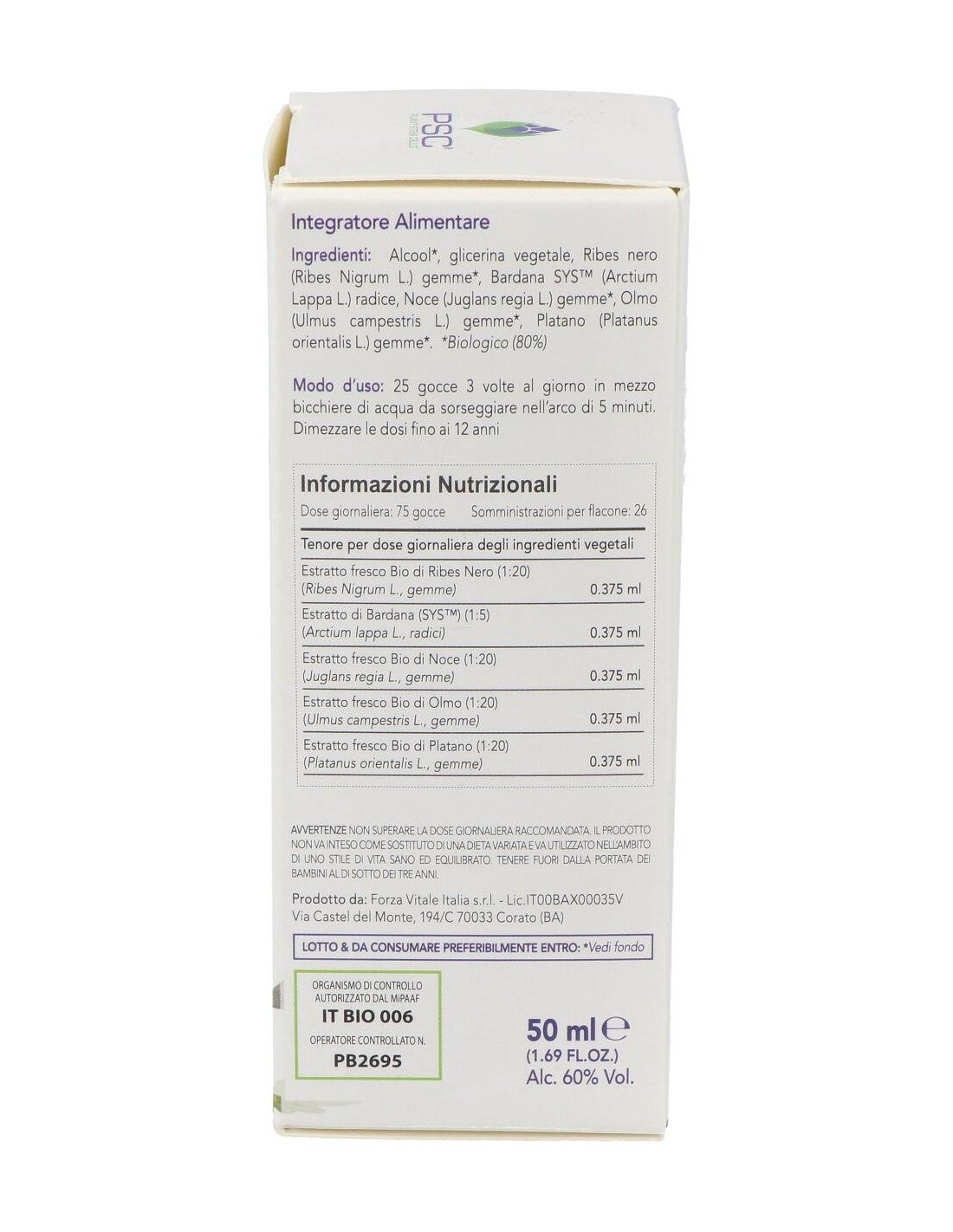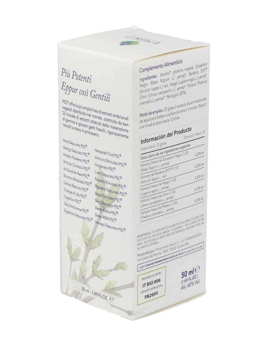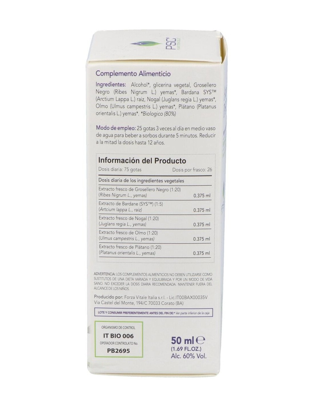 Alcohol Bio, glicerina vegetal, Grosellero negro Bio* (Ribes Nigrum L.) yemas, Bardana SYS (Arctium Lappa L.) rizoma, Nogal Bio* (Juglans regia L.) yemas, Olmo Bio* (Ulmus campestris L.) yemas, Plátano Bio* (Platanus orientalis L.) yemas.