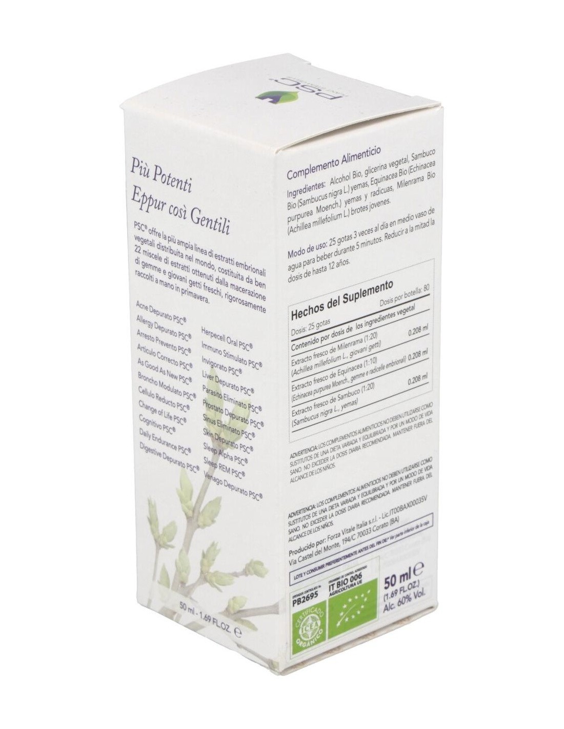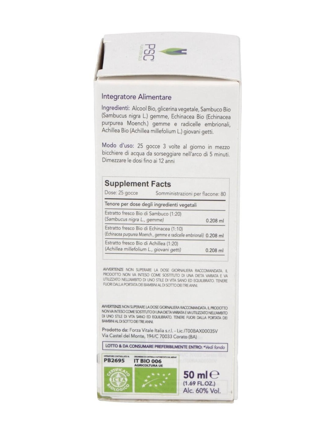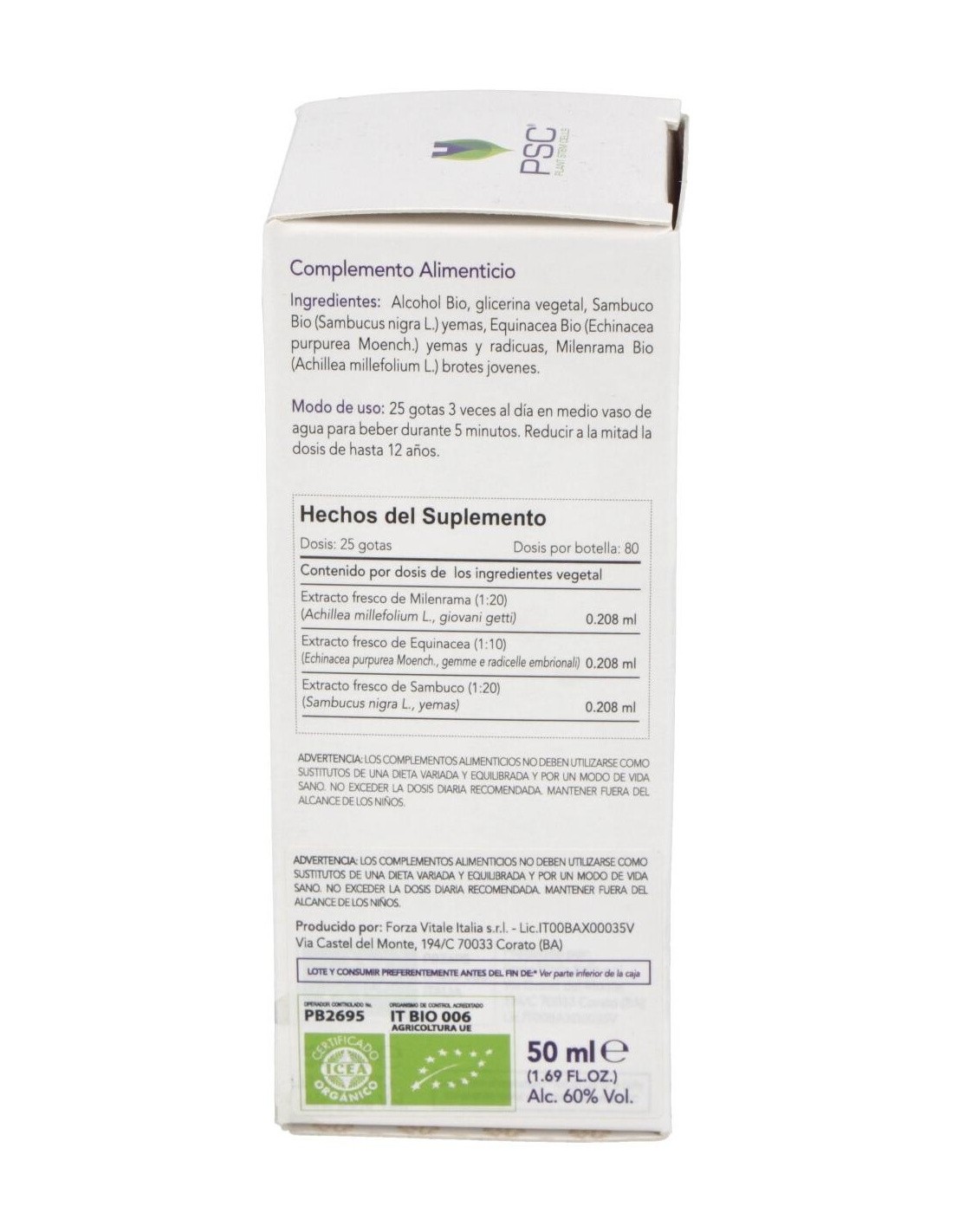 Alcohol bio, glicerol, Sambuco Bio PSC* (Sambucus nigra) yemas, Equinacea Bio PSC* (Equinacea purpurea) raízlle, Aquilea Bio PSC* (Achillea millefolium) jóvenes brotes.