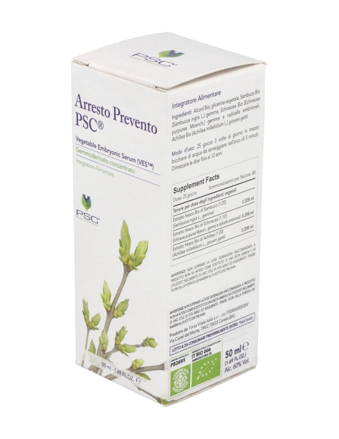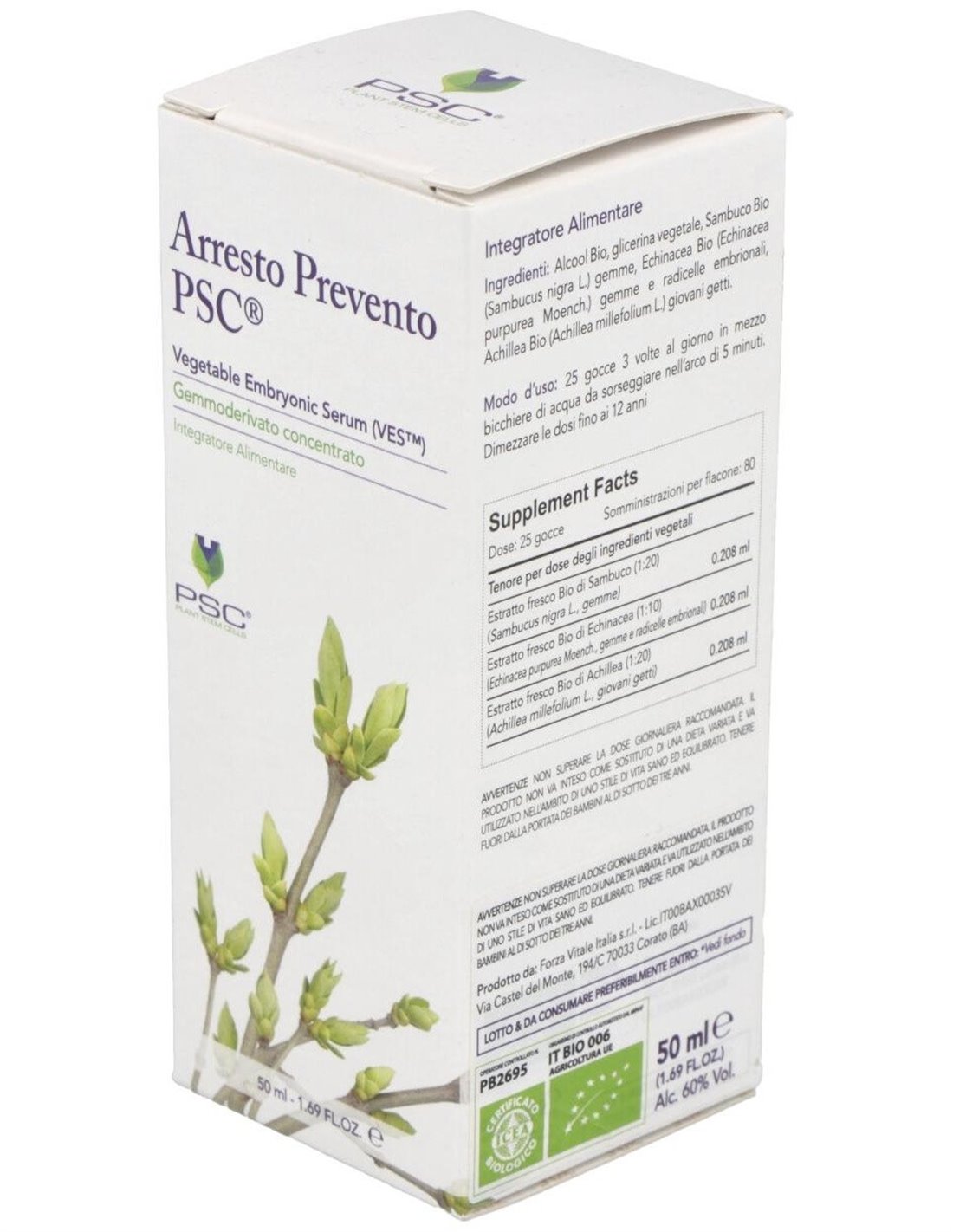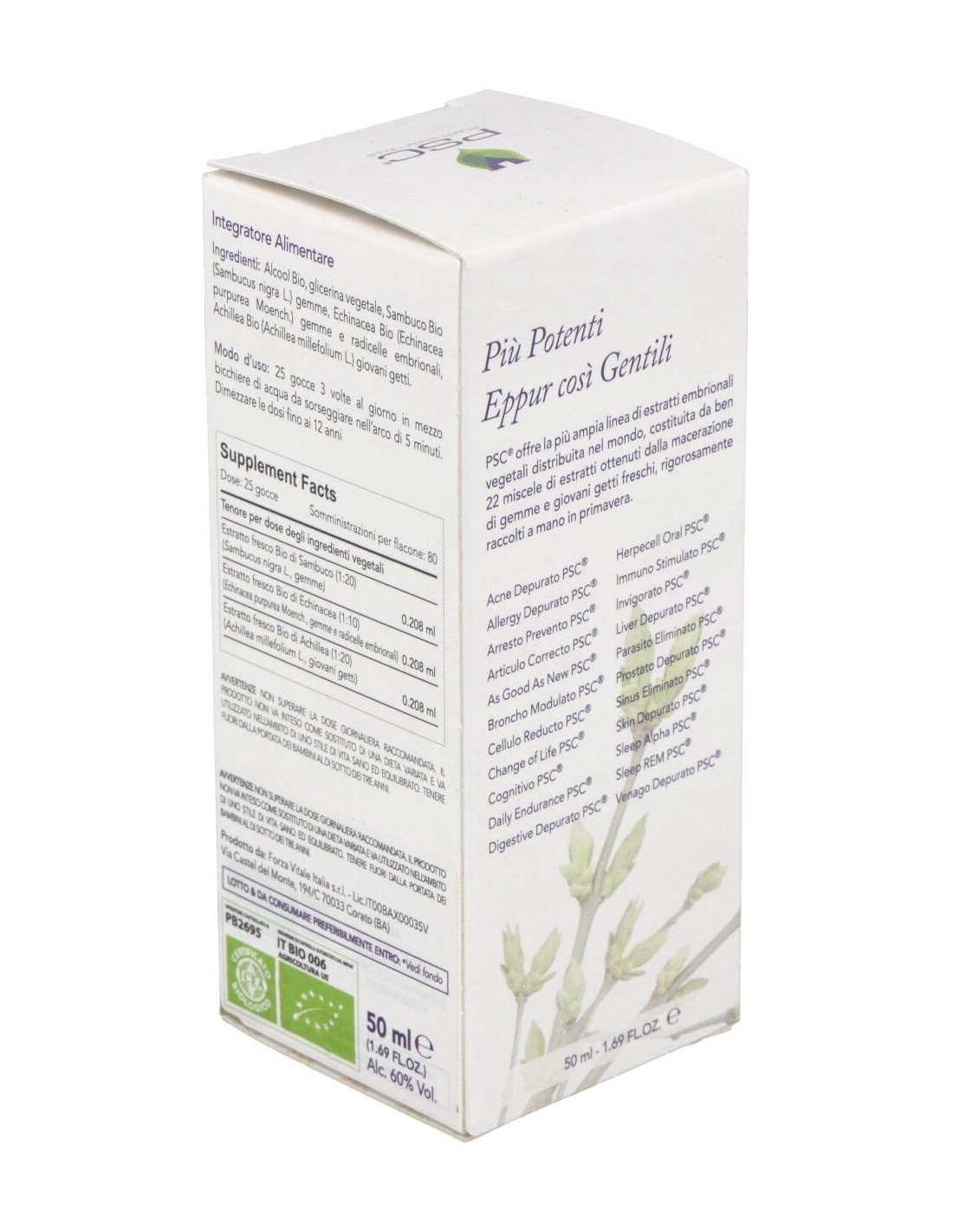 Alcohol bio, glicerol, Sambuco Bio PSC* (Sambucus nigra) yemas, Equinacea Bio PSC* (Equinacea purpurea) raízlle, Aquilea Bio PSC* (Achillea millefolium) jóvenes brotes.
