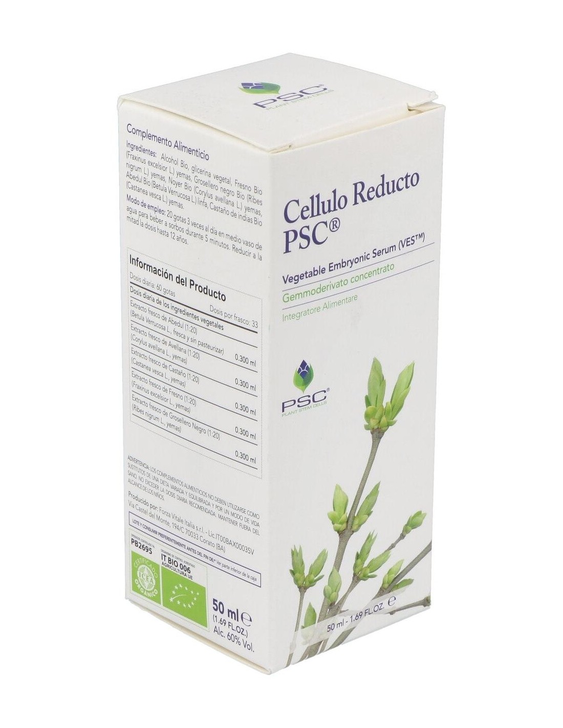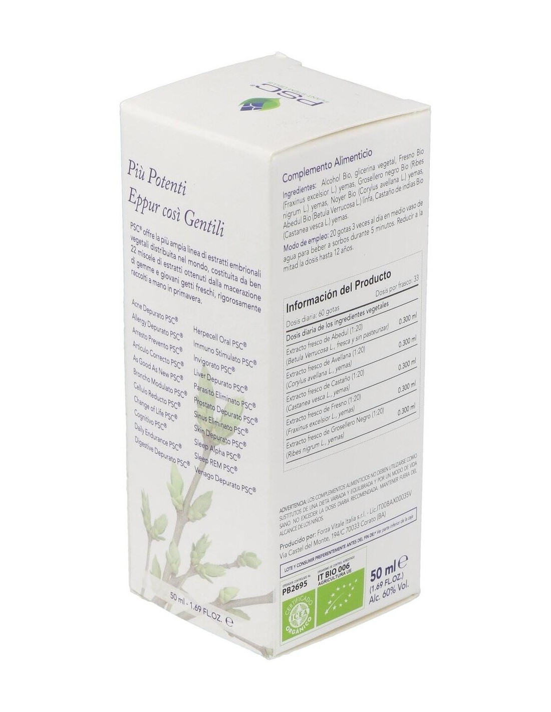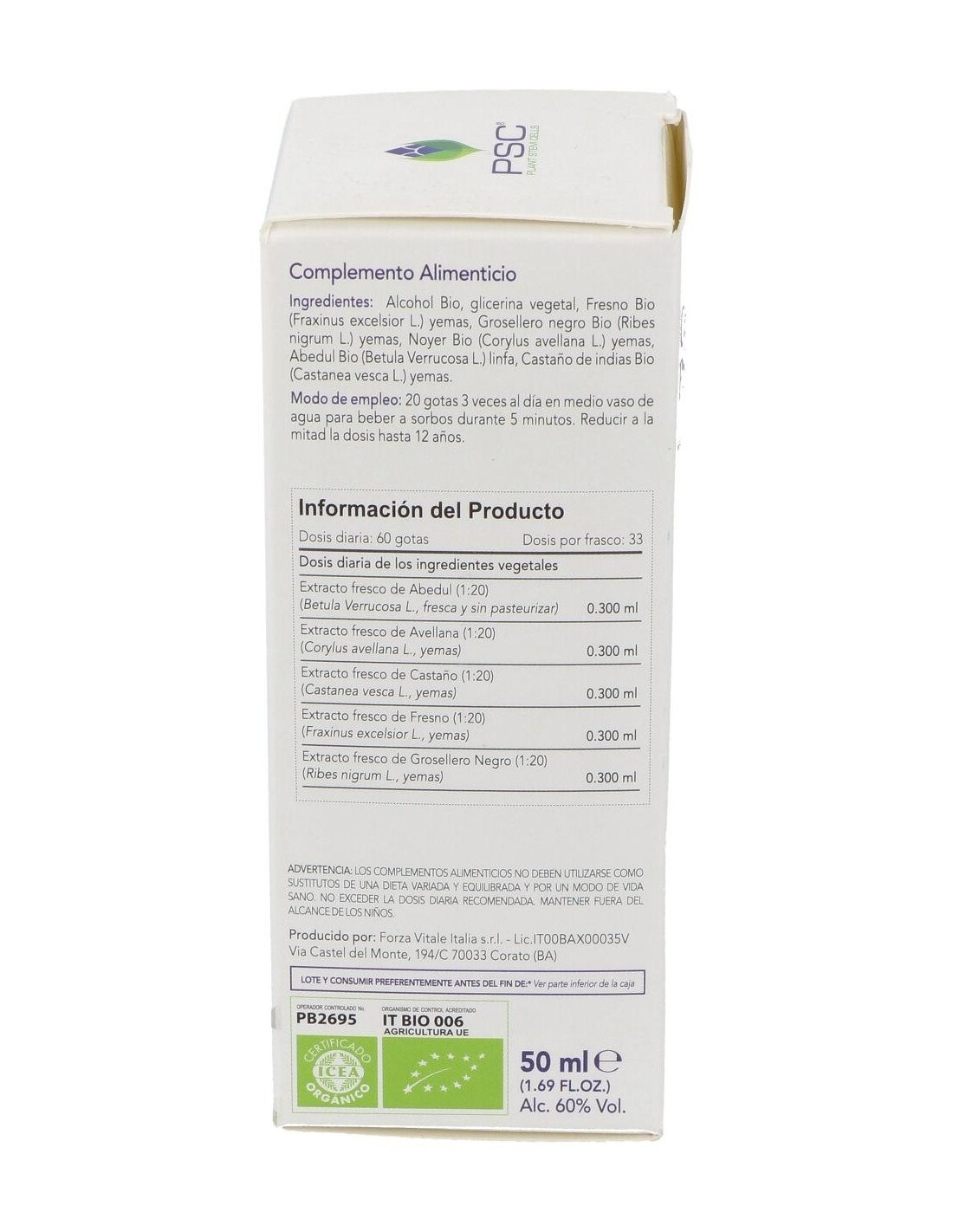 Ingredientes:Alcohol Bio, glicerol, Abedul Bio PSC (Betula pendula var. verrucosa) linfa, Grosellero negro Bio PSC (Ribes nigrum) yemas, Fresno Bio PSC (Fraxinus excelsior) yemas, Castaño Bio PSC (Castanea vesca) yemas, Avellano Bio PSC (Corylus avellana) yemas. *PSC (Plant Stem Cells) células estaminales vegetales. Ingredientes activos por dosis diaria (60 gotas):