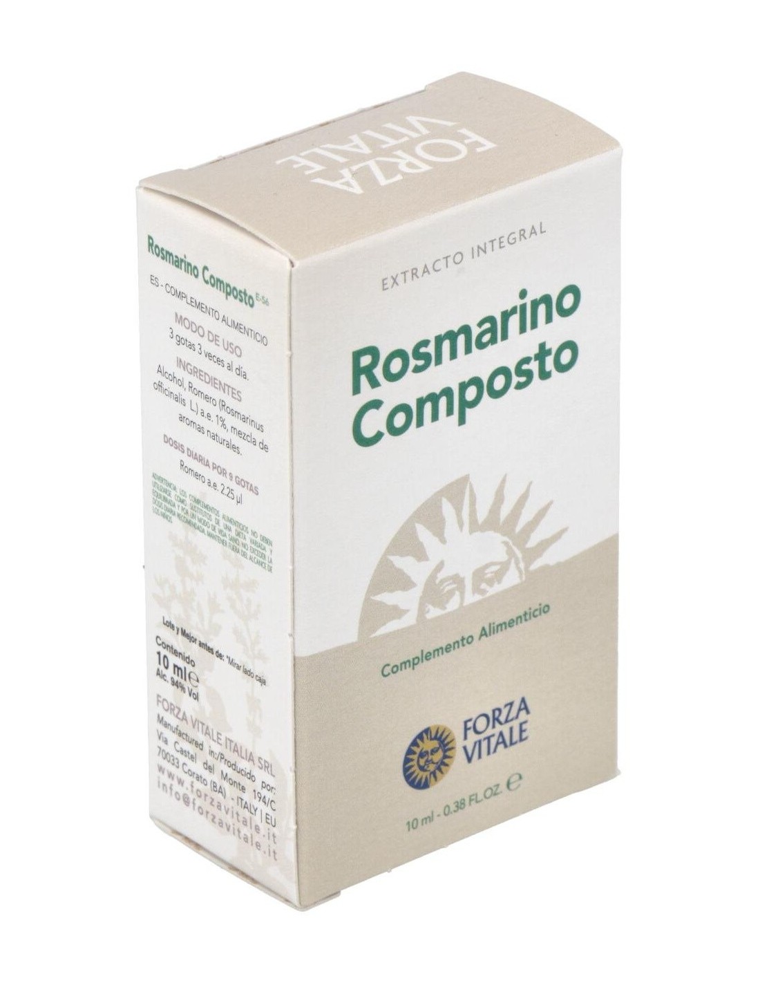 El aceite esencial de Romero tiene propiedades digestivas y colecistocinéticas, conteniendo el elemento Tierra.Ingredientes:Alcohol, Romero (Rosmarinus officinalis) a.e. 1%, Solidago (Solidago virga-aurea) sumidades, mezcla de aromas naturales. Ingredientes activos por dosis diaria (9 gotas):2,25 mcl de aceite esencial de romero.Modo de empleo:Tomar 3 gotas 3 veces al día vía sublingual.Presentación:Bote de 10 ml.