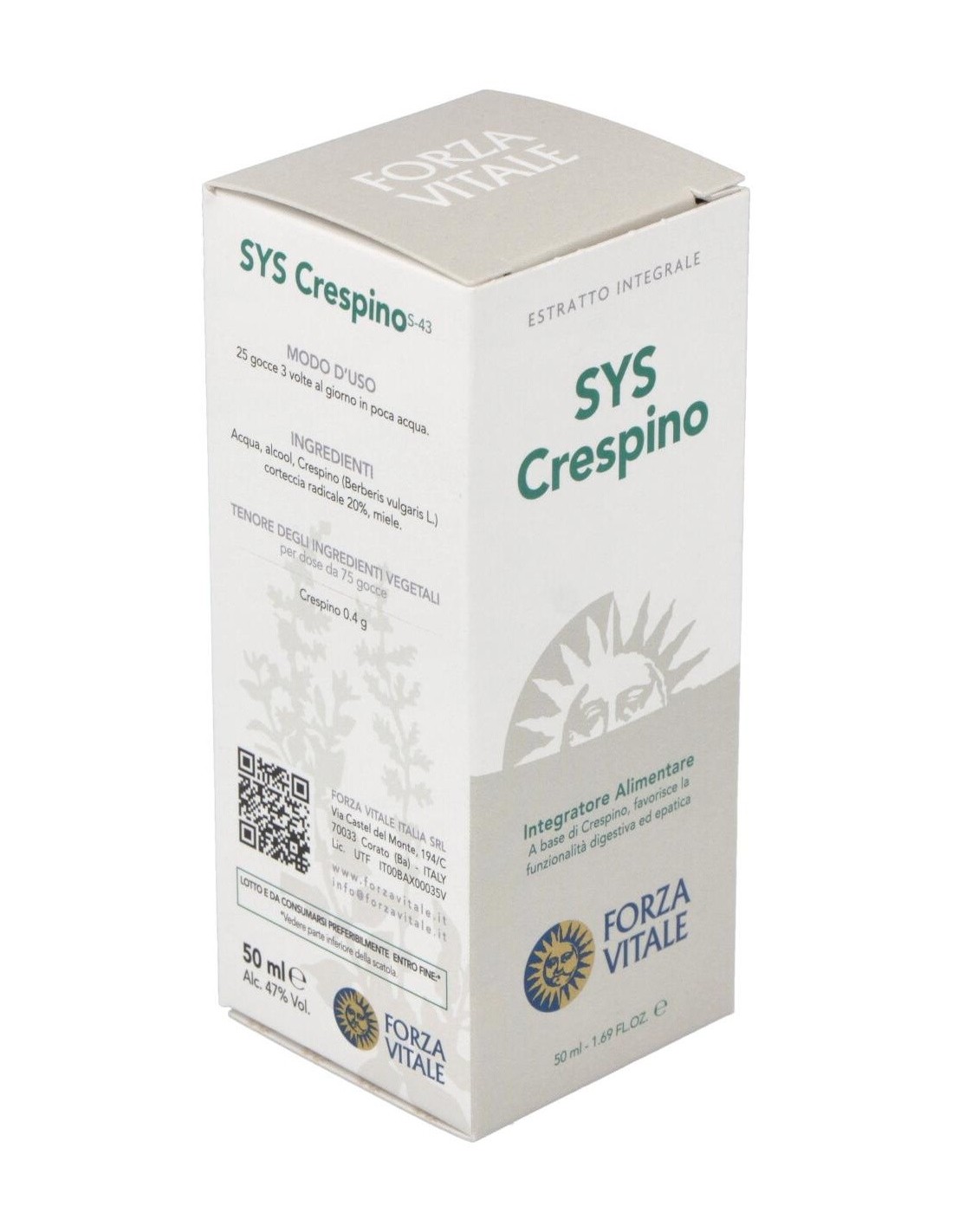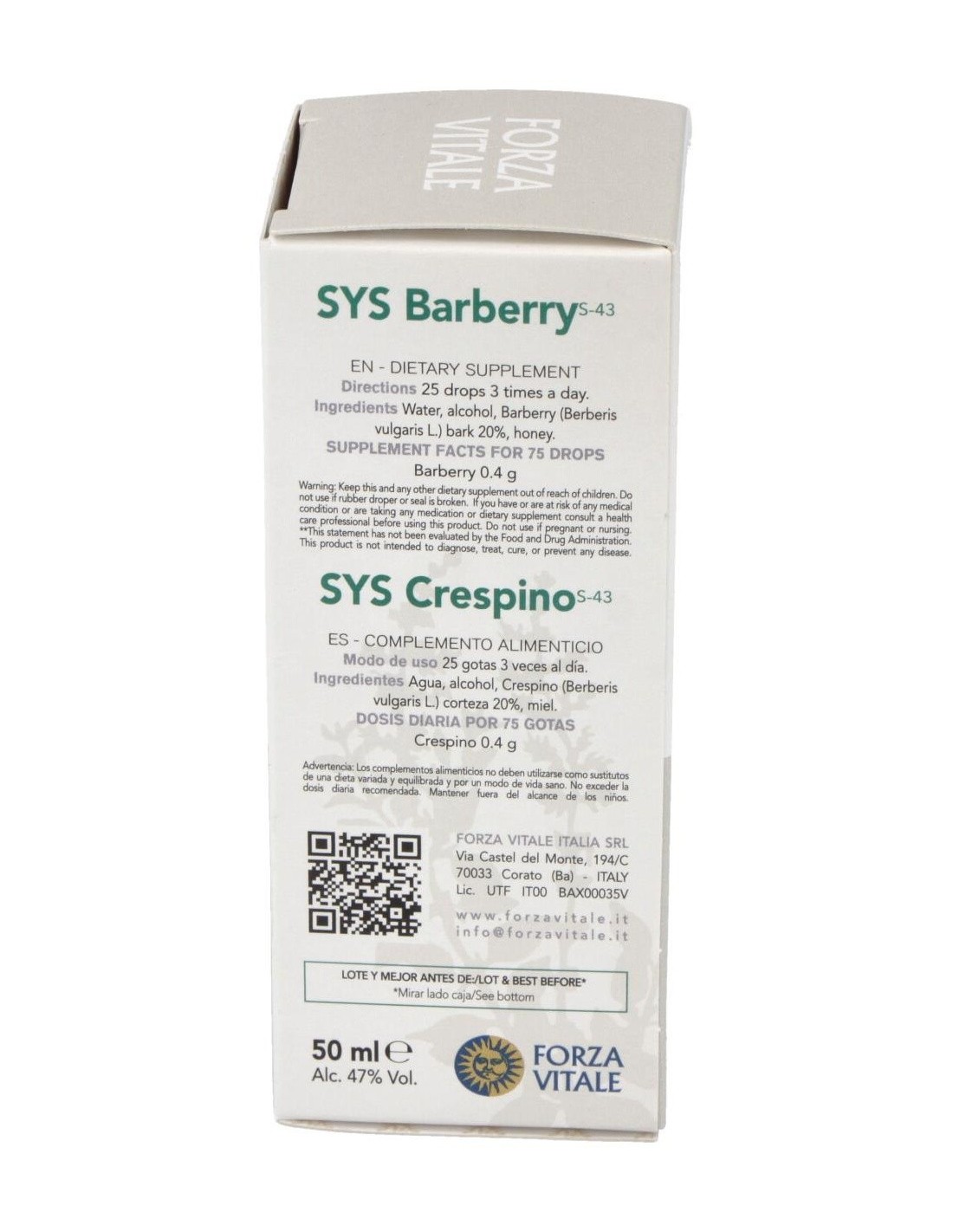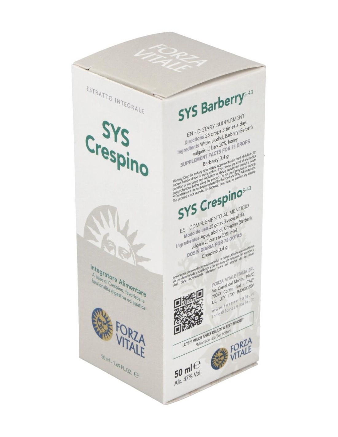 Es un arbusto espinoso, alto hasta tres metros, con hojas pequeñas y lucidas, bordadas por pestañas espinadas. Las sustancias contenidas por el crespino son: berbamina, berberina, berberubina, columbamina, hidrastina, yatrorizina, oxicantina, palmatina. Actúa como vasodilatador, disminuye la frecuencia cardiaca, estimula las funciones intestinales, reduce la vasoconstricción bronquial, mata las bacterias de la piel. No tomar durante la gestación y en trastornos crónicos del tramo gastrointestinal, como ulcera duodenal o gástrica, reflujo esofageo, colitis ulcerosas, diverticolitis. Ingredientes:Agua, Alcohol, Berberis (Berberis vulgaris) corteza de raíz 20%, miel. Ingredientes activos por dosis diaria (2 ml):0,4 gramos de berberis. Modo de empleo:Adultos: Tomar 25 gotas 3 veces al día en poca agua o vía sublingual.Niños hasta 12 años: Tomar 10 gotas 3 veces al día en poca agua o en zumo de fruta. Presentación:Frasco de 50 ml.