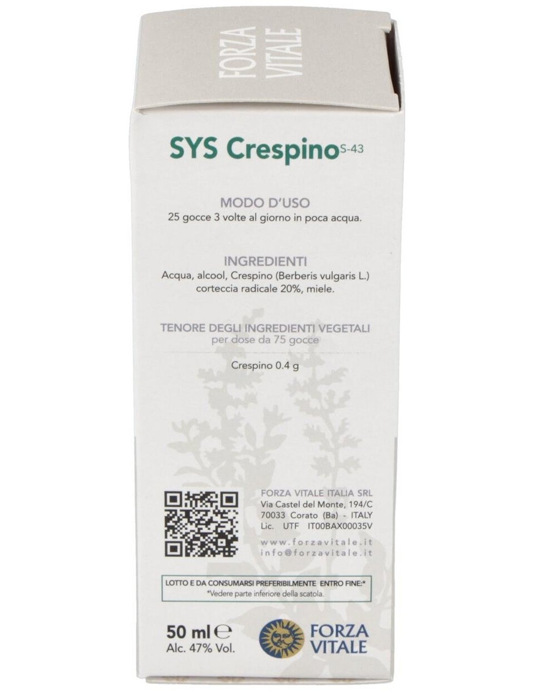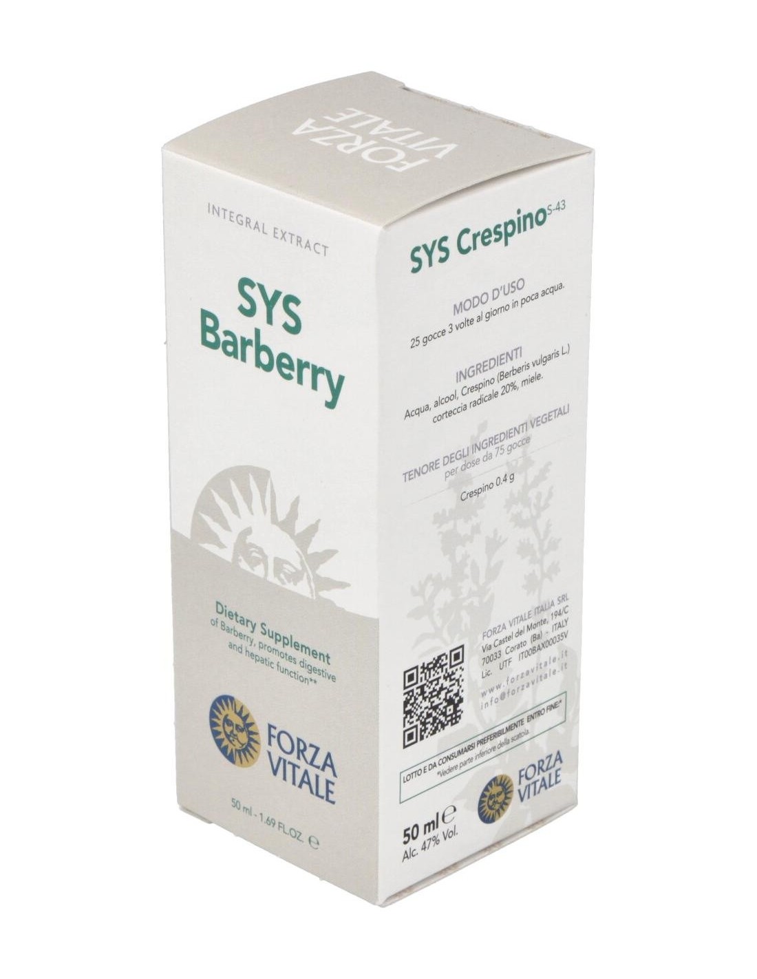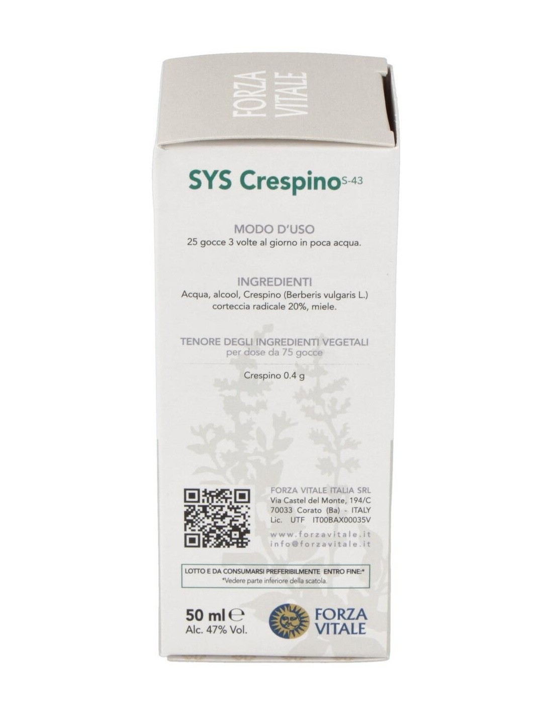 Es un arbusto espinoso, alto hasta tres metros, con hojas pequeñas y lucidas, bordadas por pestañas espinadas. Las sustancias contenidas por el crespino son: berbamina, berberina, berberubina, columbamina, hidrastina, yatrorizina, oxicantina, palmatina. Actúa como vasodilatador, disminuye la frecuencia cardiaca, estimula las funciones intestinales, reduce la vasoconstricción bronquial, mata las bacterias de la piel. No tomar durante la gestación y en trastornos crónicos del tramo gastrointestinal, como ulcera duodenal o gástrica, reflujo esofageo, colitis ulcerosas, diverticolitis. Ingredientes:Agua, Alcohol, Berberis (Berberis vulgaris) corteza de raíz 20%, miel. Ingredientes activos por dosis diaria (2 ml):0,4 gramos de berberis. Modo de empleo:Adultos: Tomar 25 gotas 3 veces al día en poca agua o vía sublingual.Niños hasta 12 años: Tomar 10 gotas 3 veces al día en poca agua o en zumo de fruta. Presentación:Frasco de 50 ml.